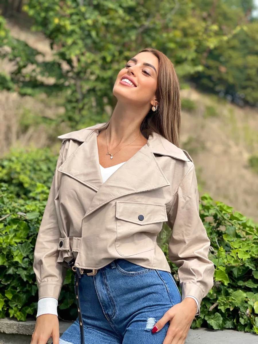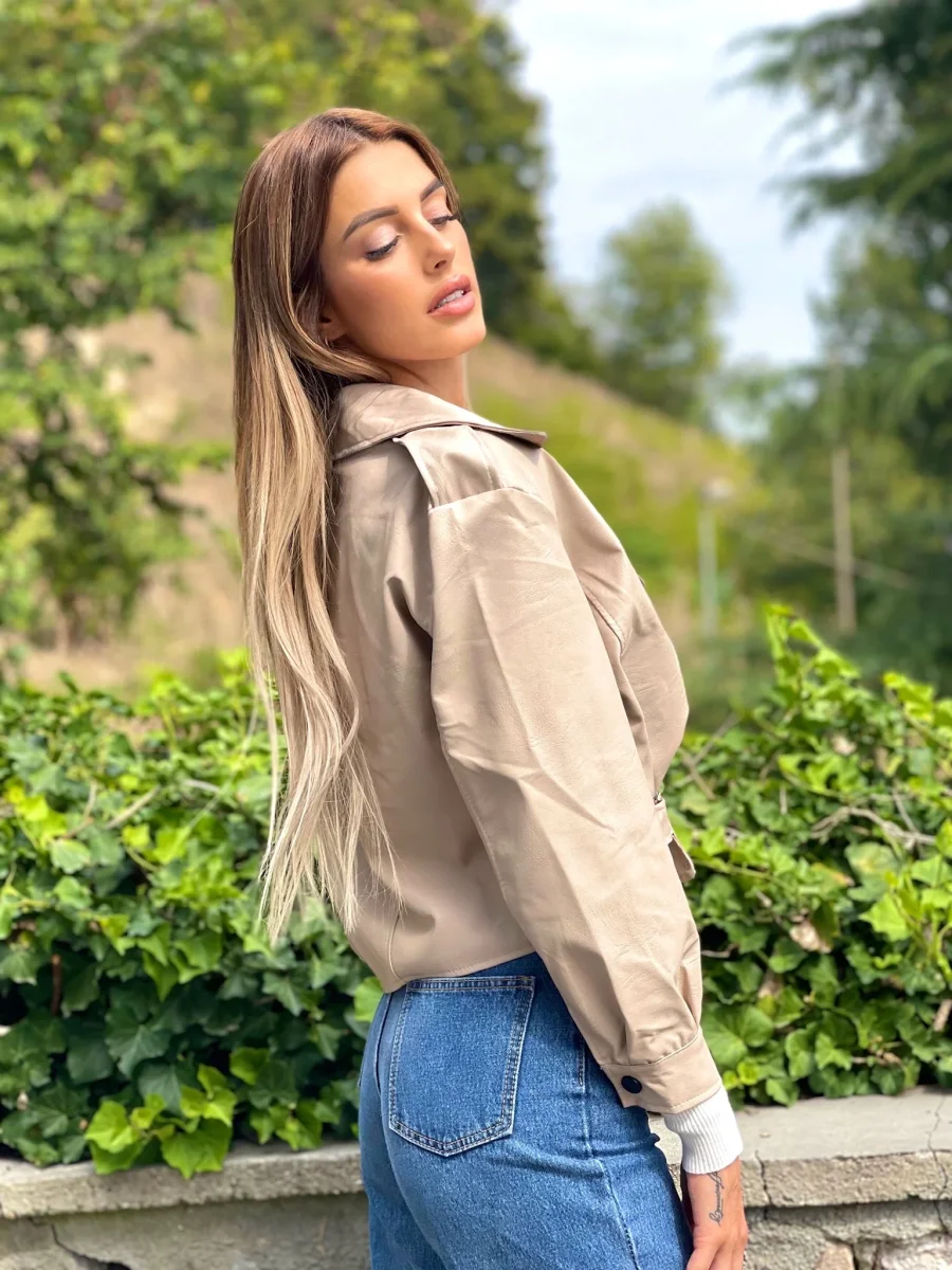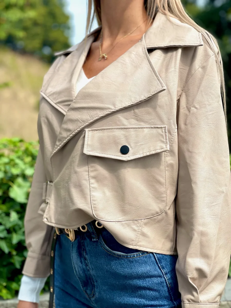 Giacca in ecopelle con chiusura a portafoglio e fibbia. Tasche in evidenza. Taglia unica taglio over