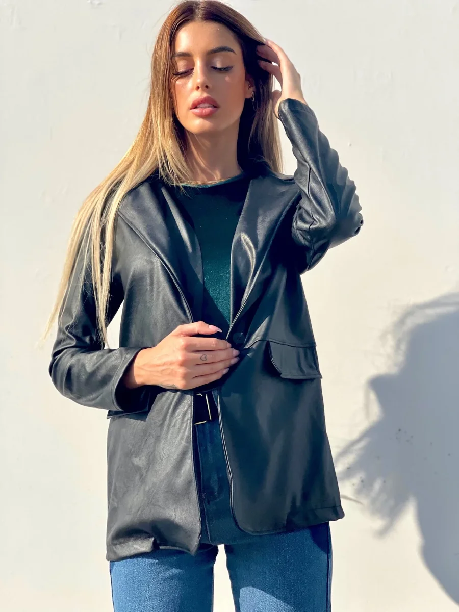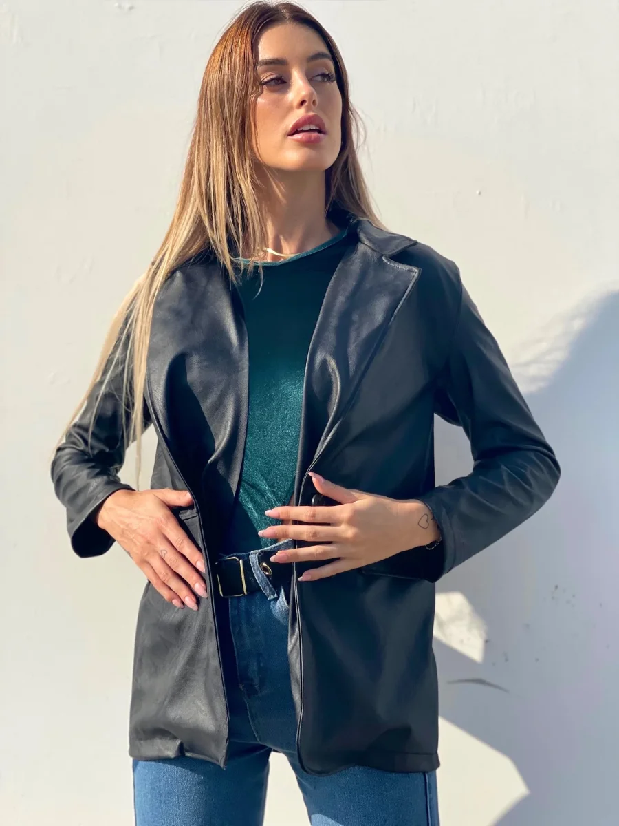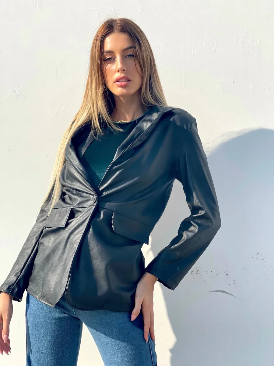 Giacca in eco-pelle con chiusura con bottone, la giacca include una cintura.