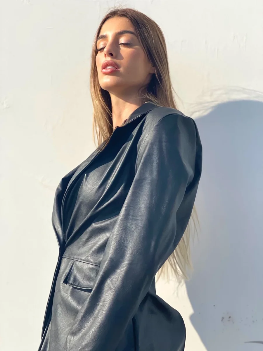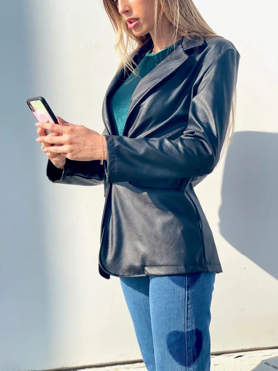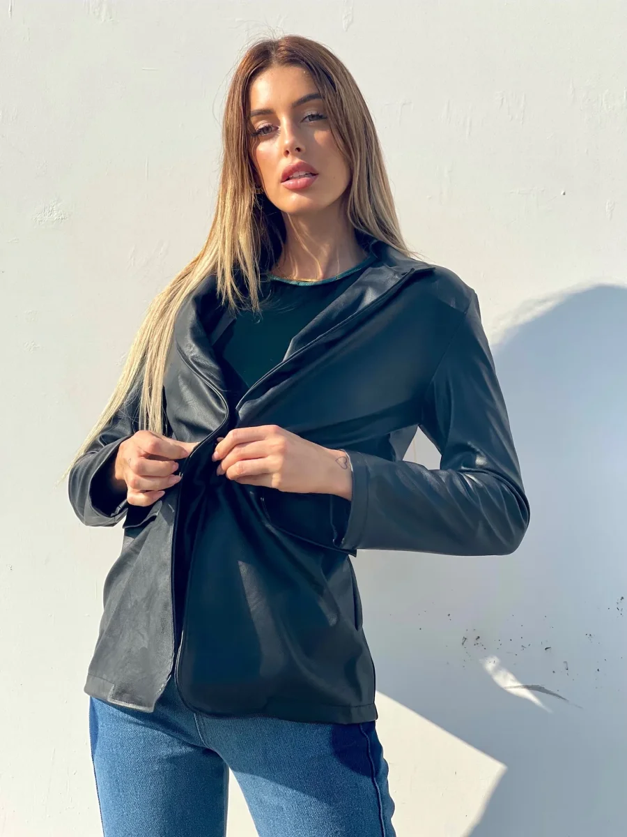 Giacca in eco-pelle con chiusura con bottone, la giacca include una cintura.
