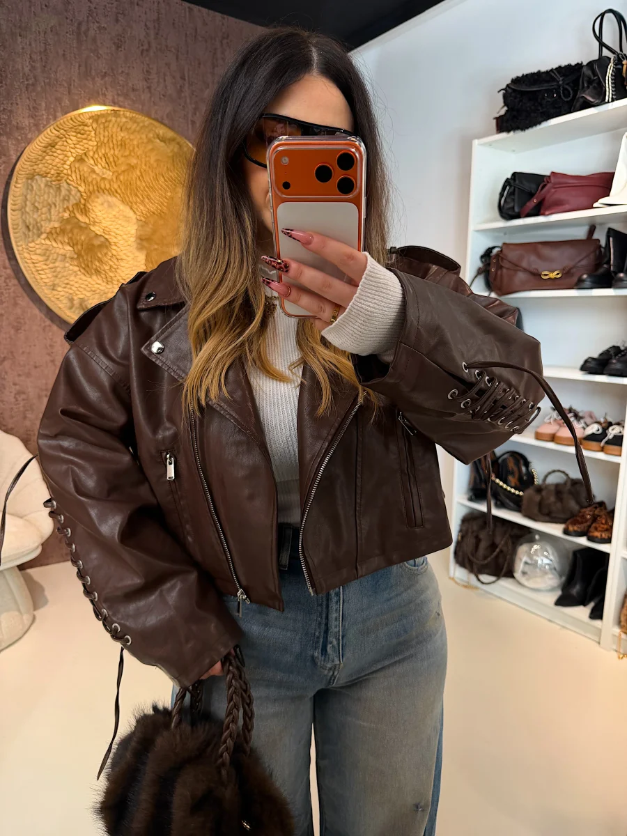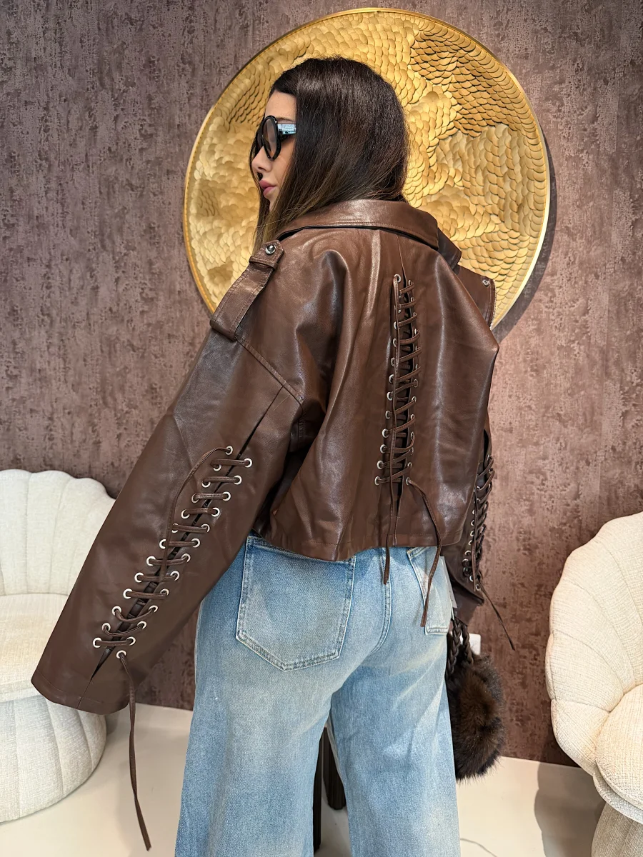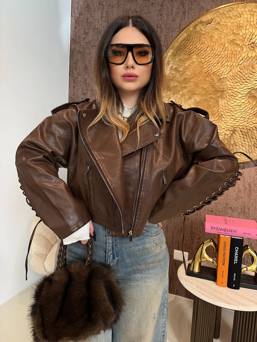 - lacci intrecciati sul retro e sulle maniche, che donano un tocco grintoso e fashion