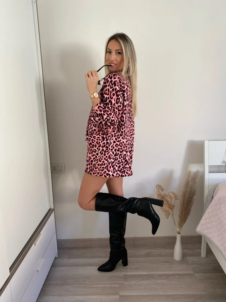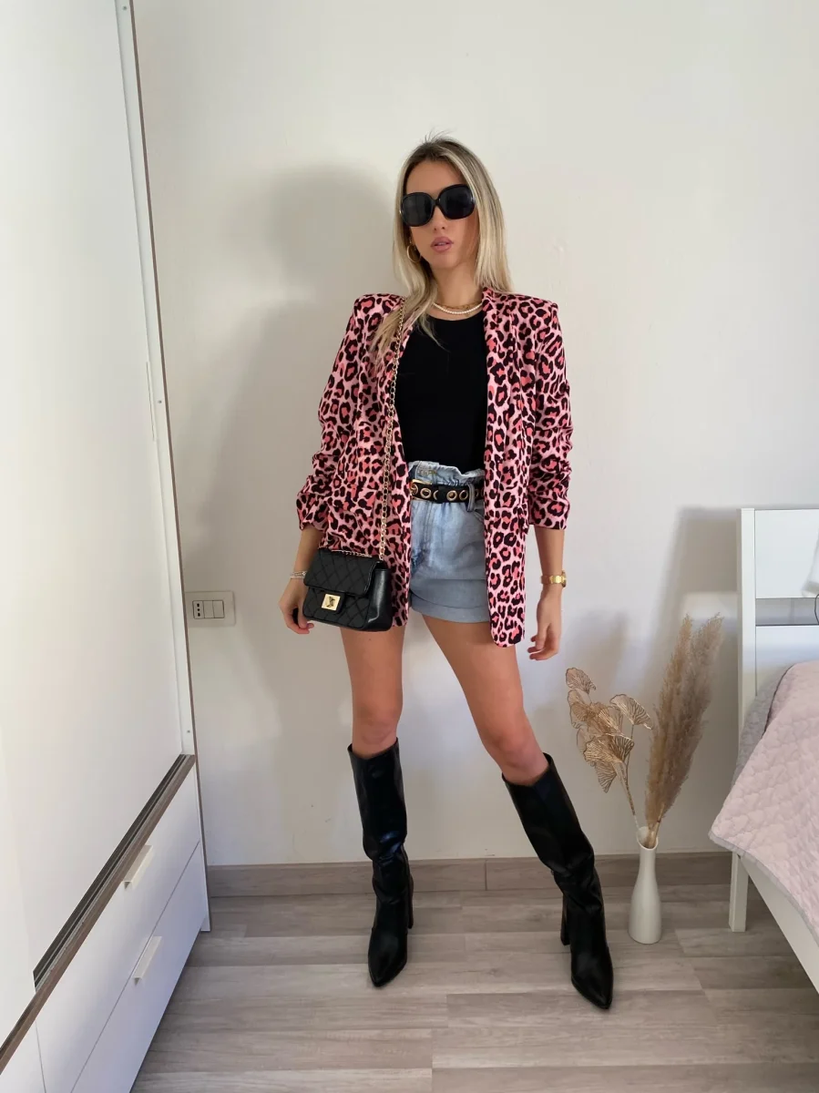 Giacca donna foderata in trama maculata rosa e nera. Manica leggermente arricciata.