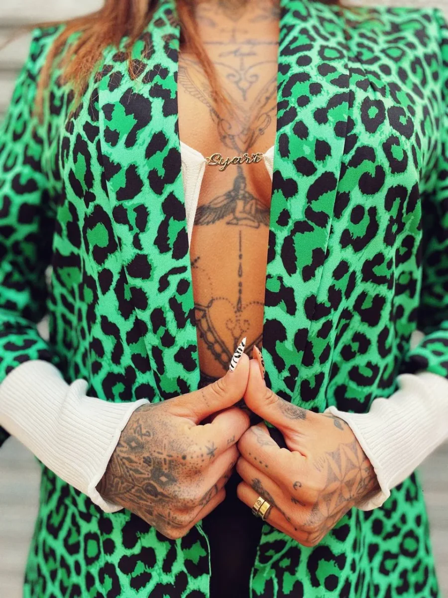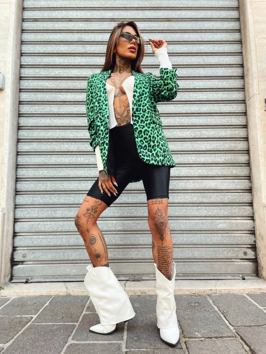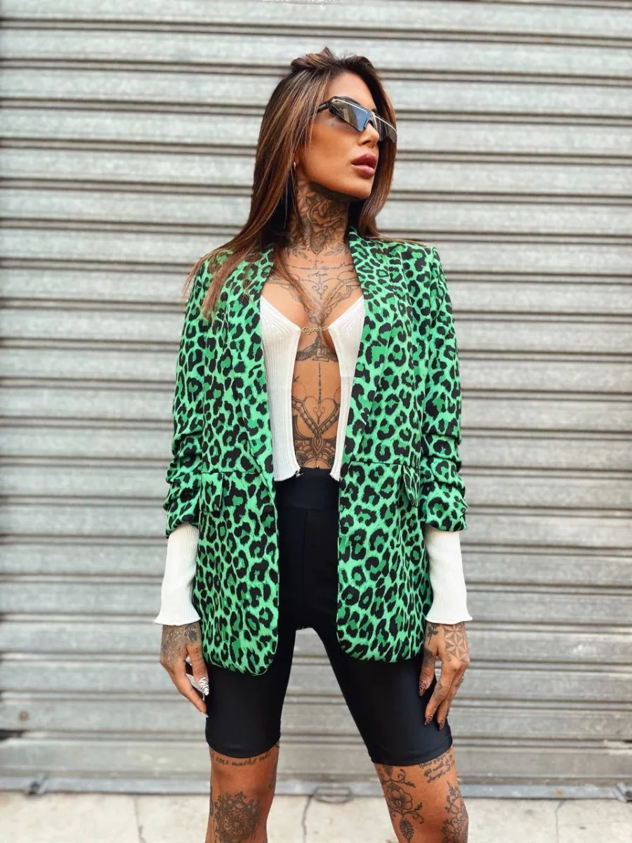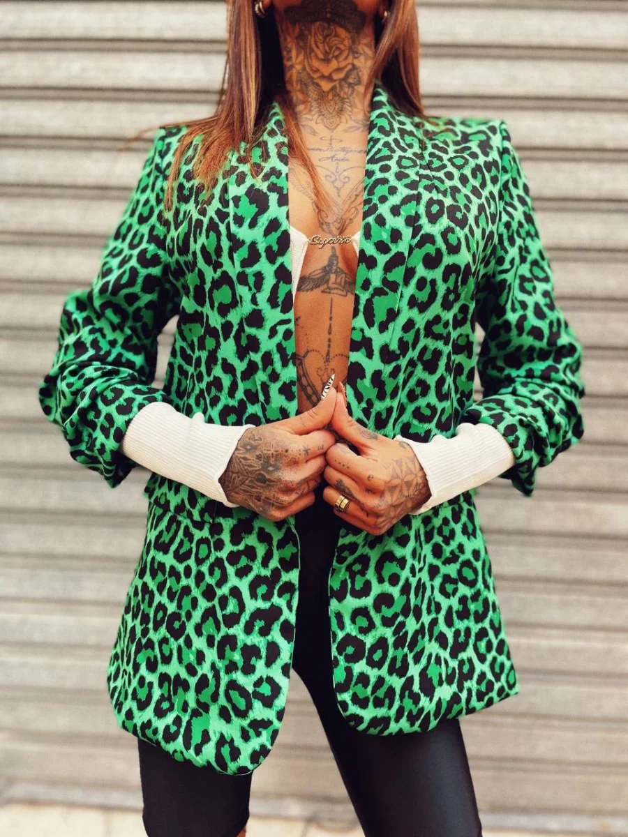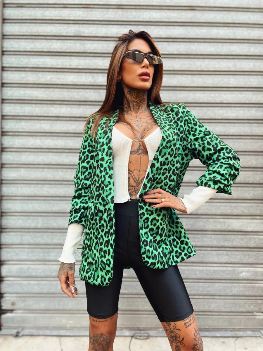 Giacca donna foderata in trama maculata verde e nera. Manica leggermente arricciata.