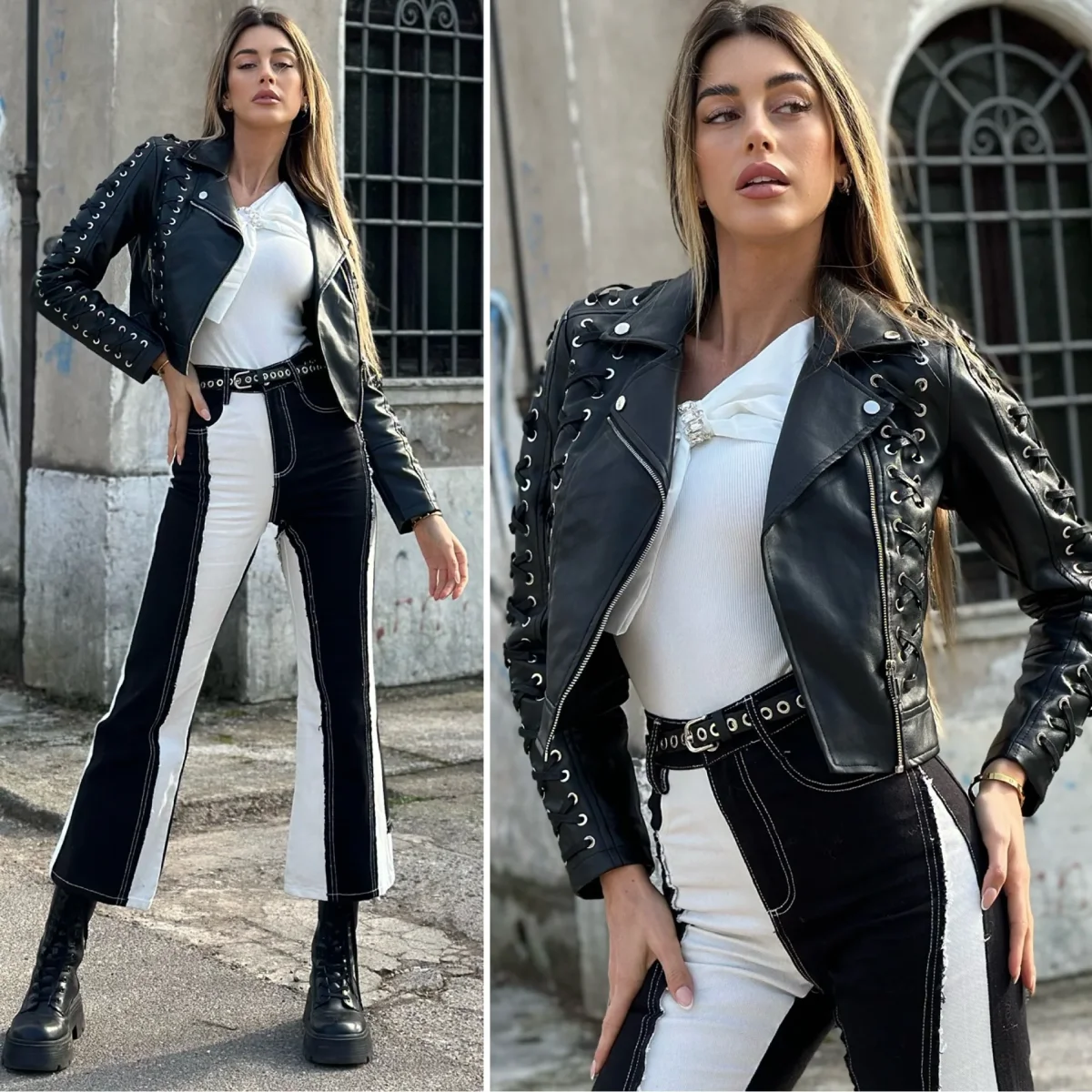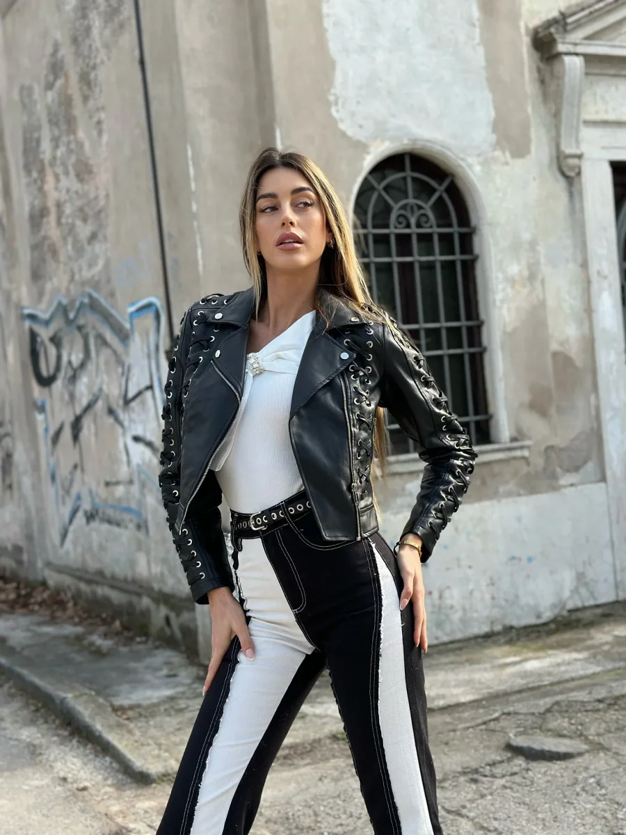 Giacca in ecopelle foderata con lacci in dettaglio.