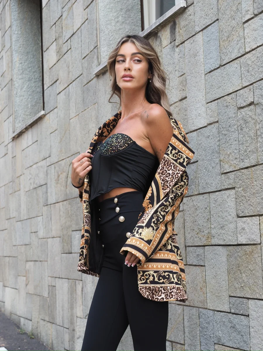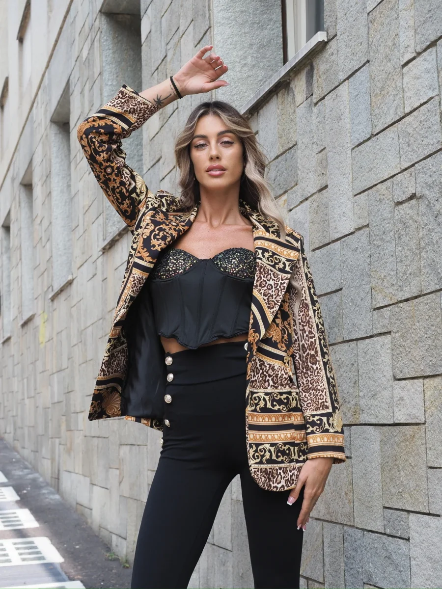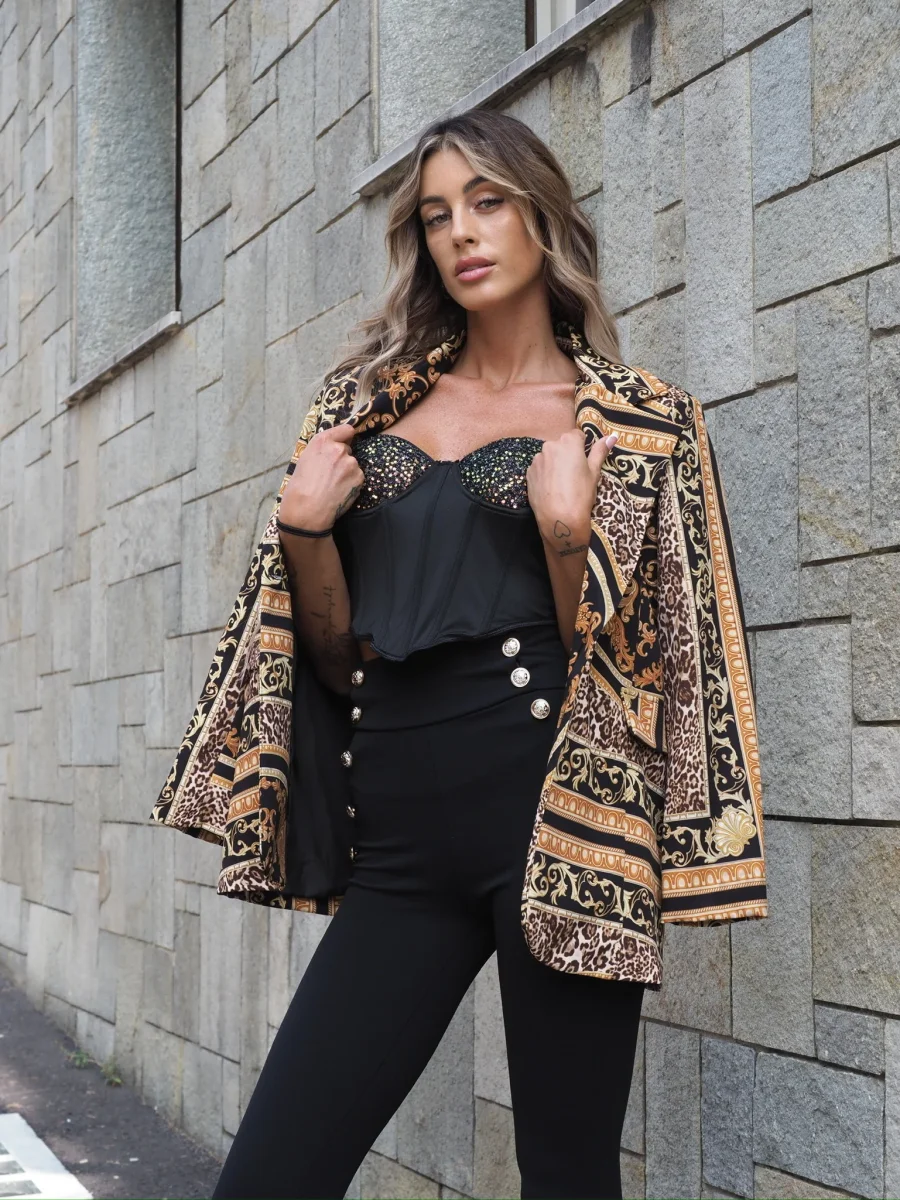 Giacca over a fantasia con fodera e coppe. Chiusura con bottone.