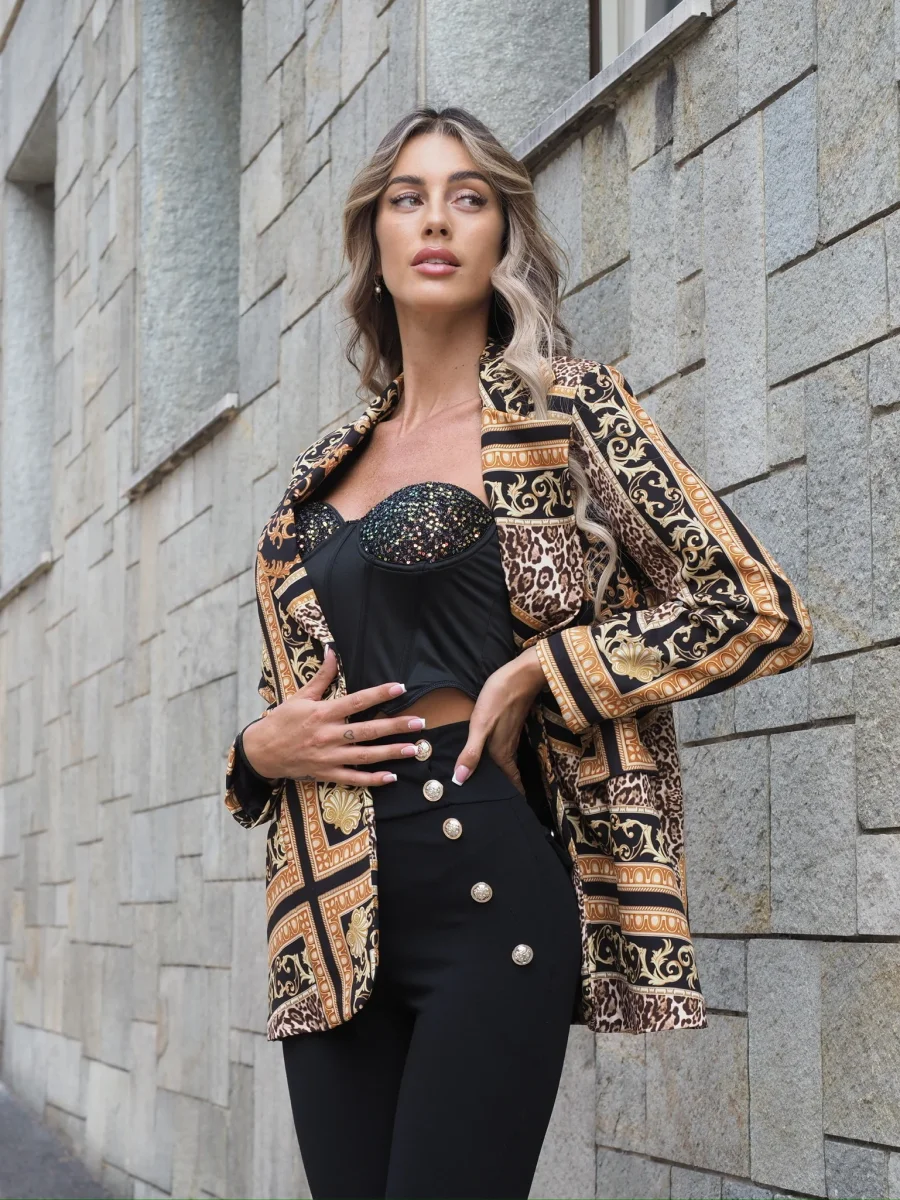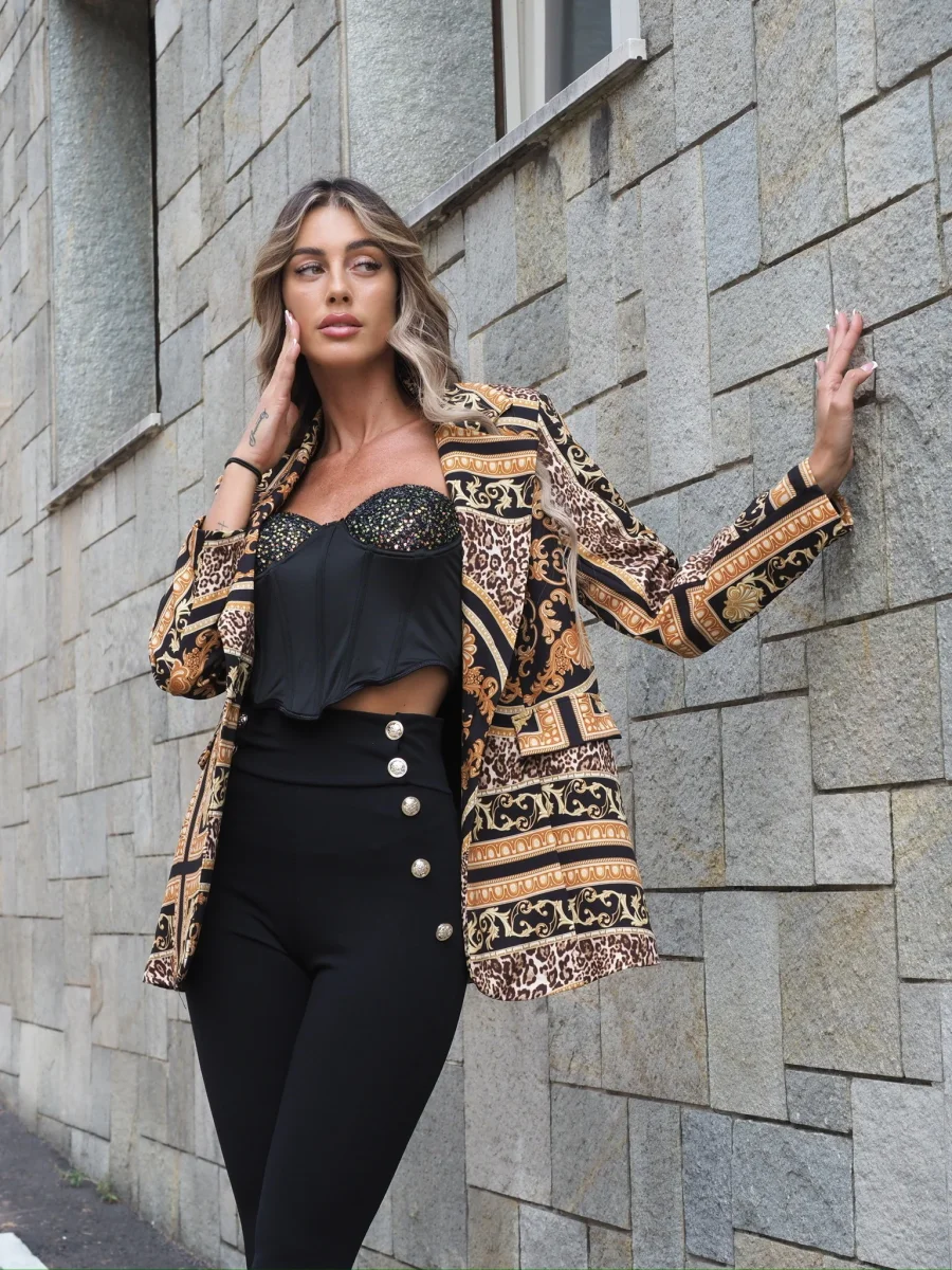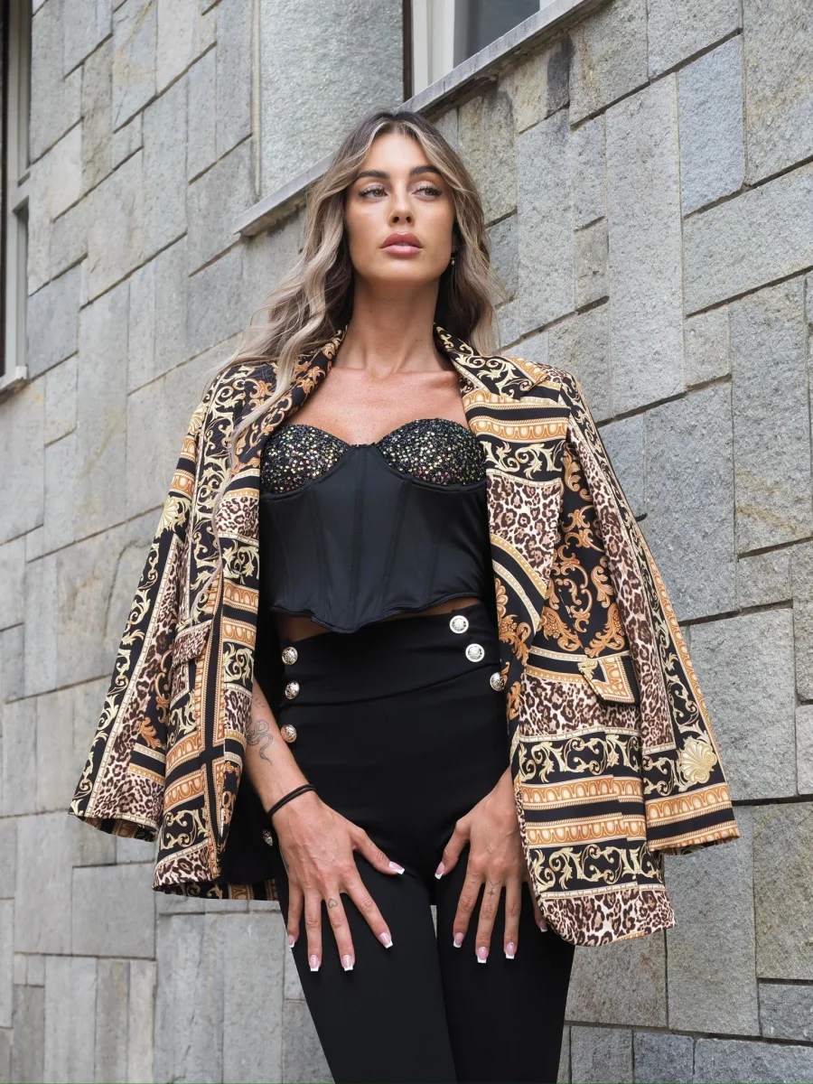 Giacca over a fantasia con fodera e coppe. Chiusura con bottone.