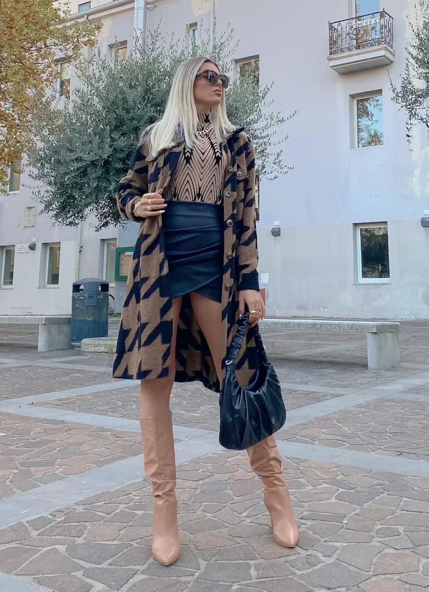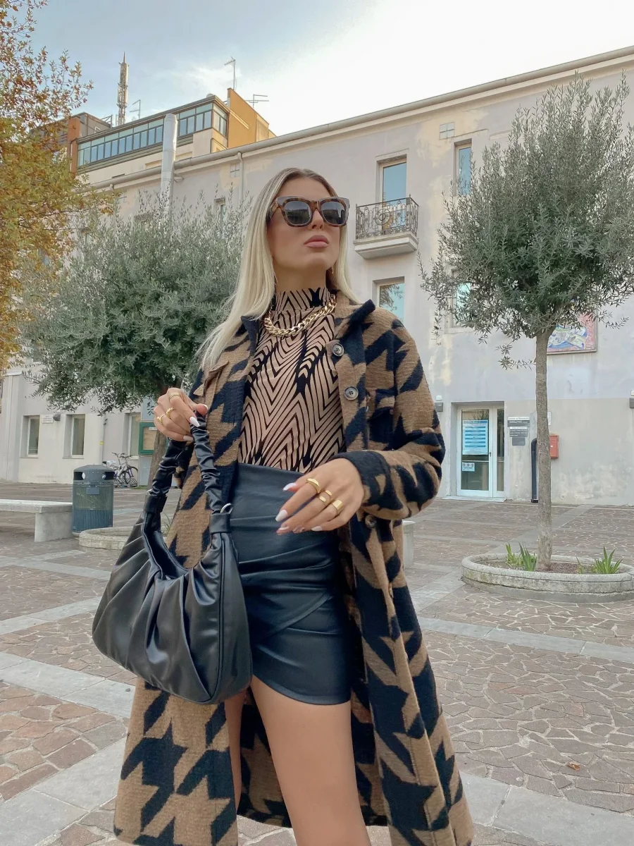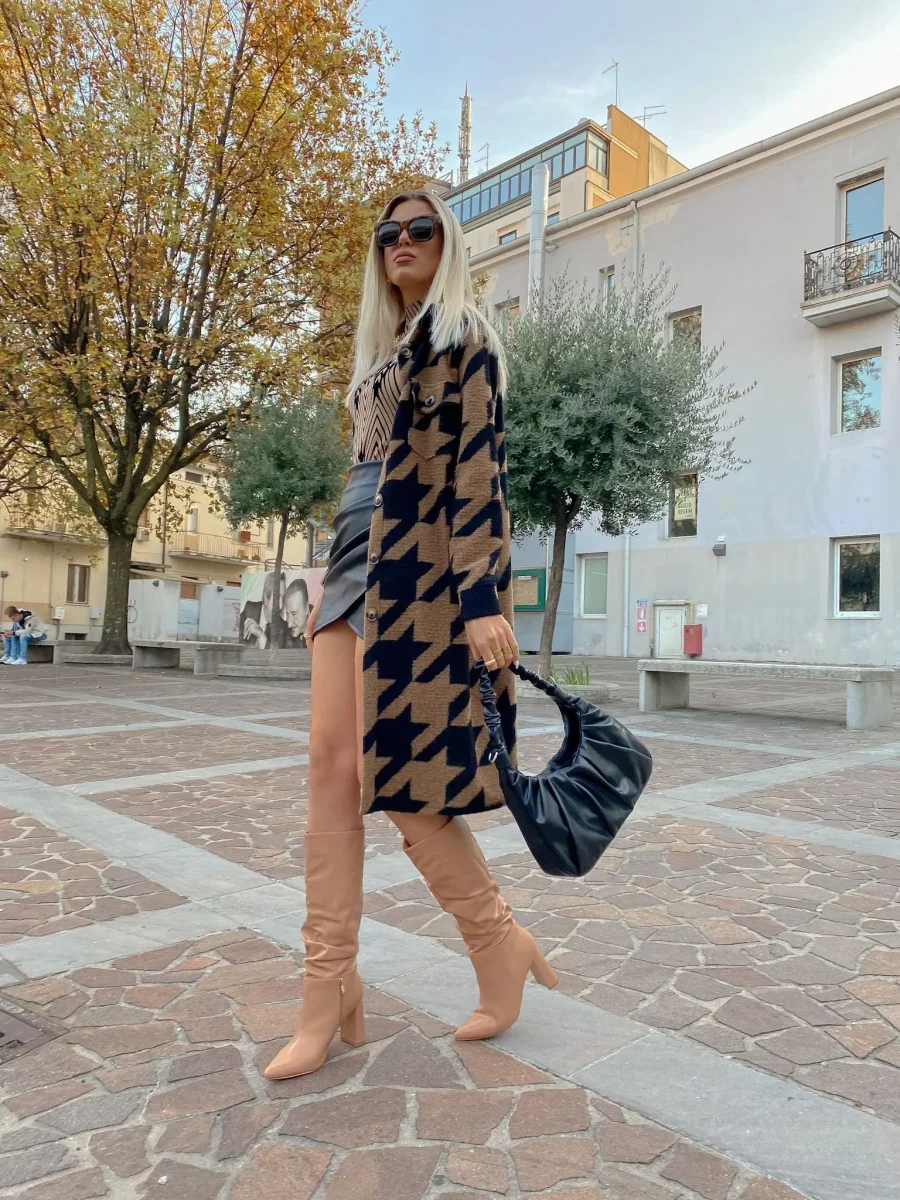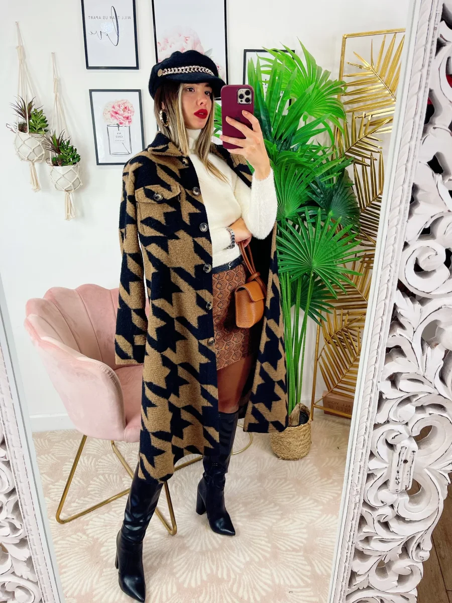 Giacca pied de poule camel e nera Con tasche, abbastanza lunga.
