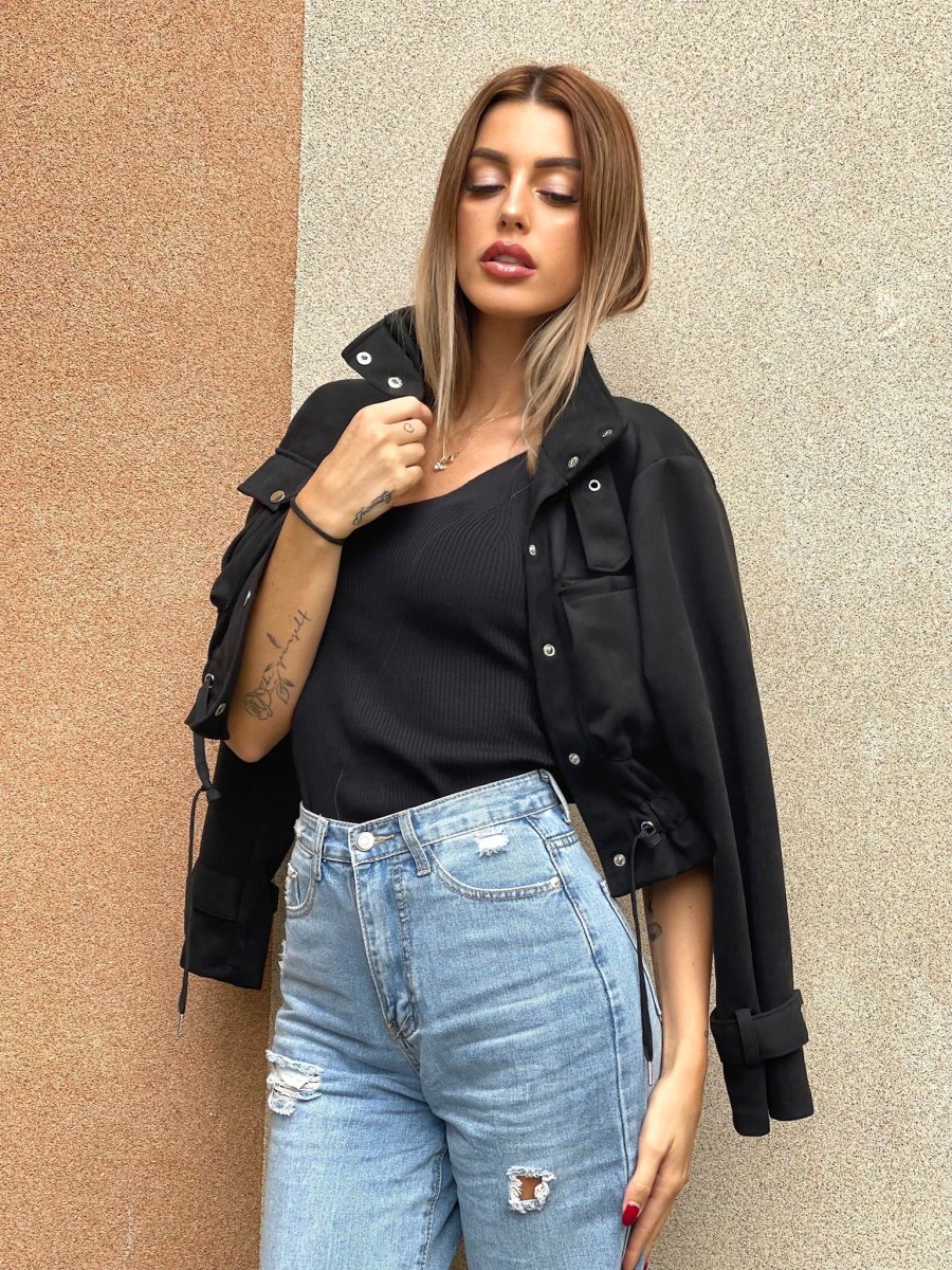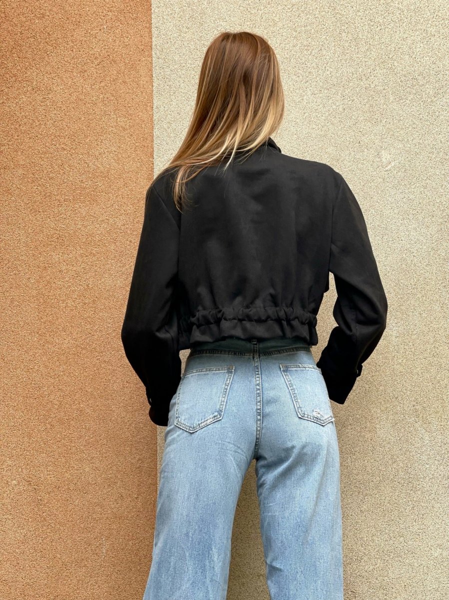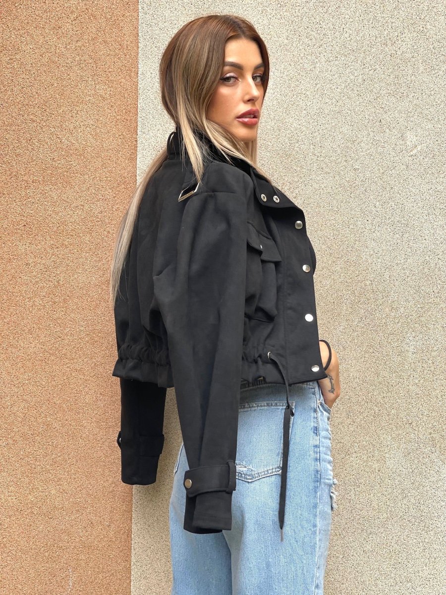 Giacchino in camoscio con chiusura a bottoncini. Elastico in vita e dettagli taschine e sui polsi