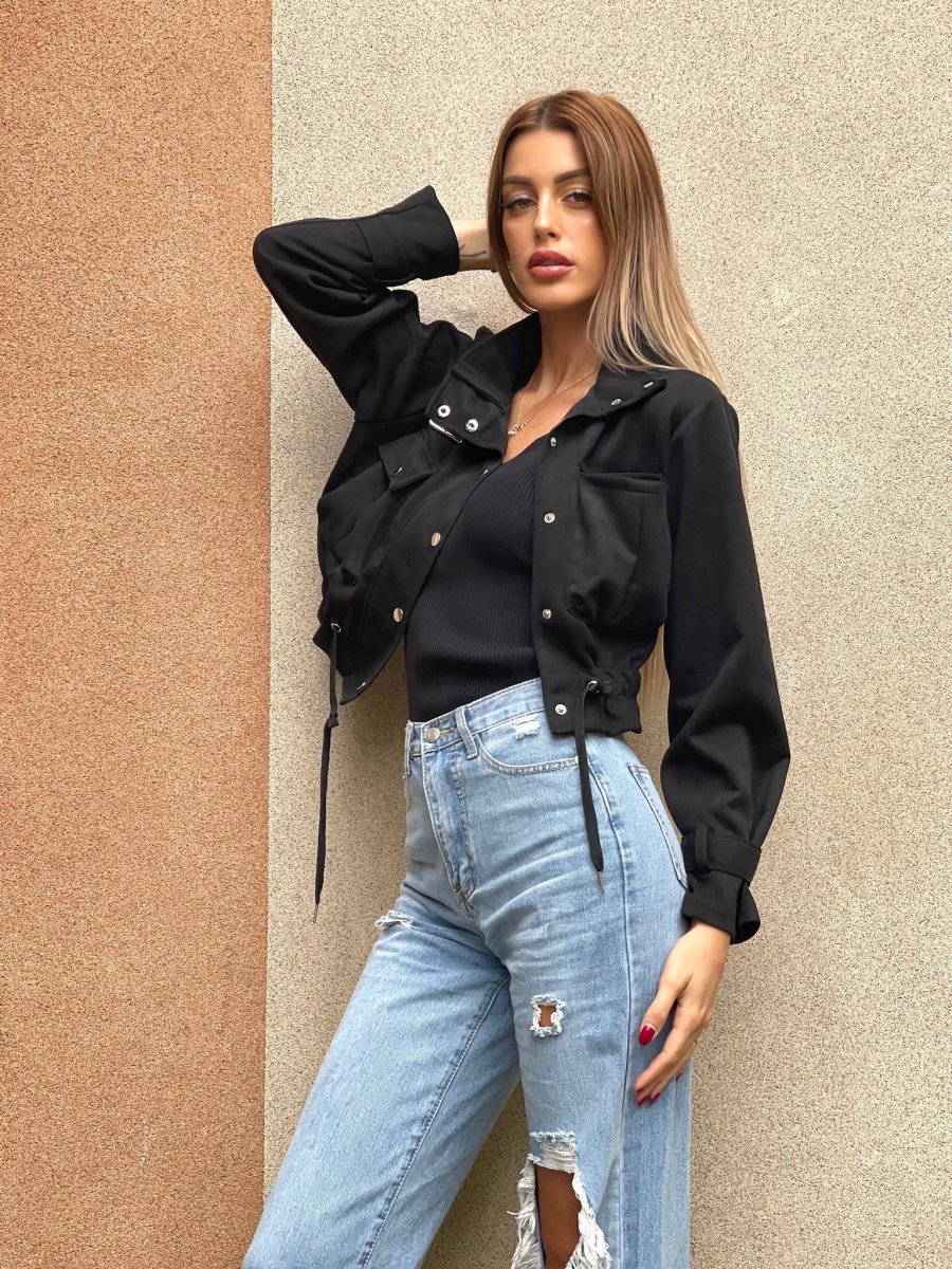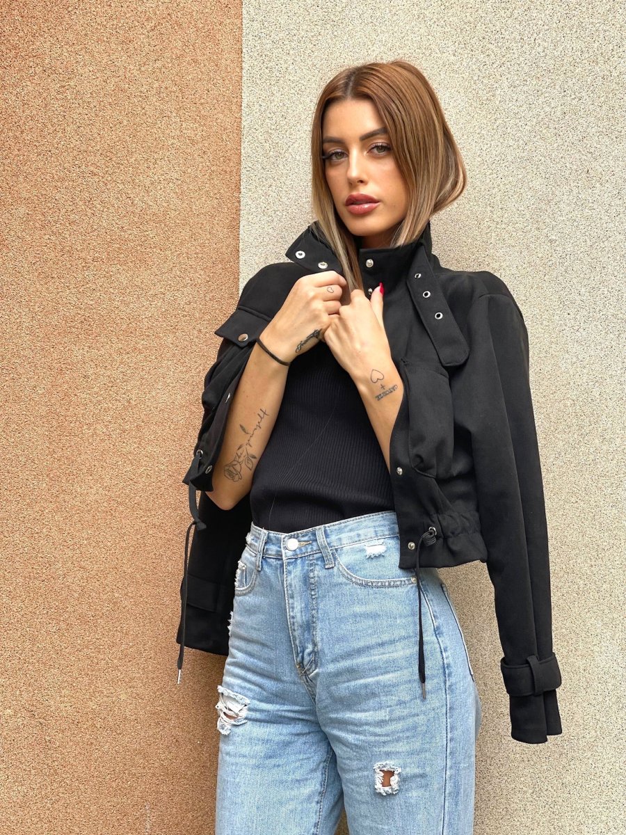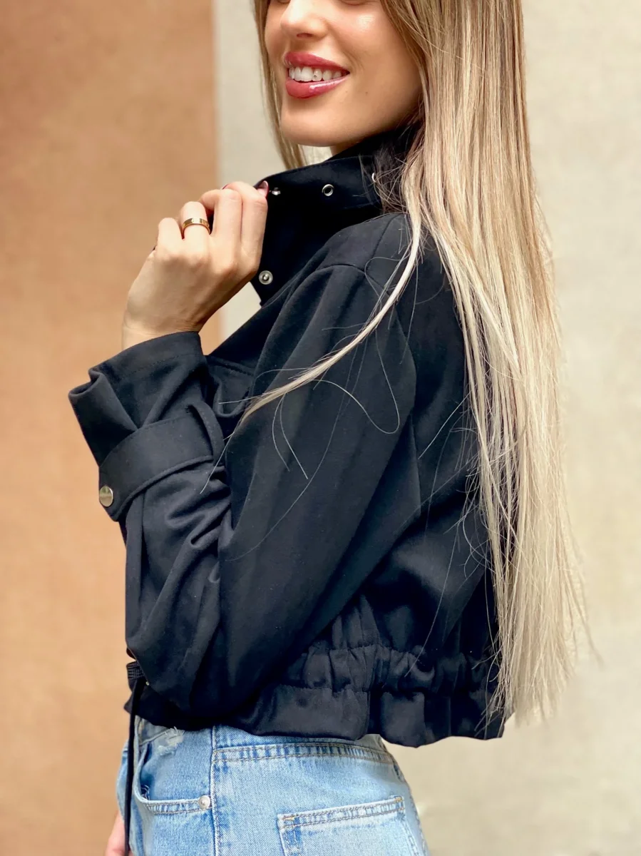Giacchino in camoscio con chiusura a bottoncini. Elastico in vita e dettagli taschine e sui polsi