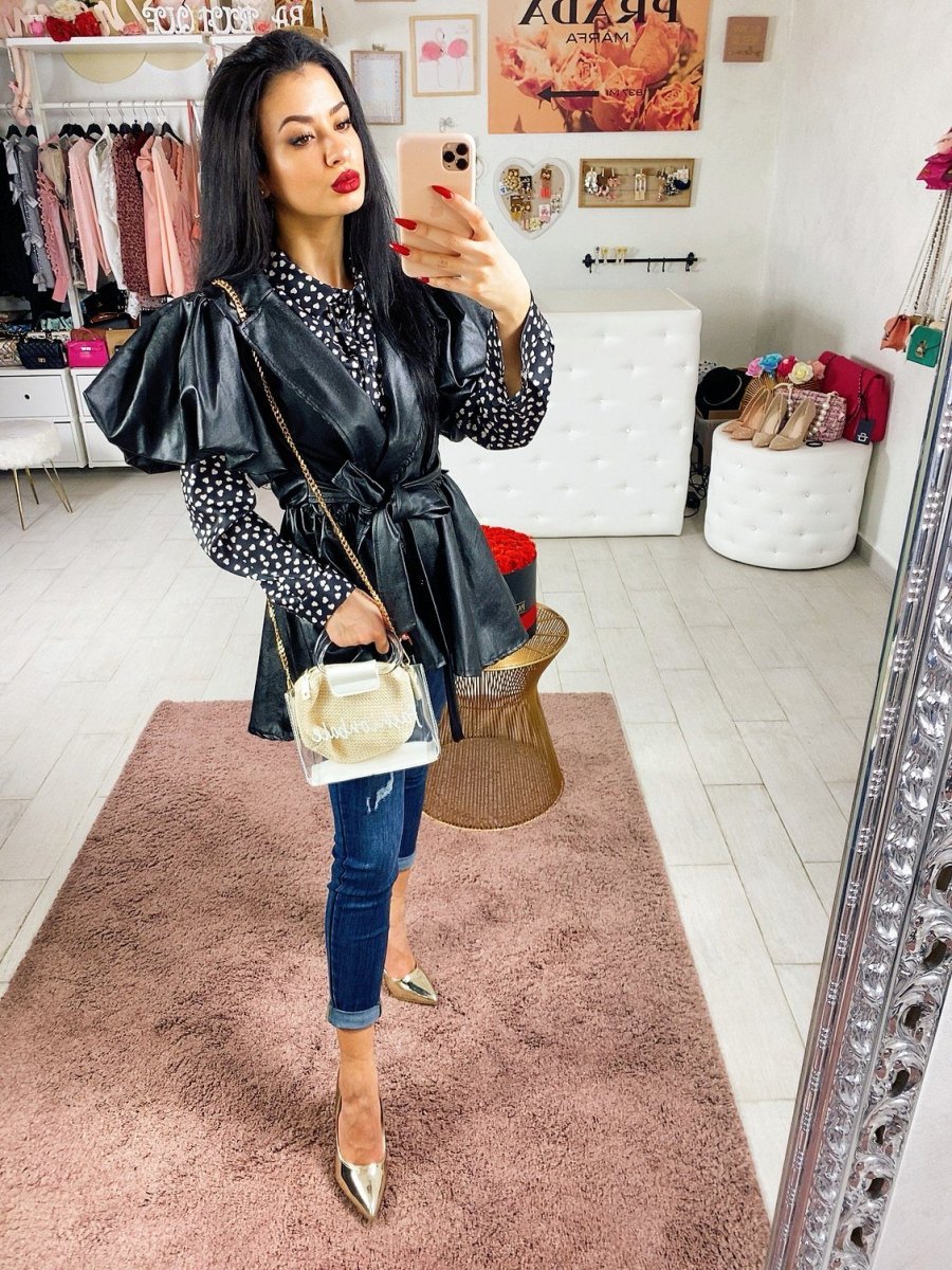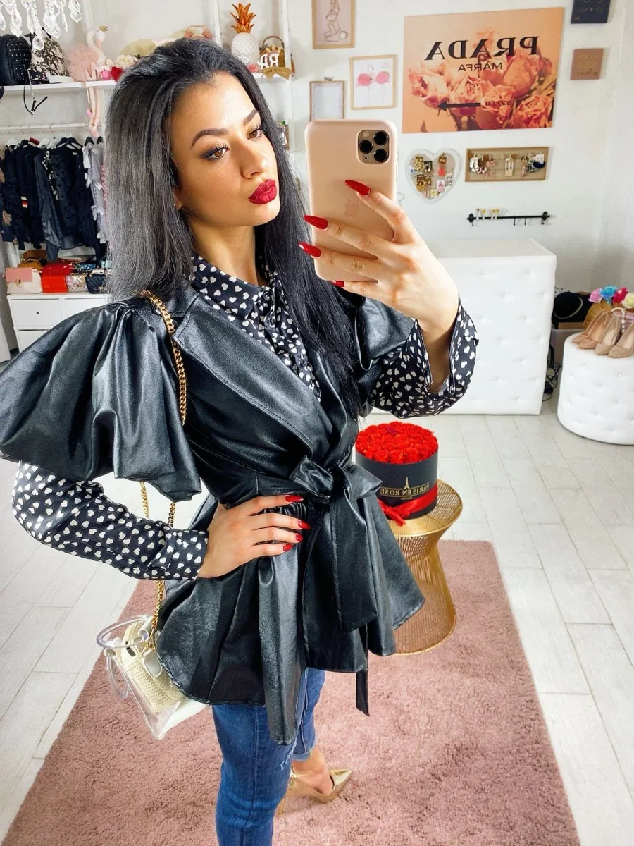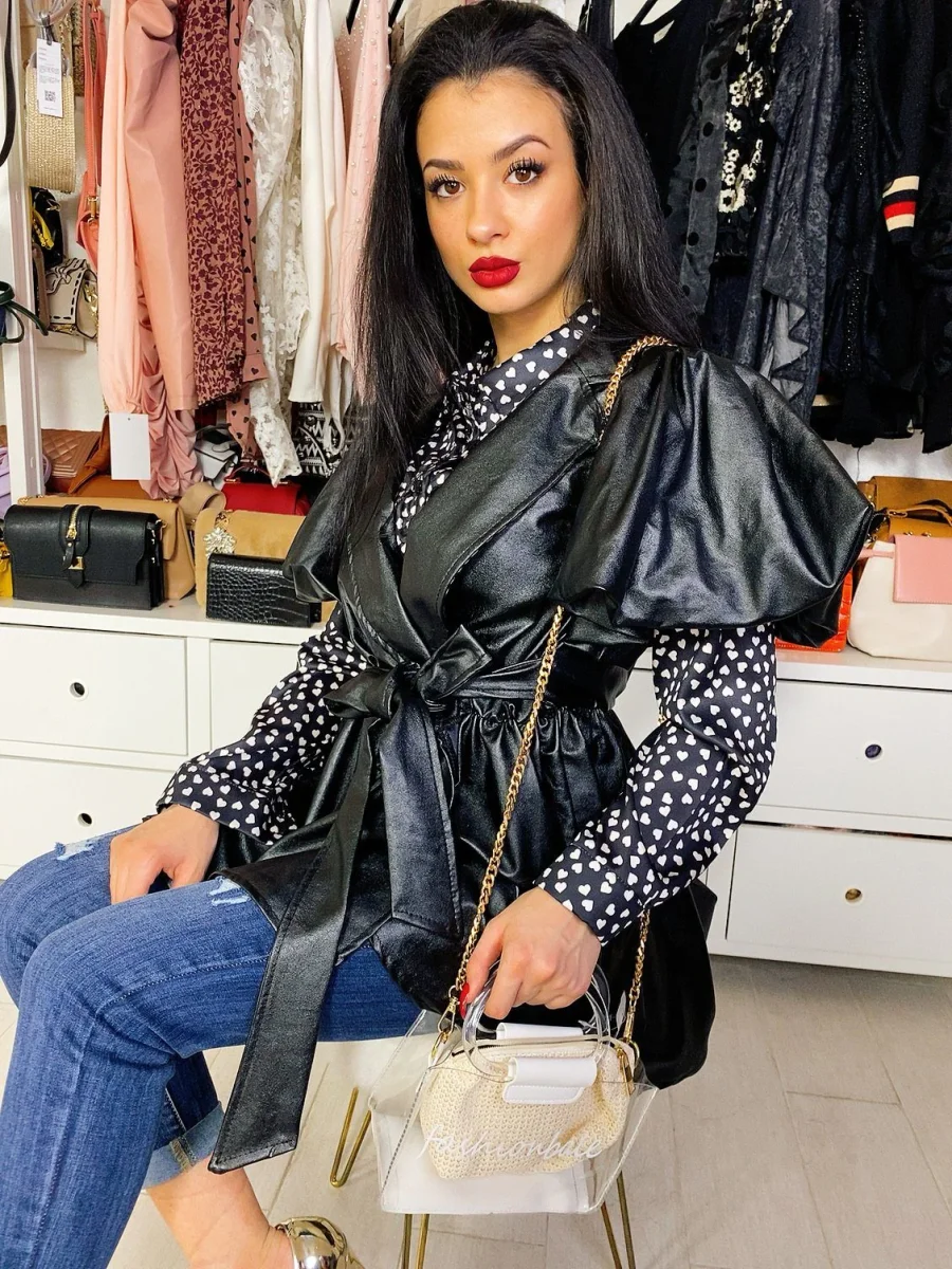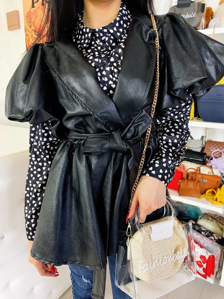 Giacchino in eco- pelle con manica corta bombata e cintura in vita. Perfetto per qualsiasi taglia