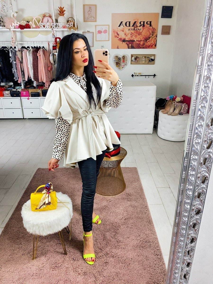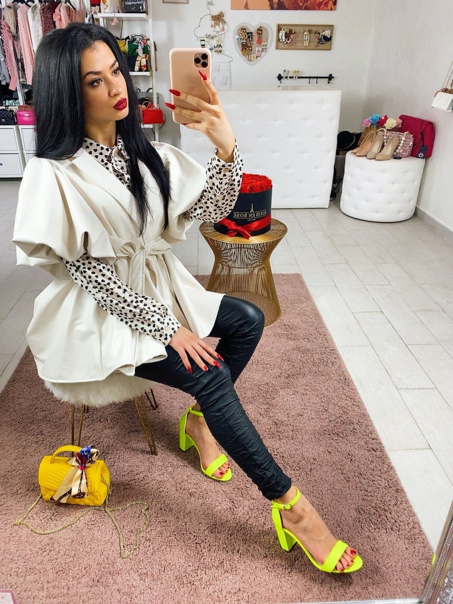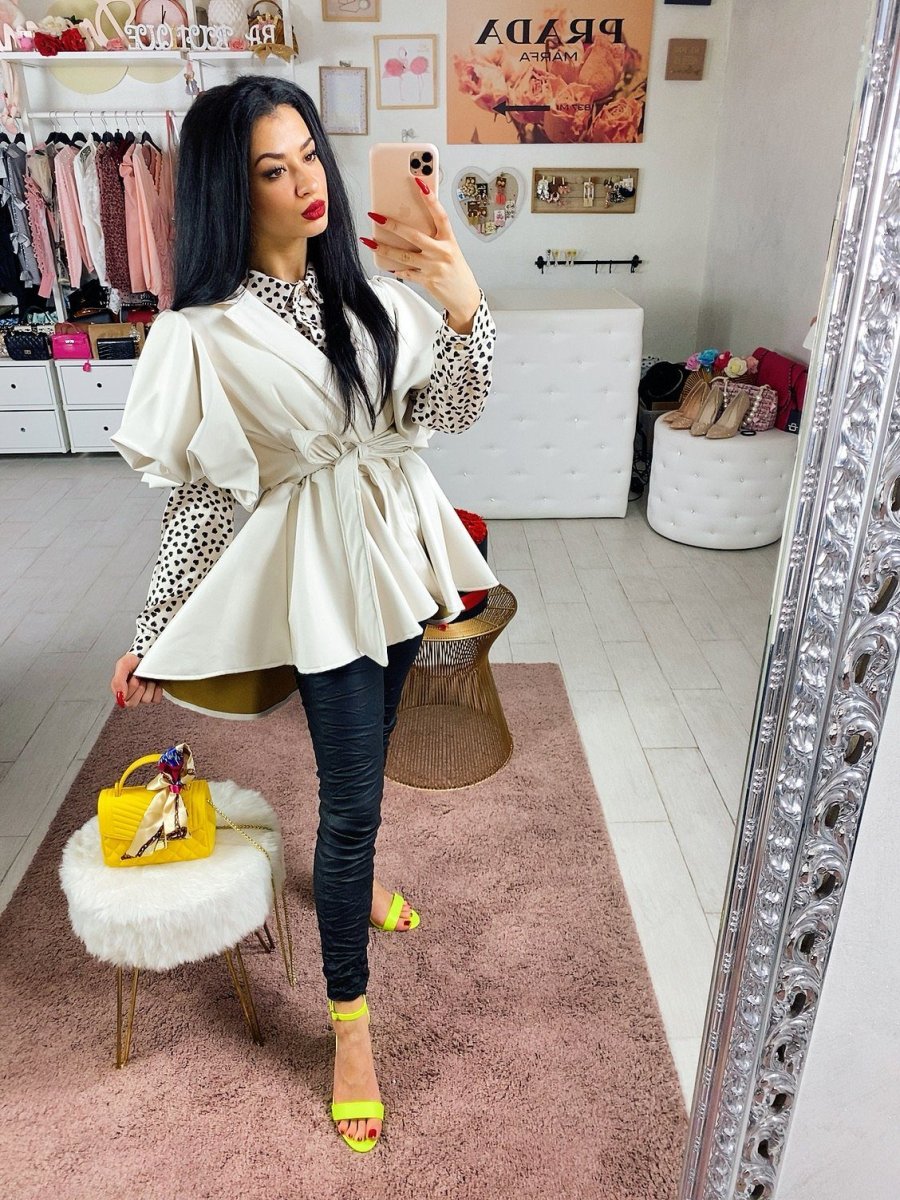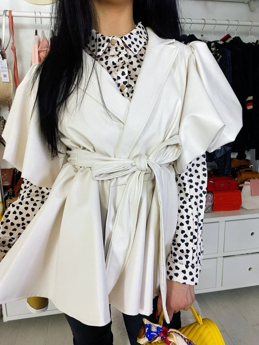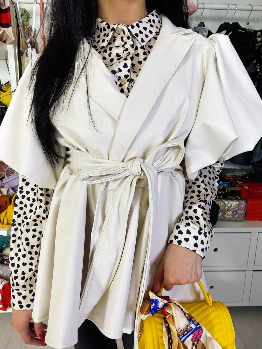 Giacchino in eco- pelle con manica corta bombata e cintura in vita. Perfetto per qualsiasi taglia
