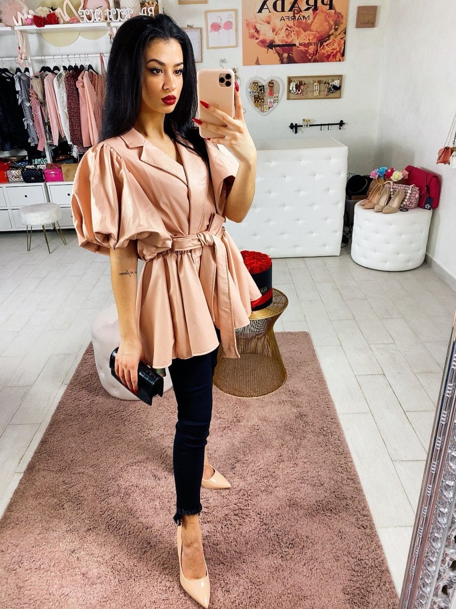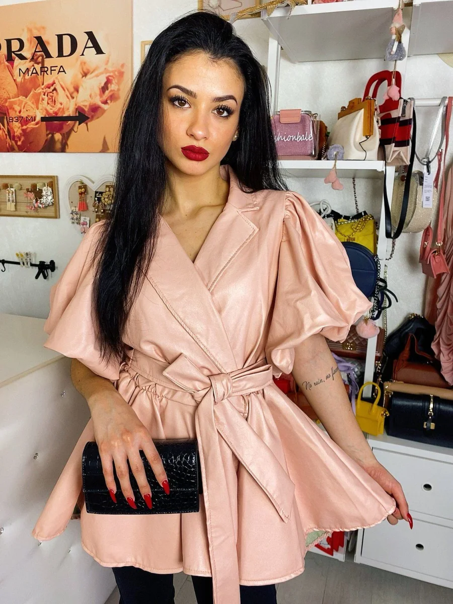 Giacchino in eco- pelle con manica corta bombata e cintura in vita. Perfetto per qualsiasi taglia