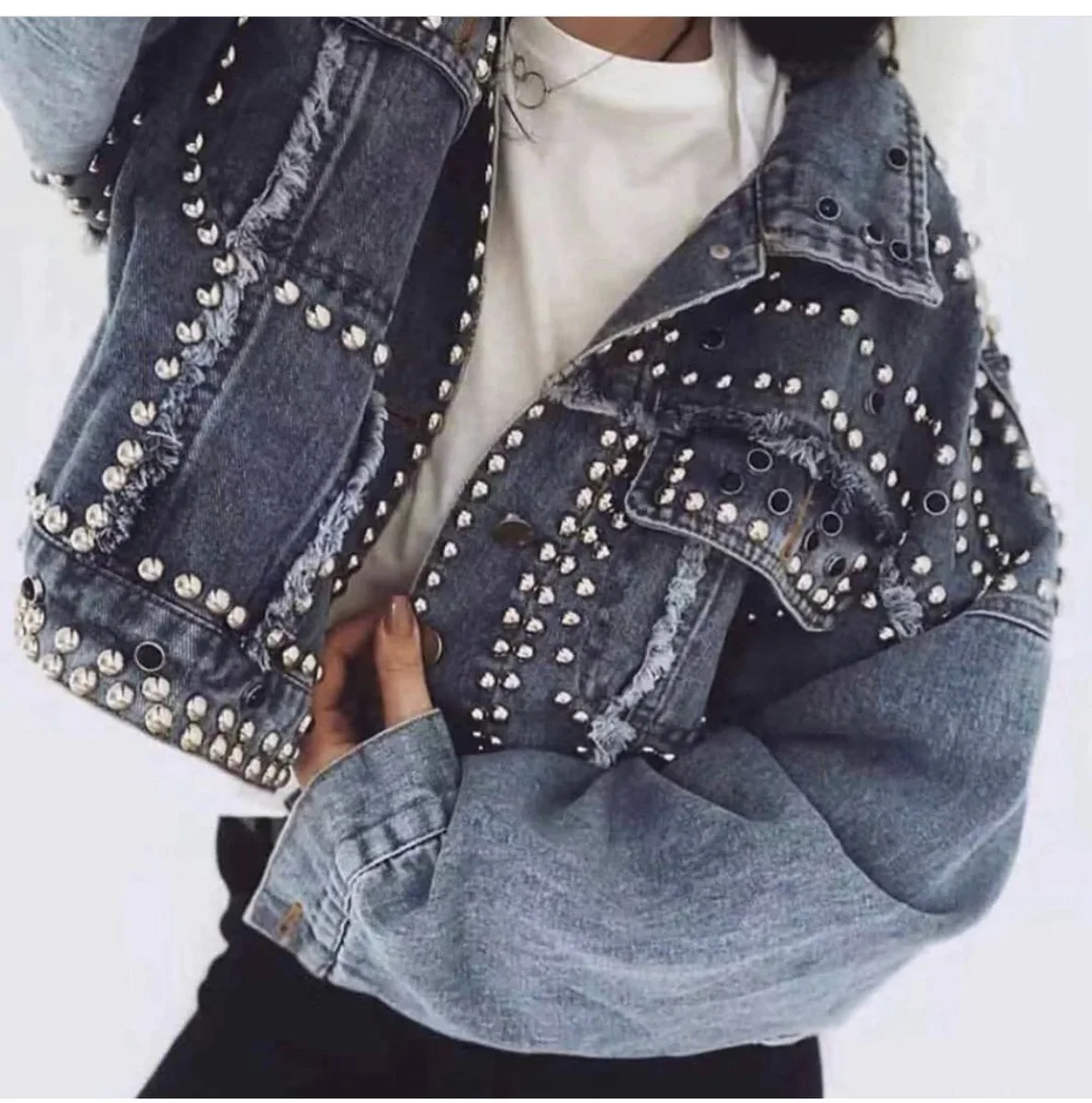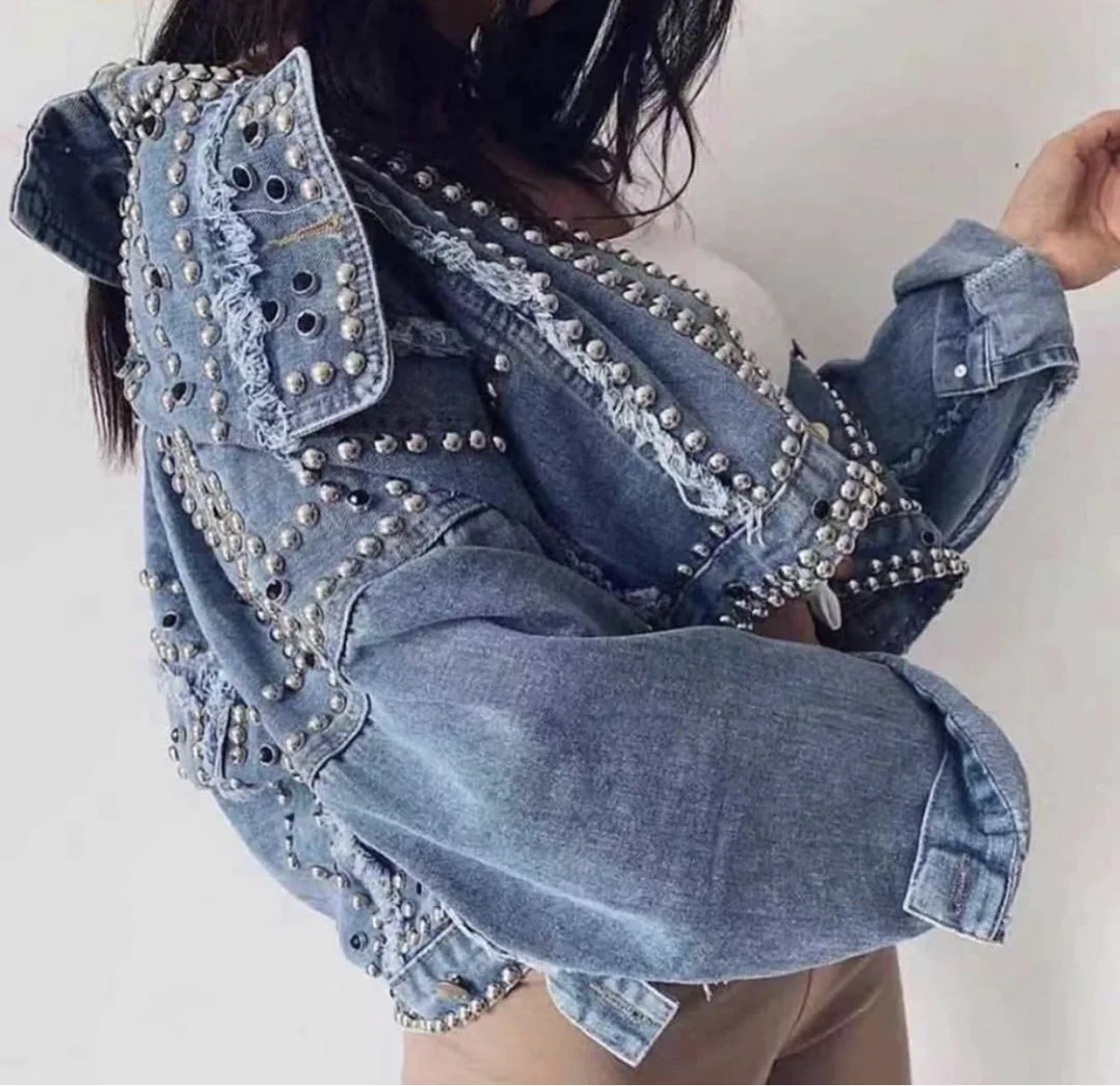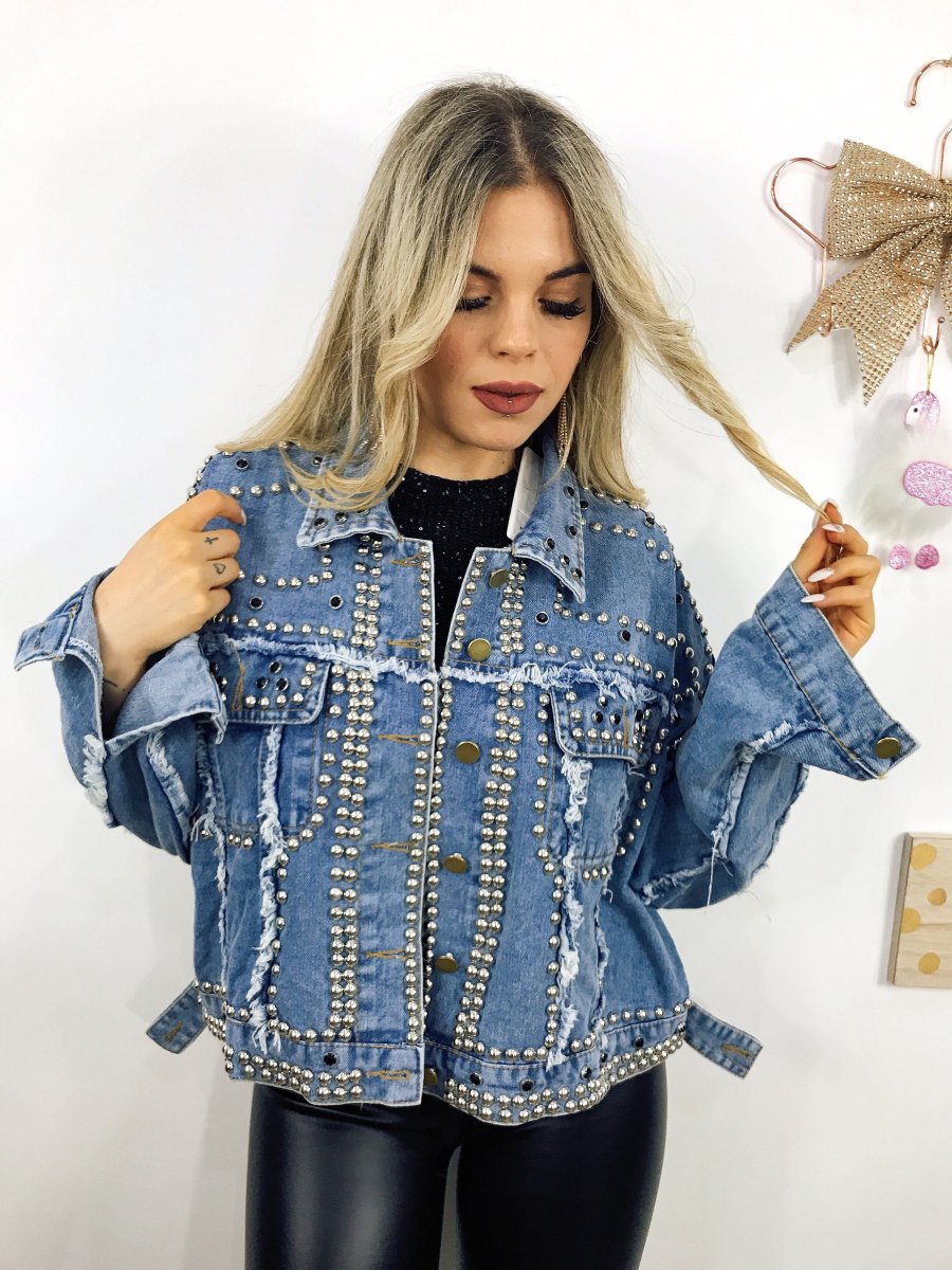Giaccone in jeans con strass neri e borchie. Taglio over