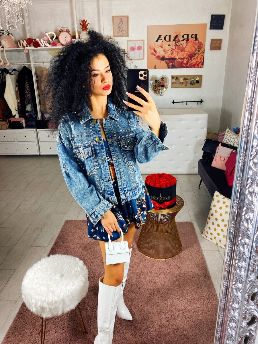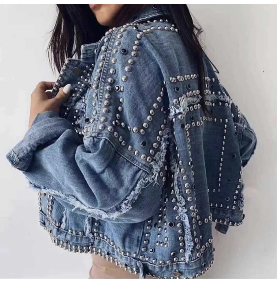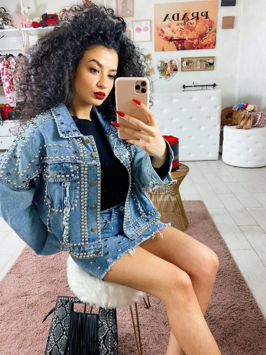 Giaccone in jeans con strass neri e borchie. Taglio over
