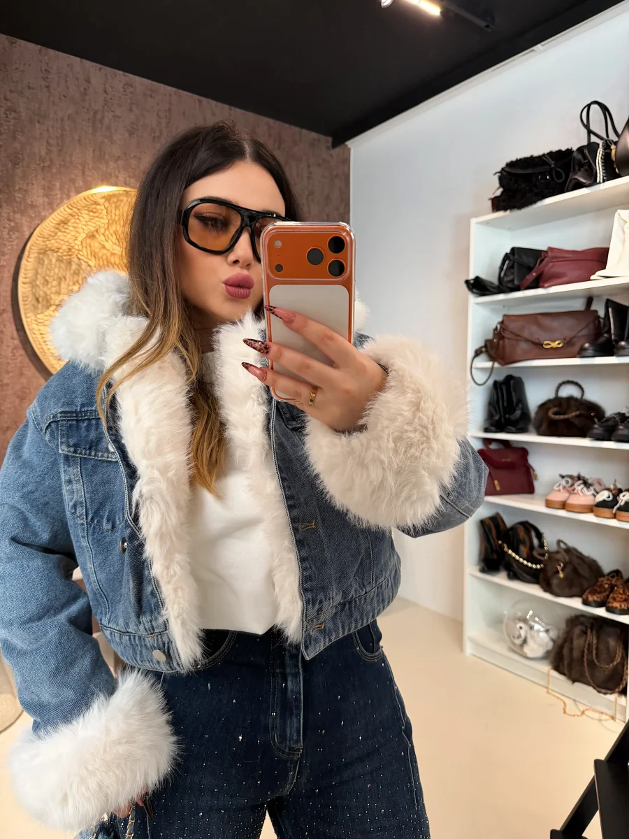 Giaccone di jeans con maxi pelo bianco removibile. Utilizzabile anche nelle mezze stagioni come un semplice giaccone di jeans