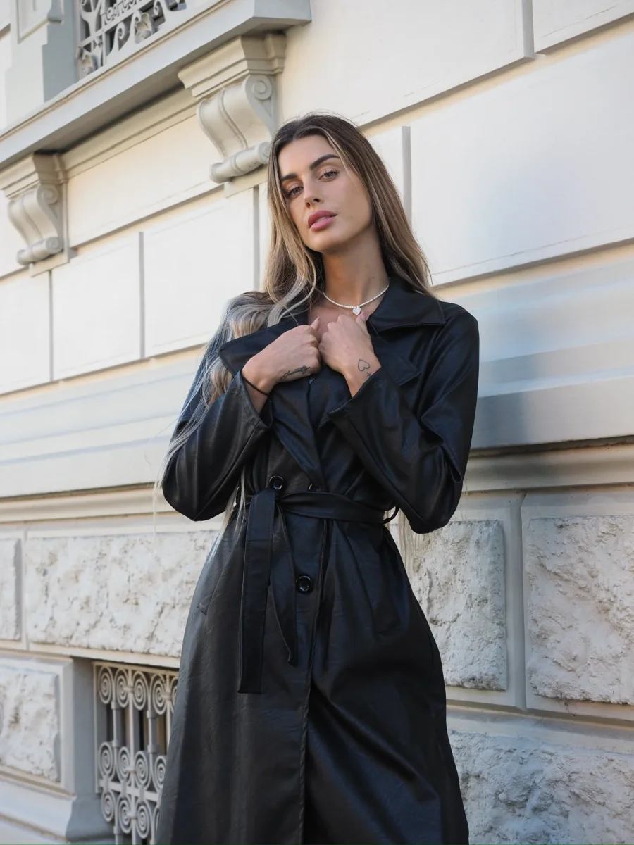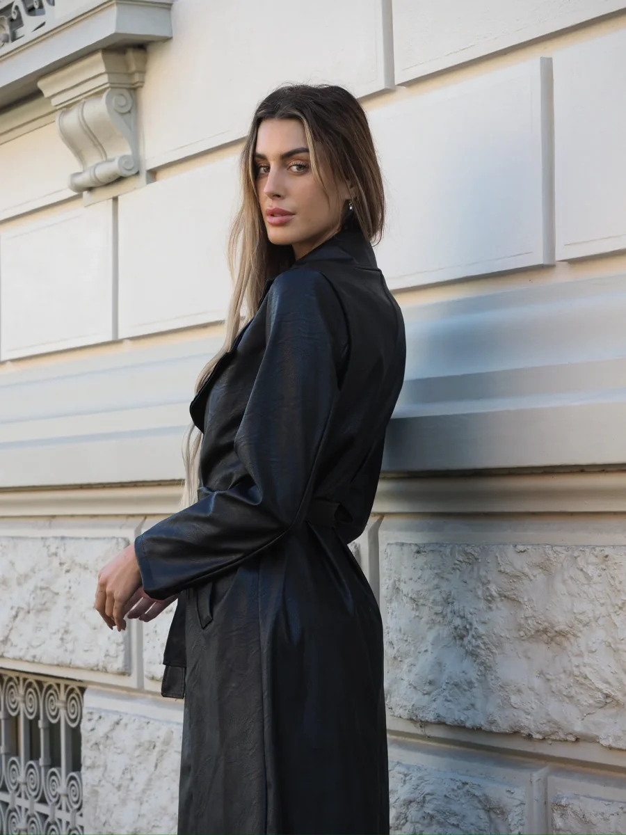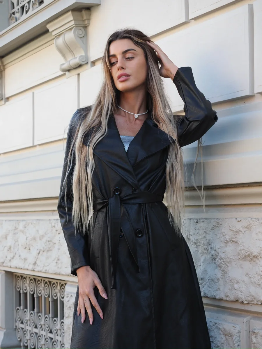 Maxi giaccone in ecopelle con chiusura con bottoni e cintura in vita.