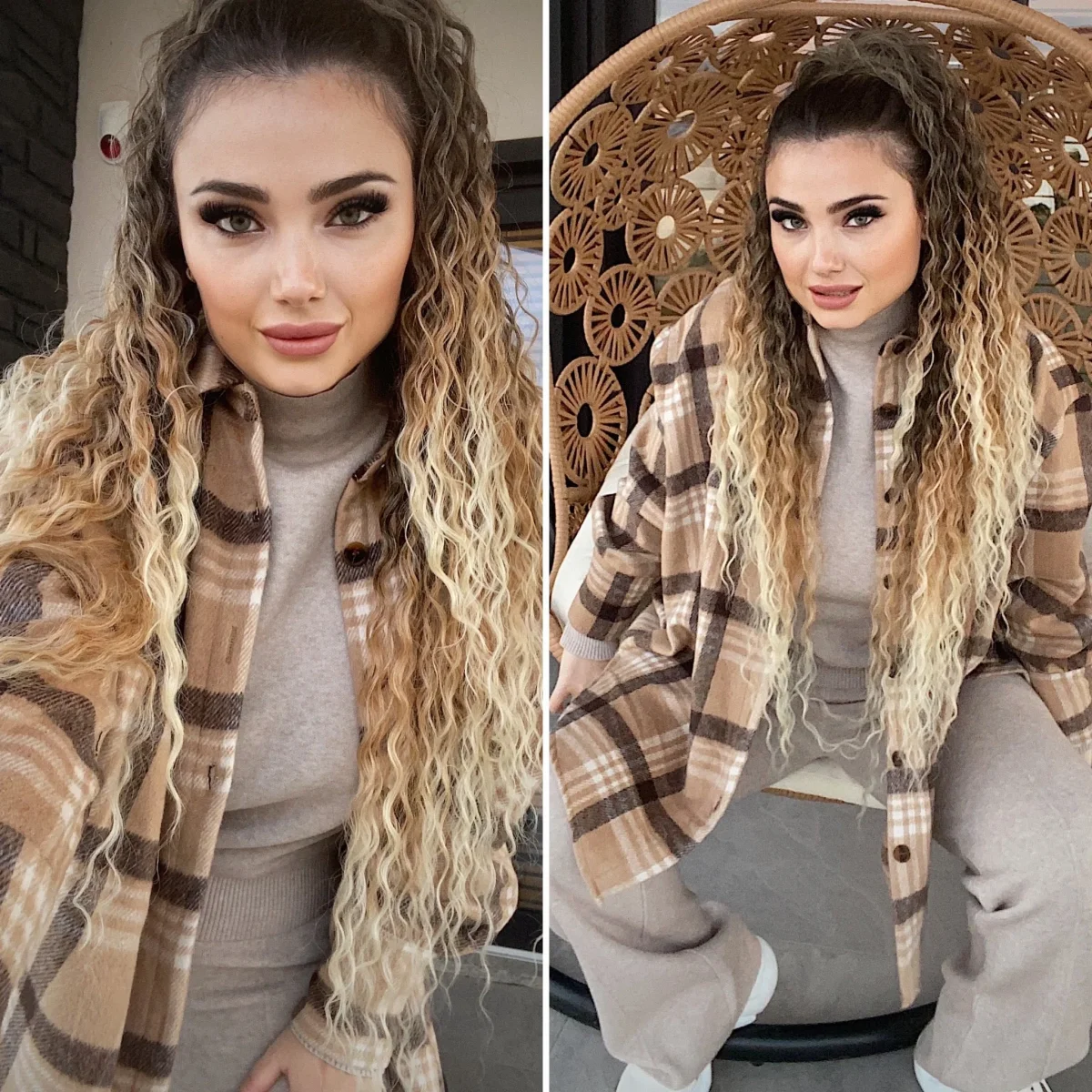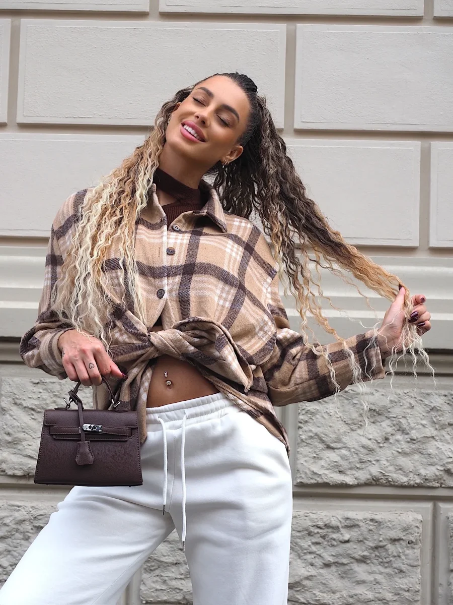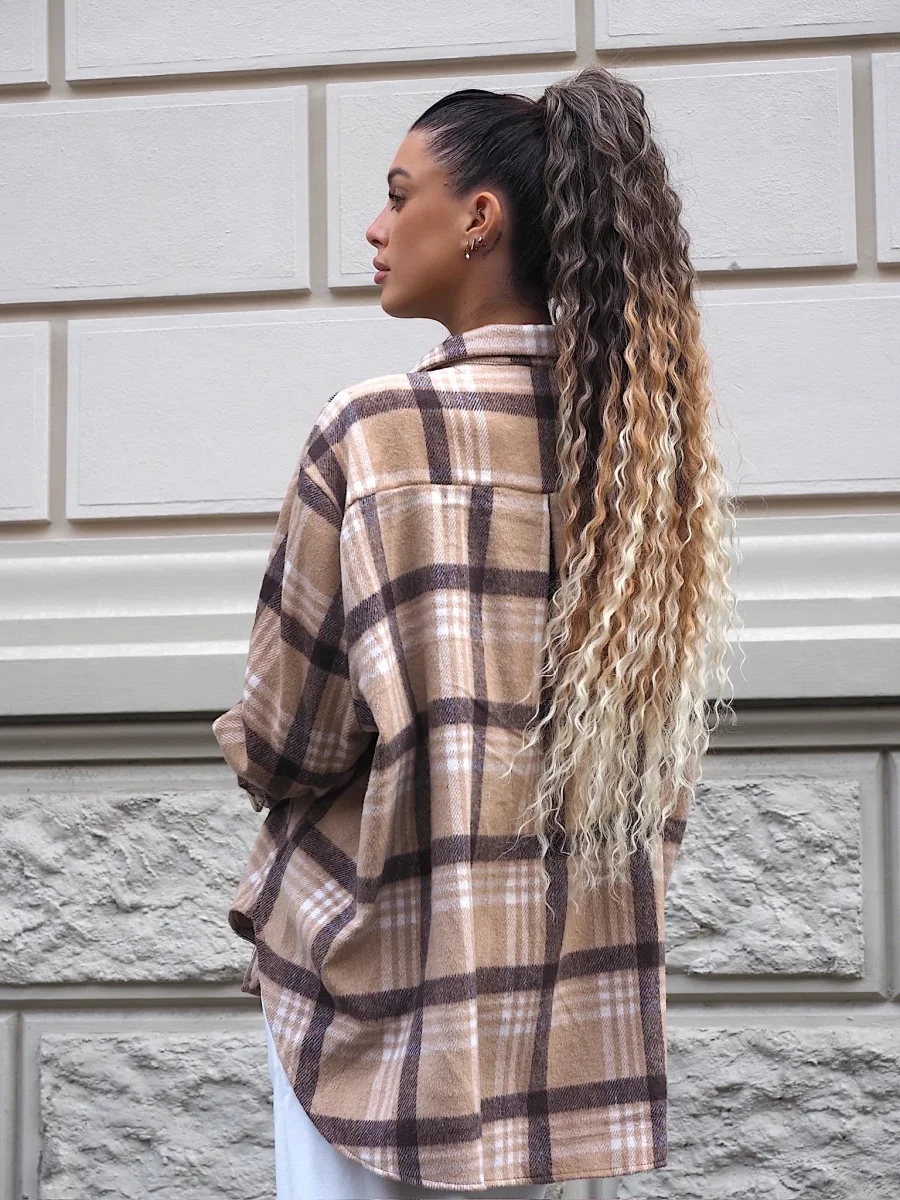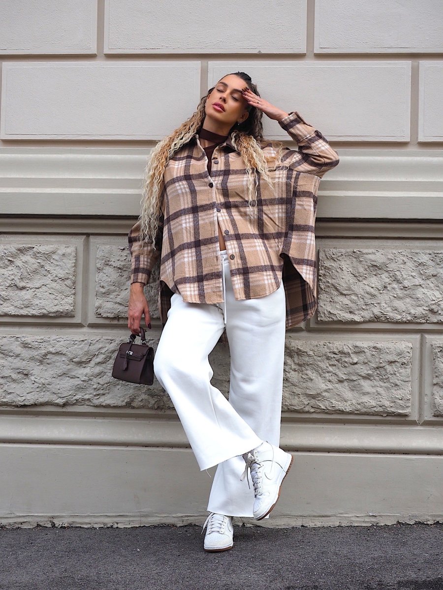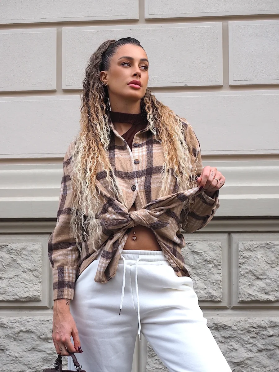 Giacca morbida in tweed con fantasia a check sui toni nude, chiusura con bottoni