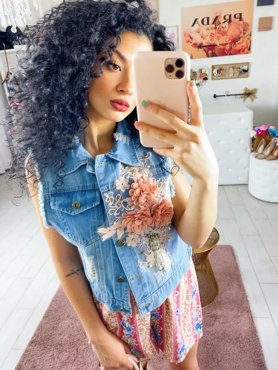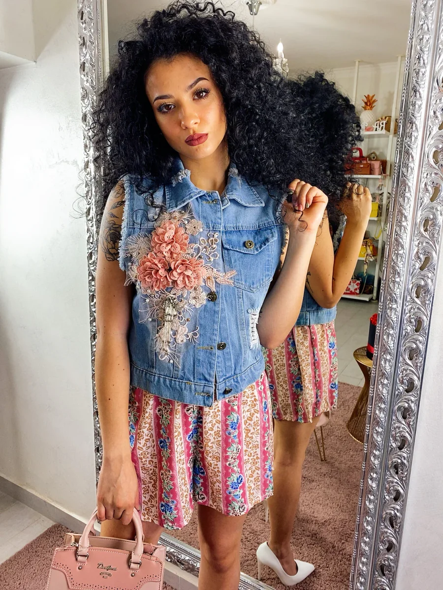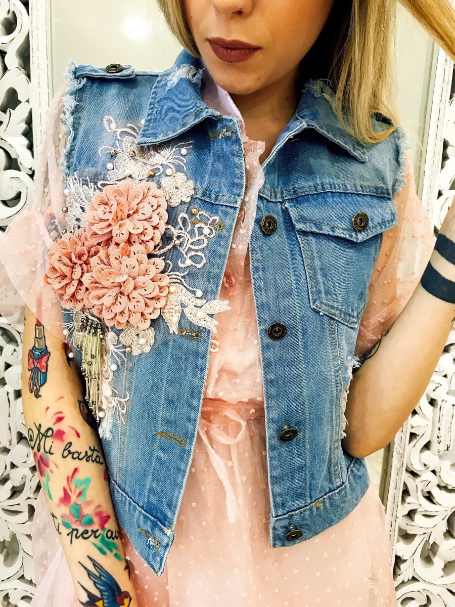 Bellissimo gilet di jeans con ricamo sul corpetto.