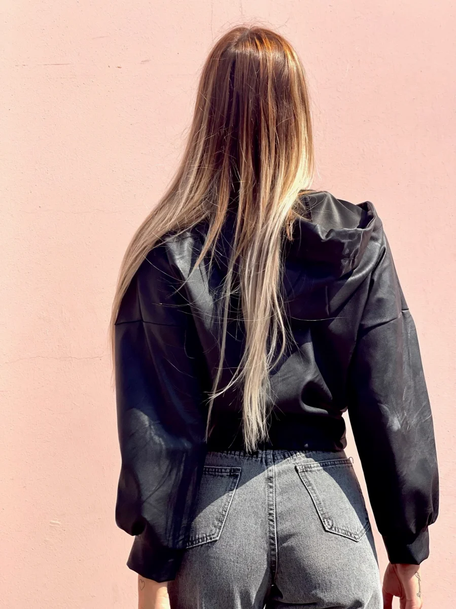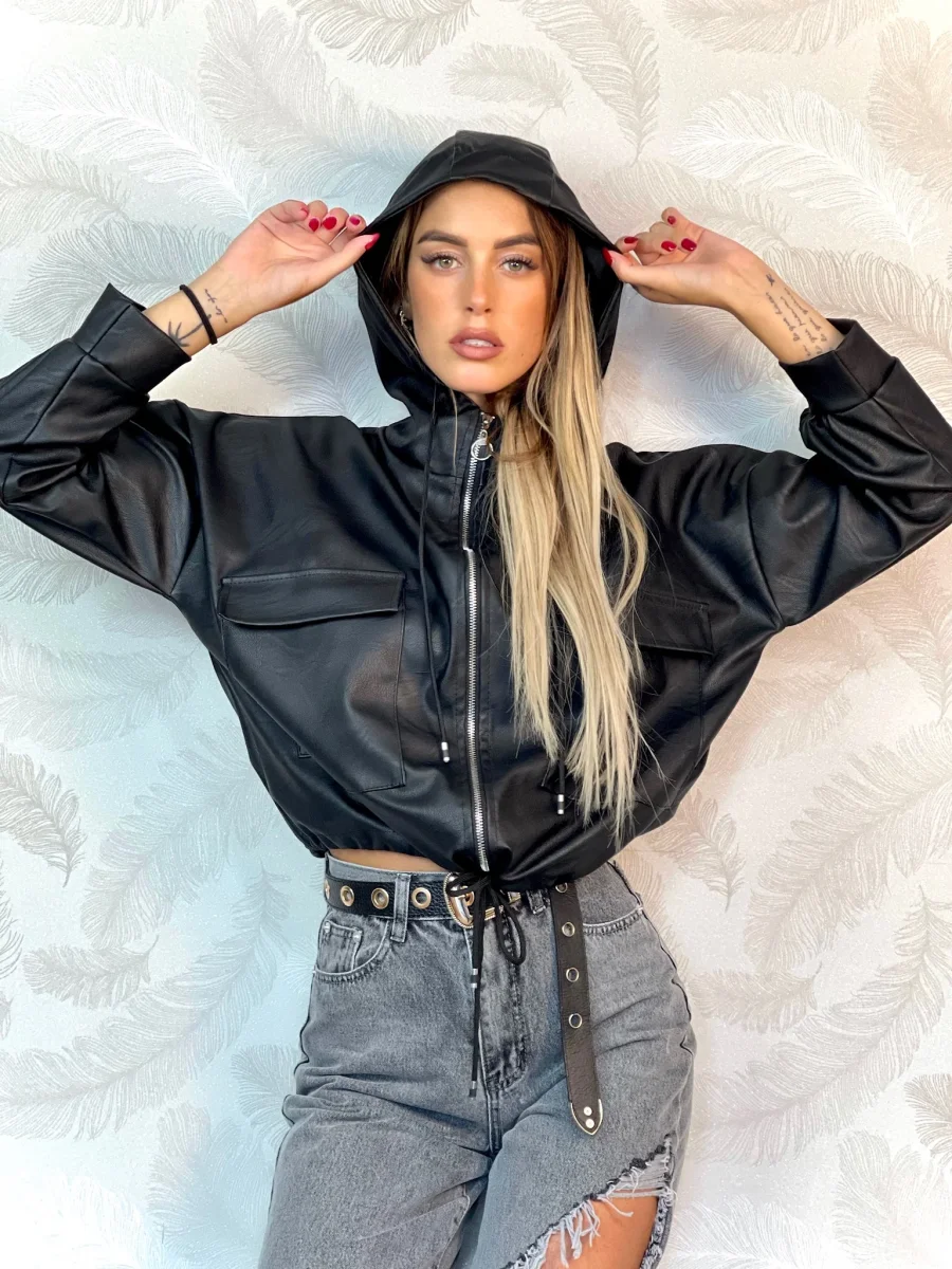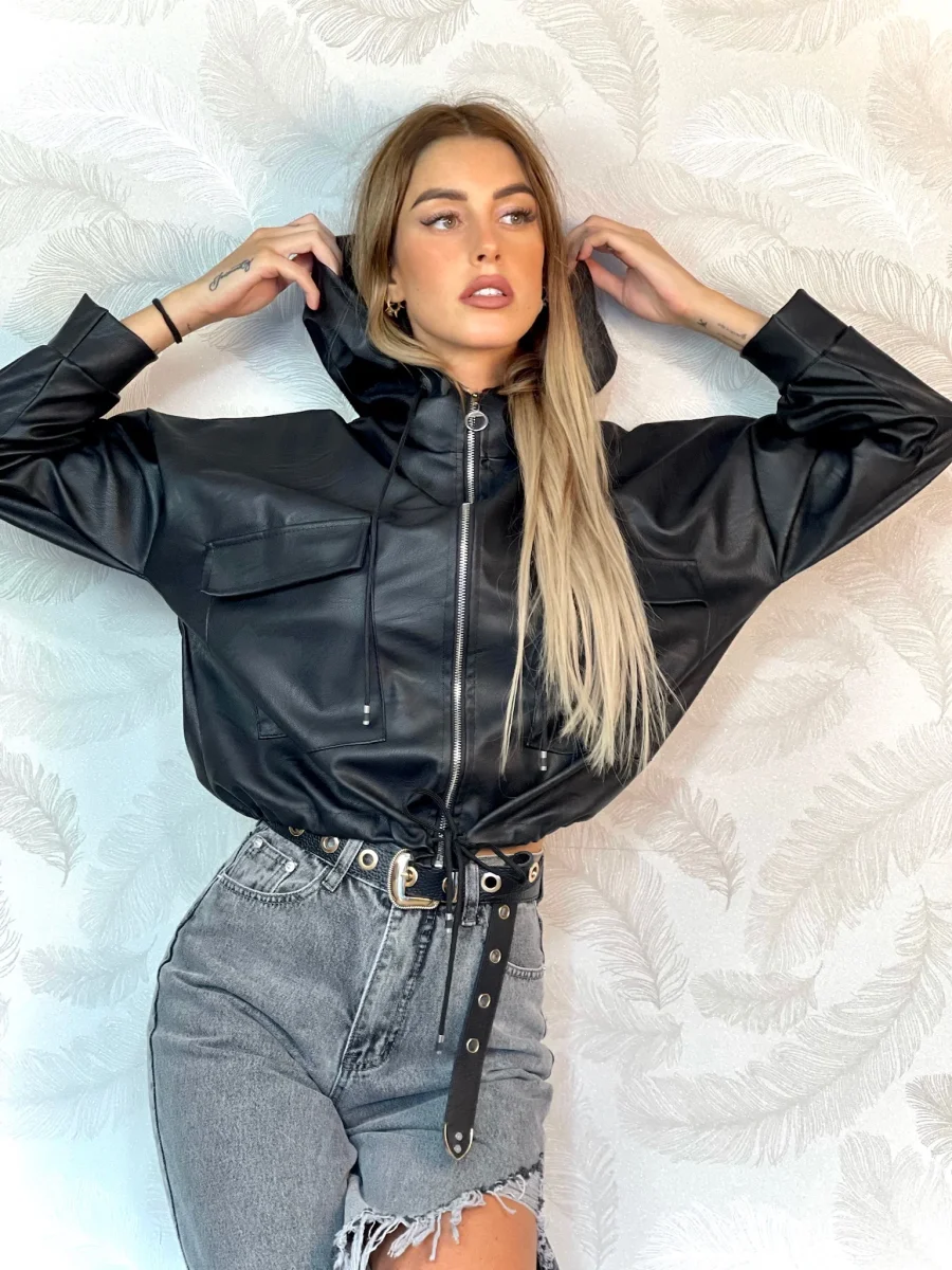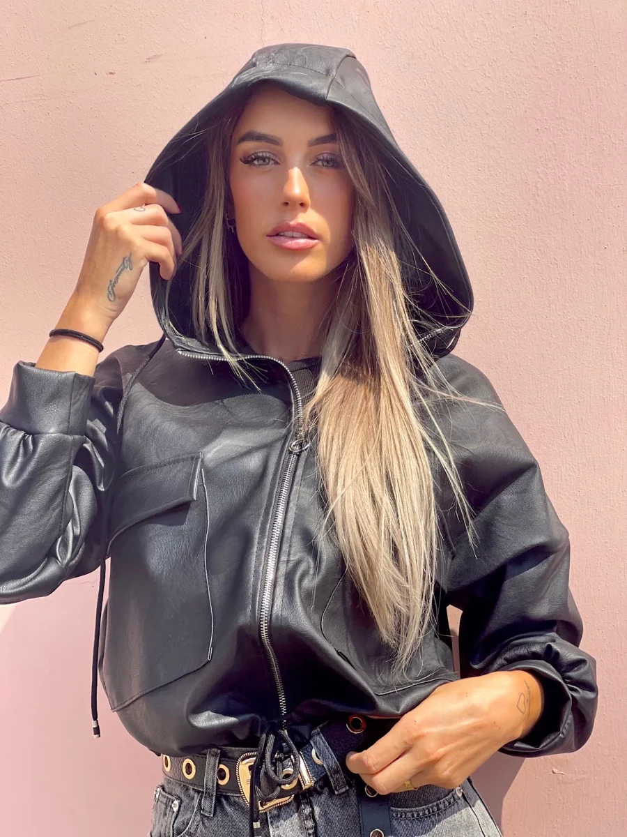 giubbino in ecopelle con cappuccio e chiusura con zip. Elastico in vita.
