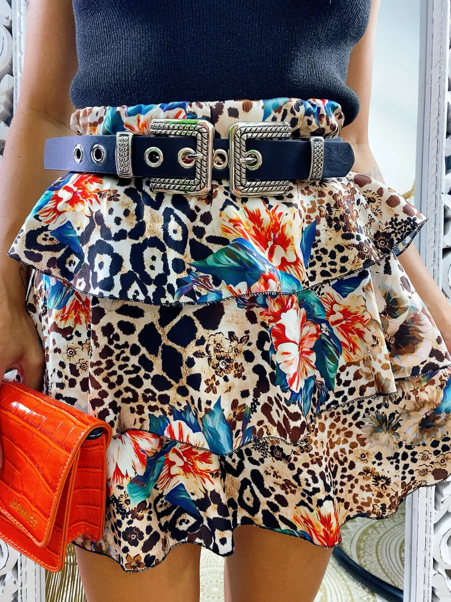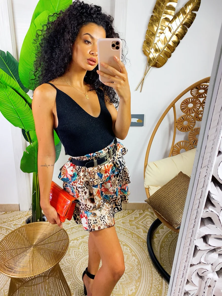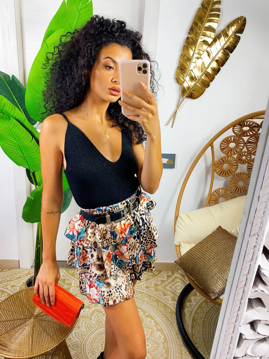 Gonna a balze, Tessuto elasticizzato in vita. Trama colorata stile giapponese