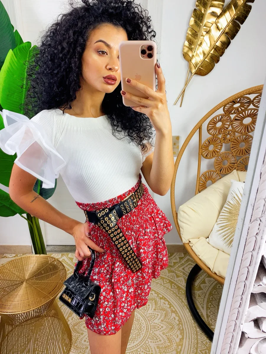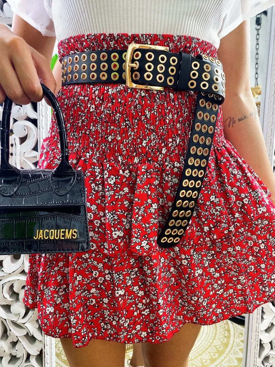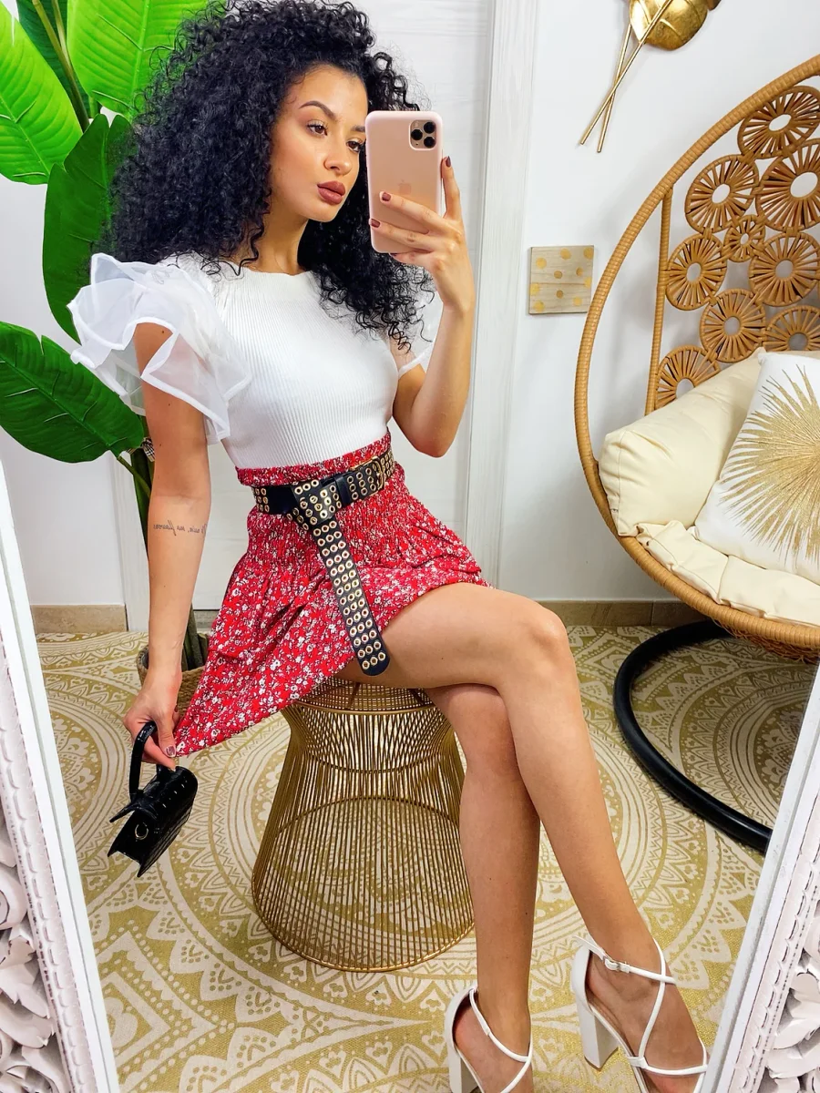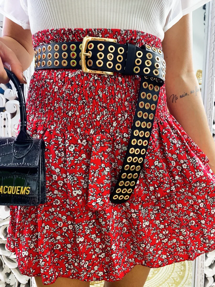Gonna a balze con fiori colorati . La gonna è dotata di un elastico in vita molto largo così da renderla adattabile a tutte le taglie.