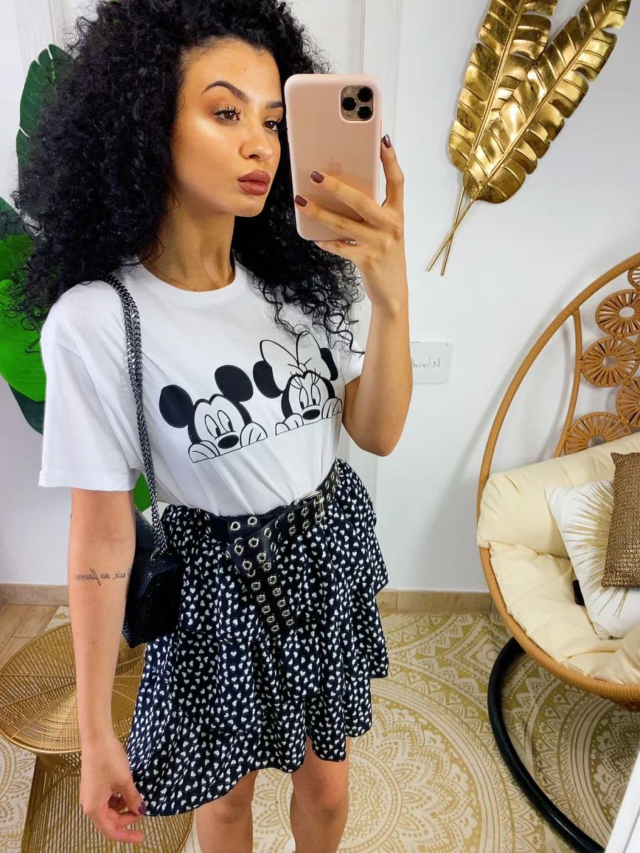 Gonna a balze asimmetriche dotata di fodera con stampa a cuoricini. Vestibilità corta