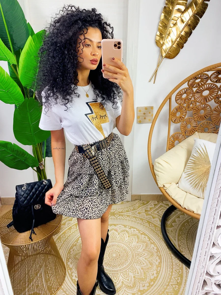 Gonna a balze in tessuto grintoso maculato. La gonna è dotata di un elastico in vita così da renderla adattabile a tutte le taglie. La gonna è foderata