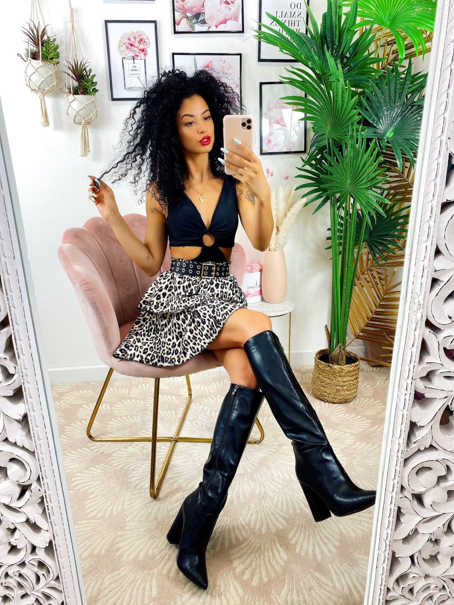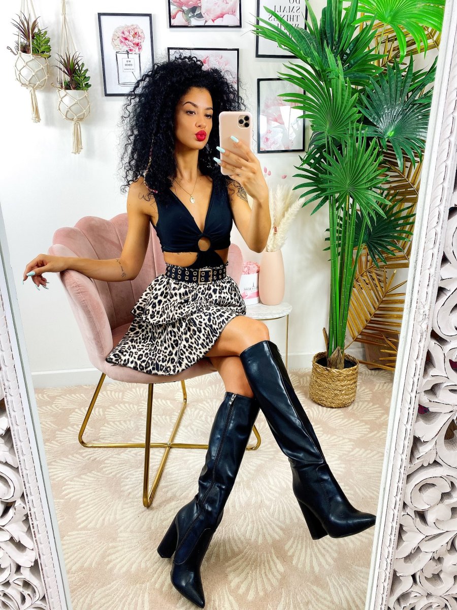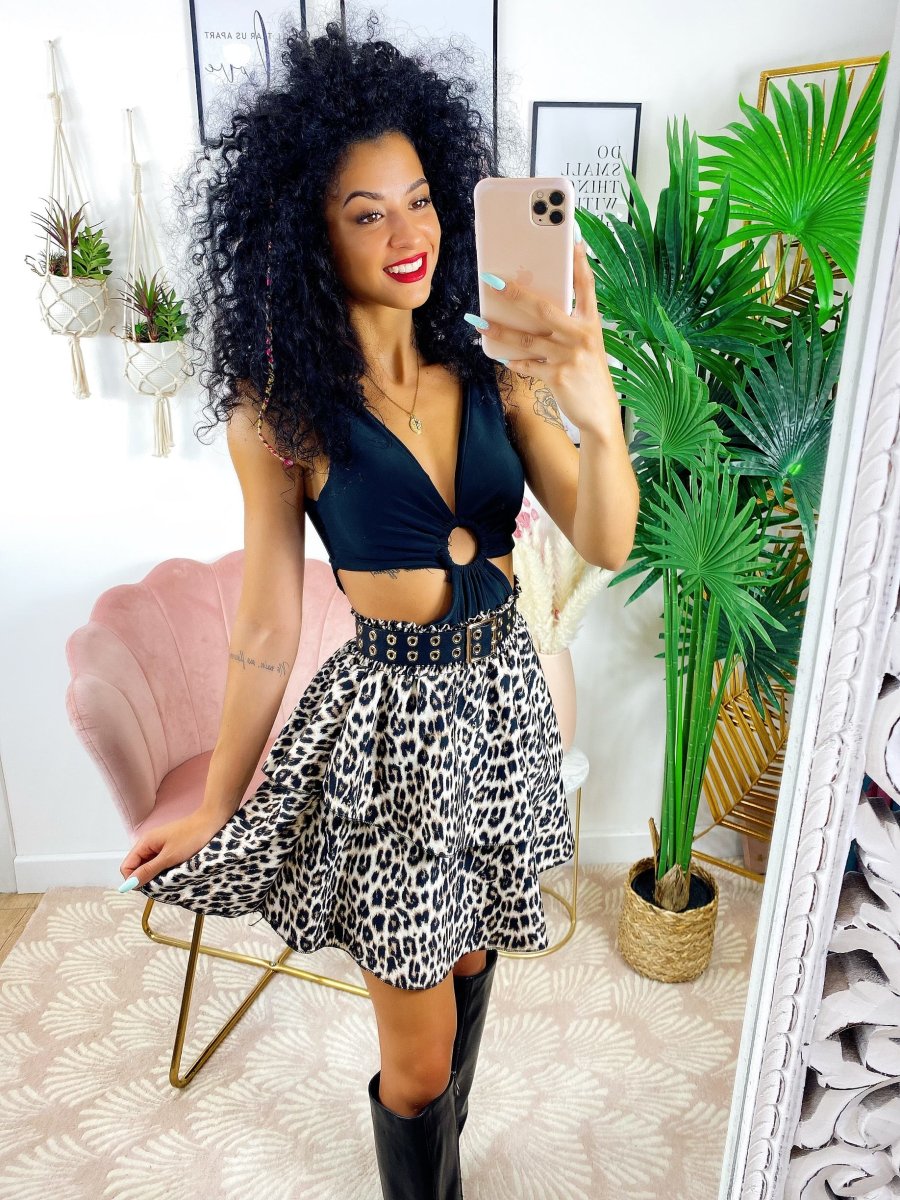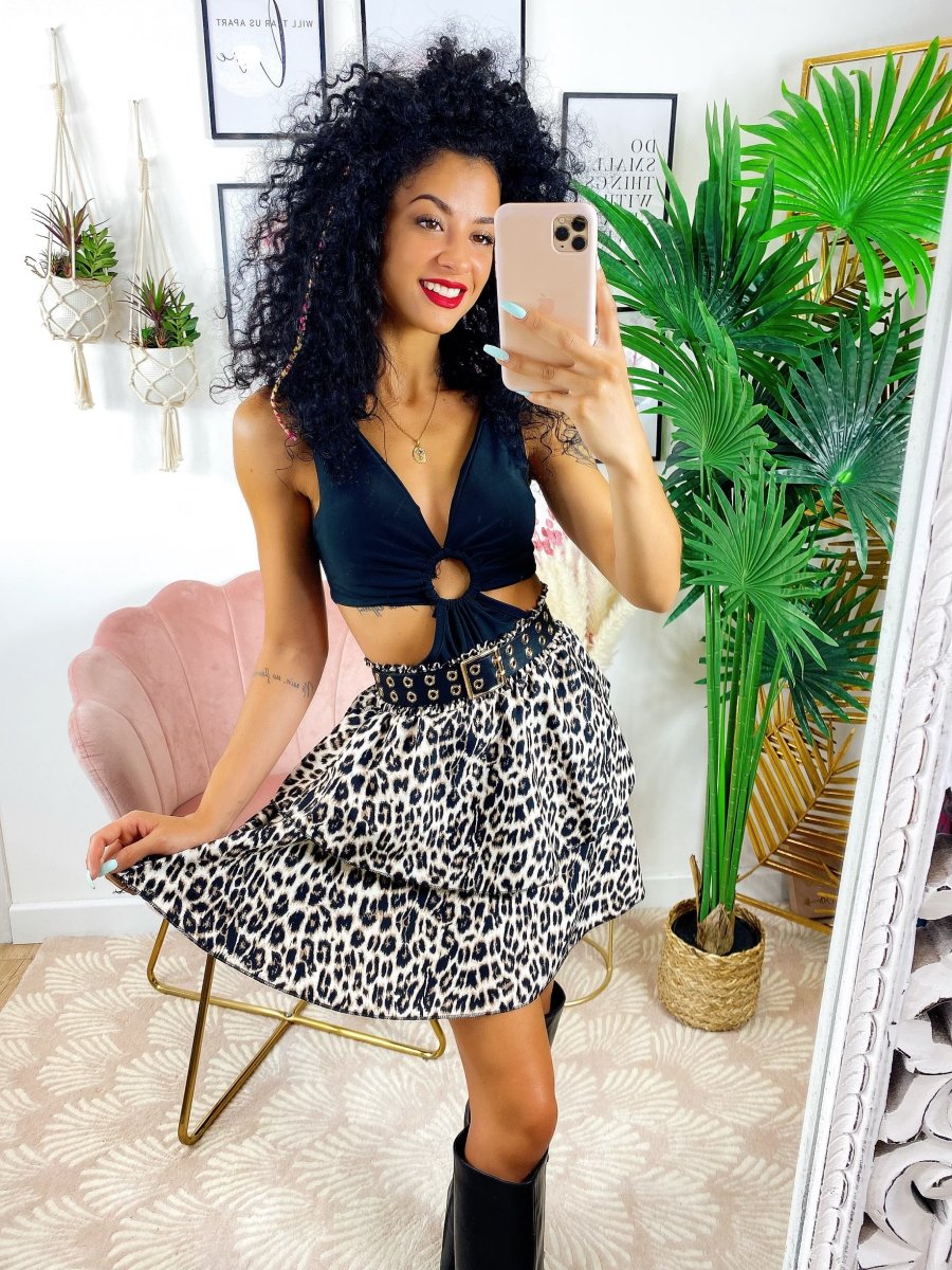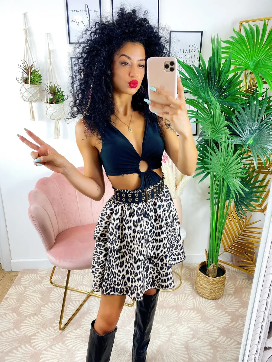 Gonna a balze in tessuto grintoso maculato. La gonna è dotata di un elastico in vita così da renderla adattabile a tutte le taglie. La gonna è foderata