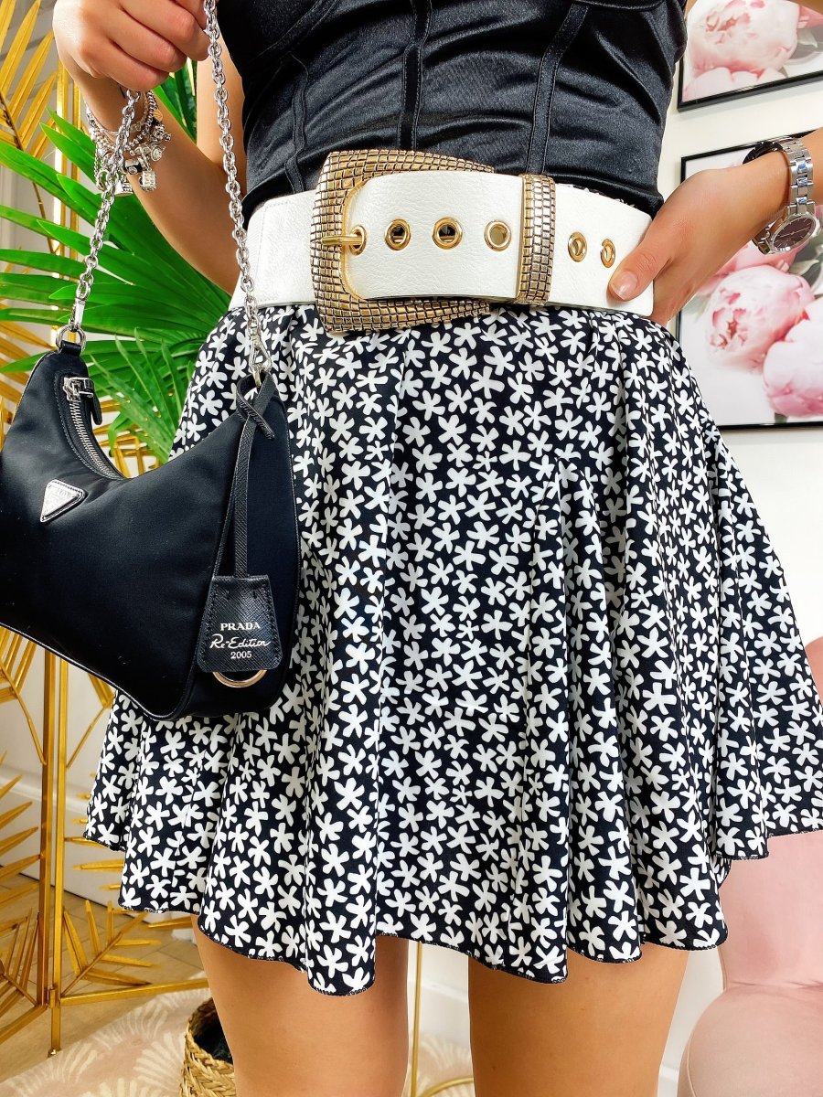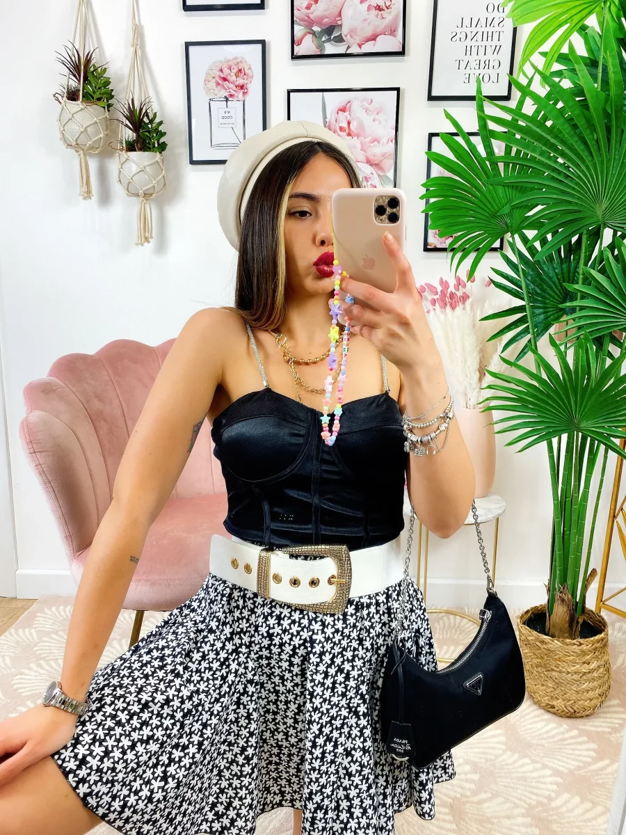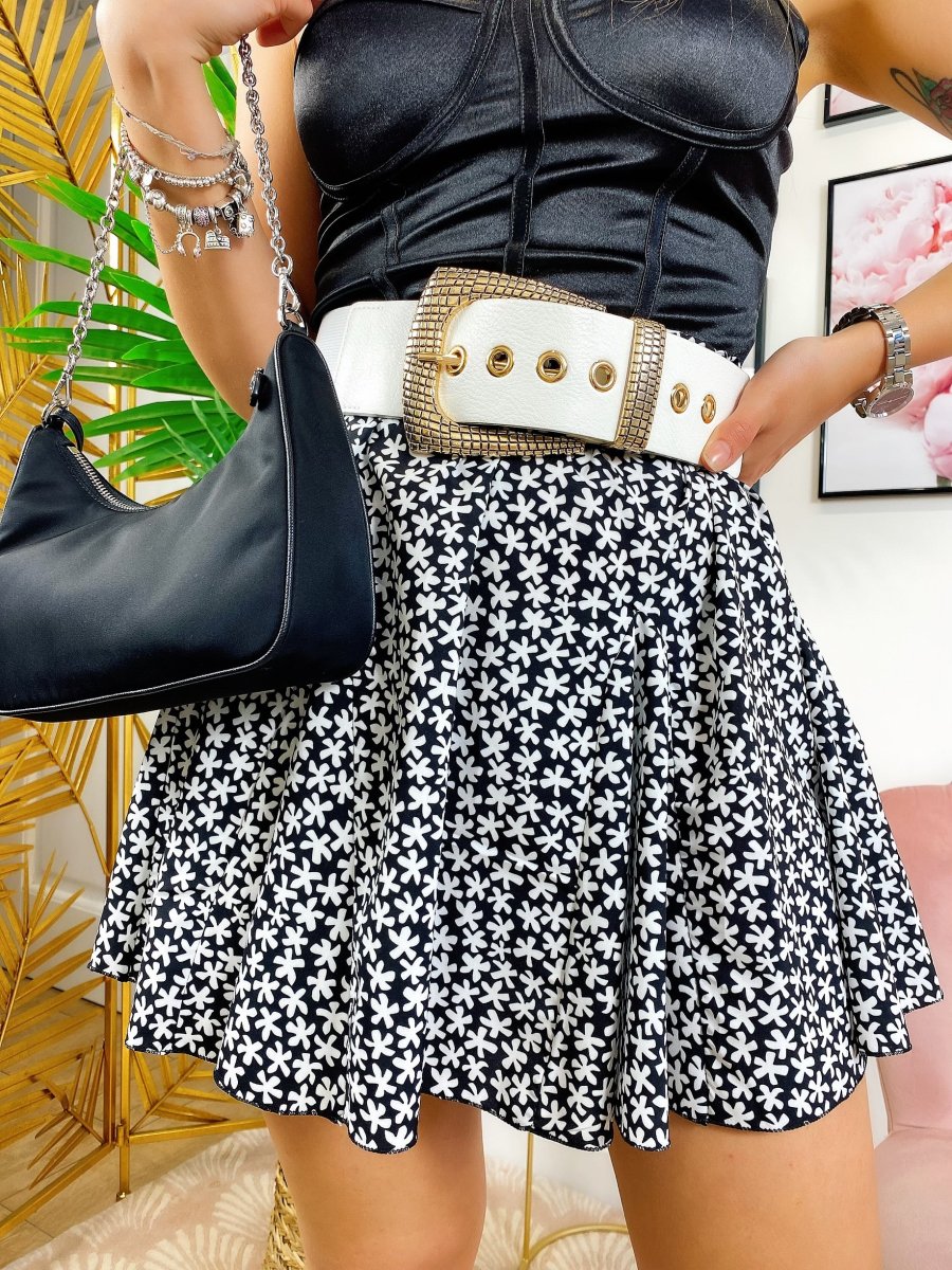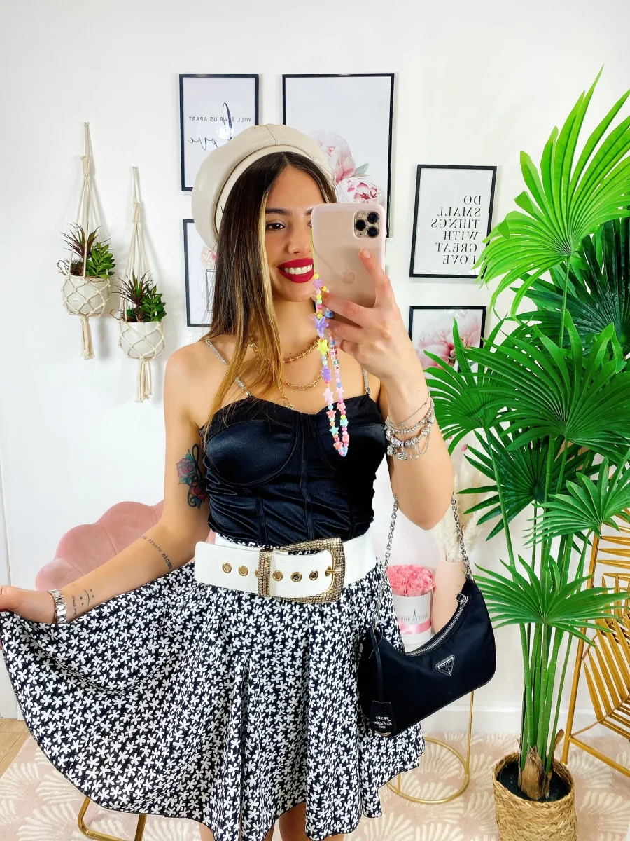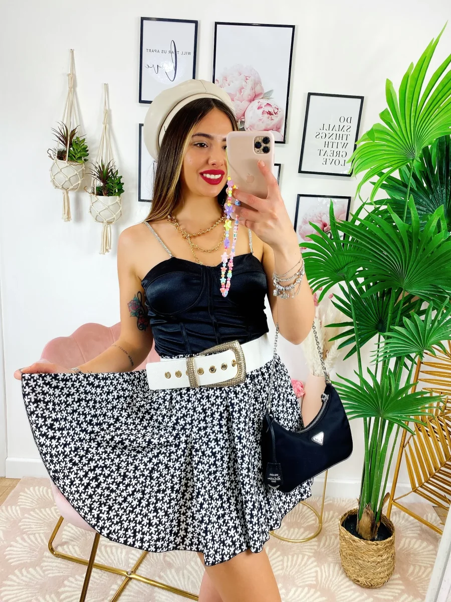 Gonna con elastico in vita e fiorellini bianchi.