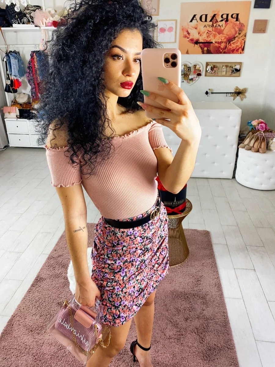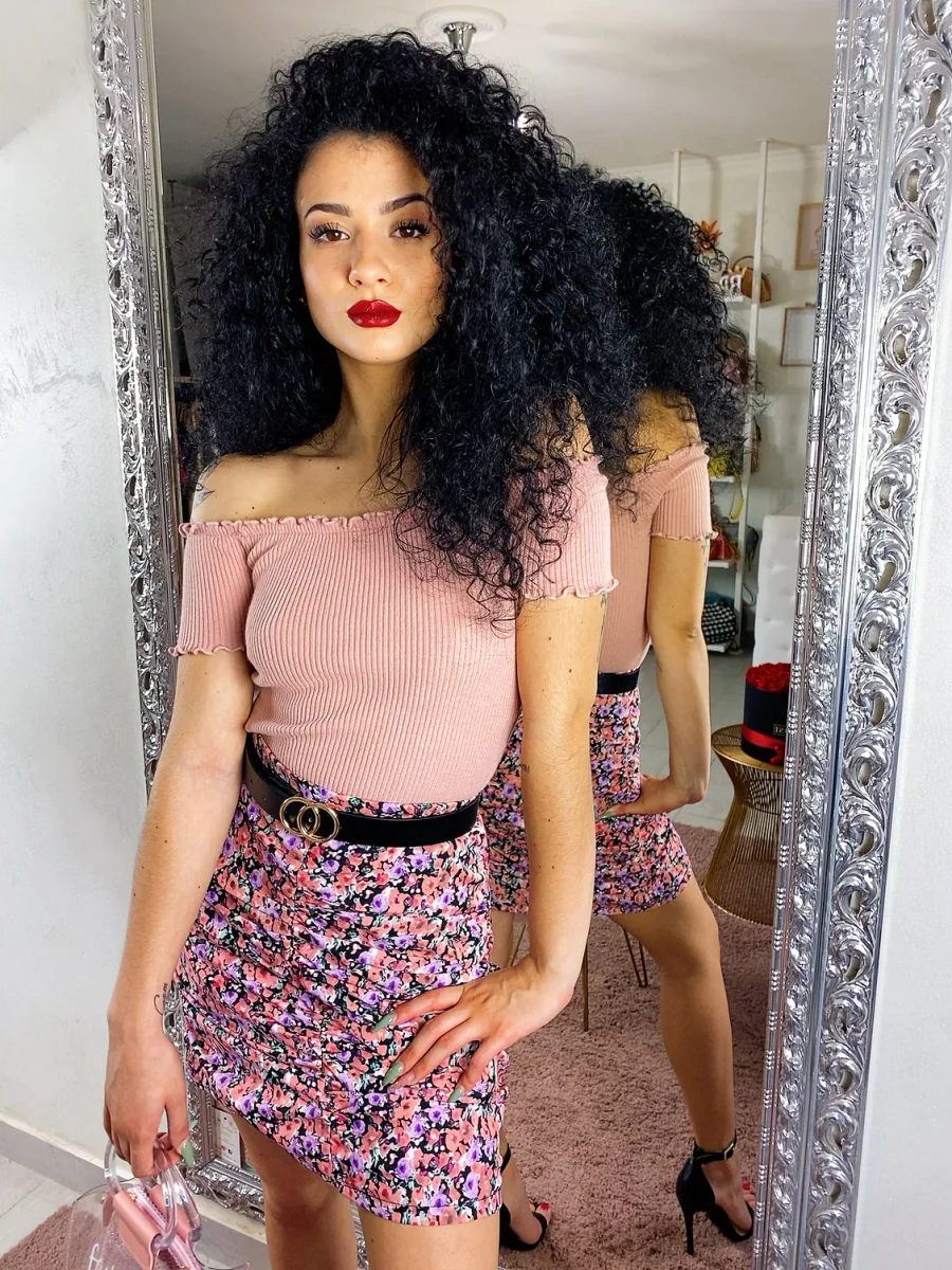 Gonna a stampa fiorata con arricciatura davanti e dietro. Chiusura con zip