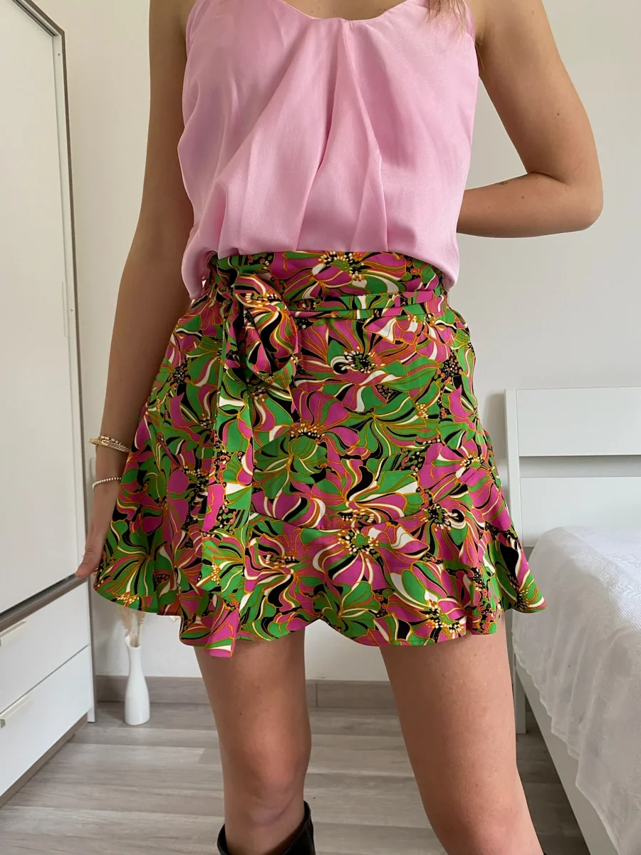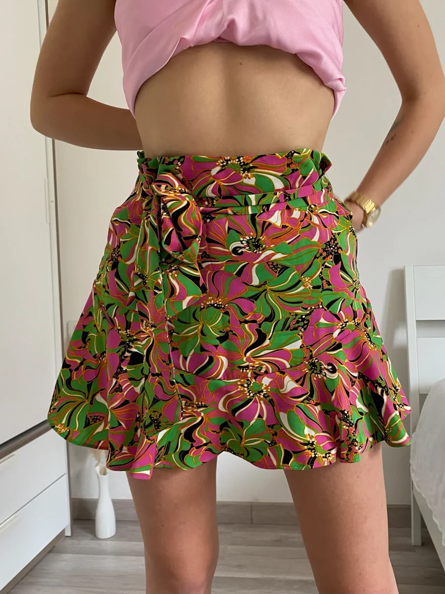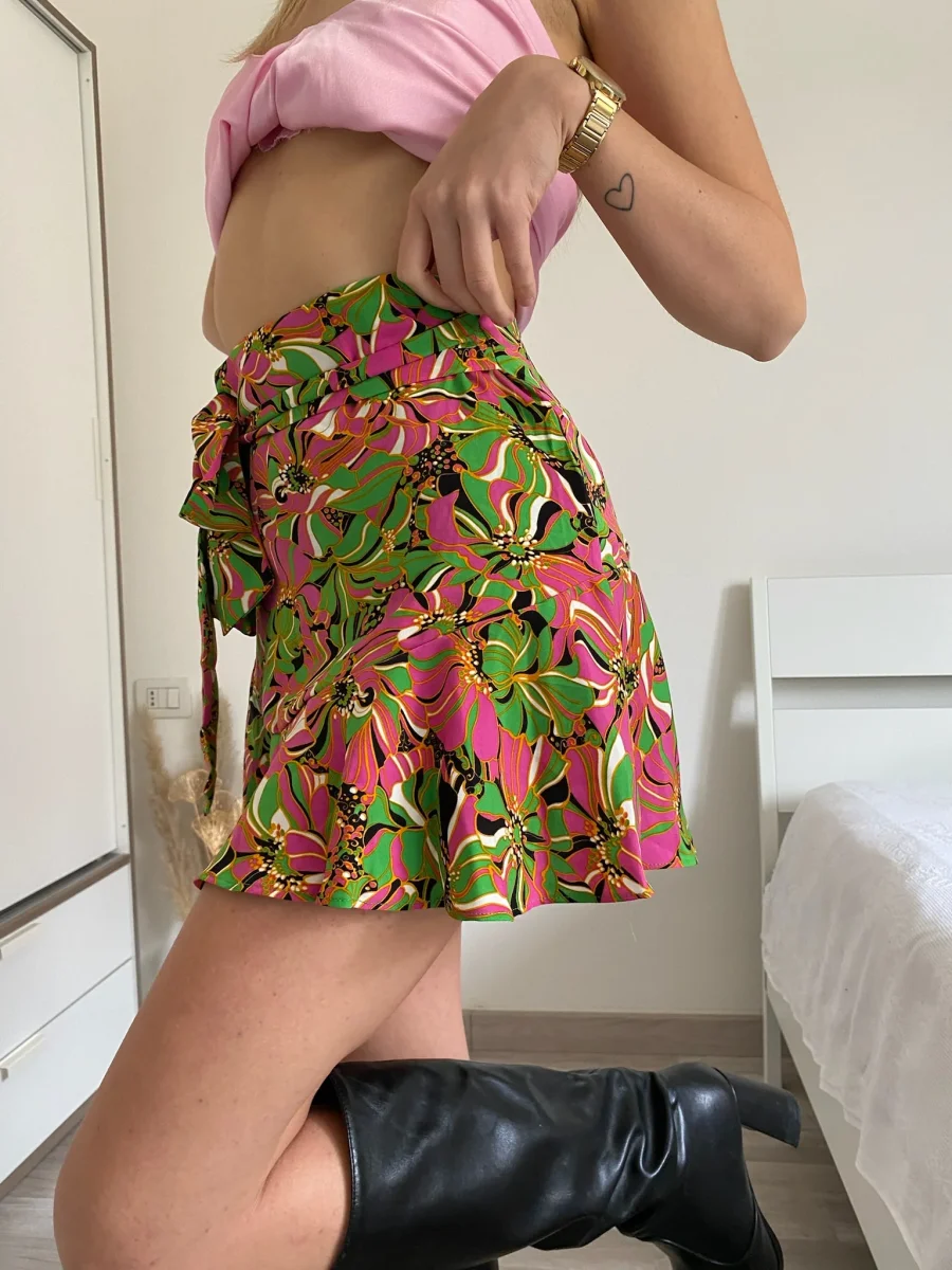 Gonna con taglio irregolari con fantasia floreale con cintura in vita tono su tono