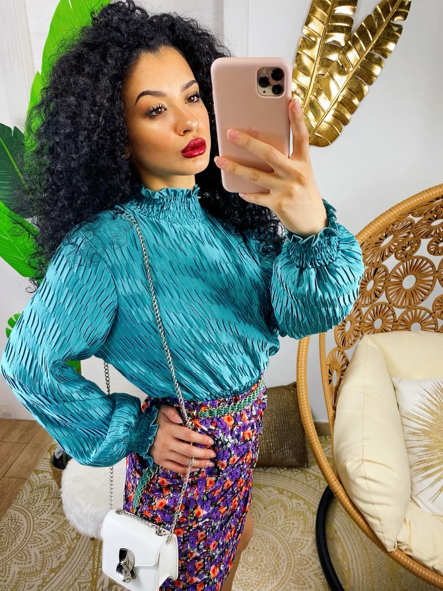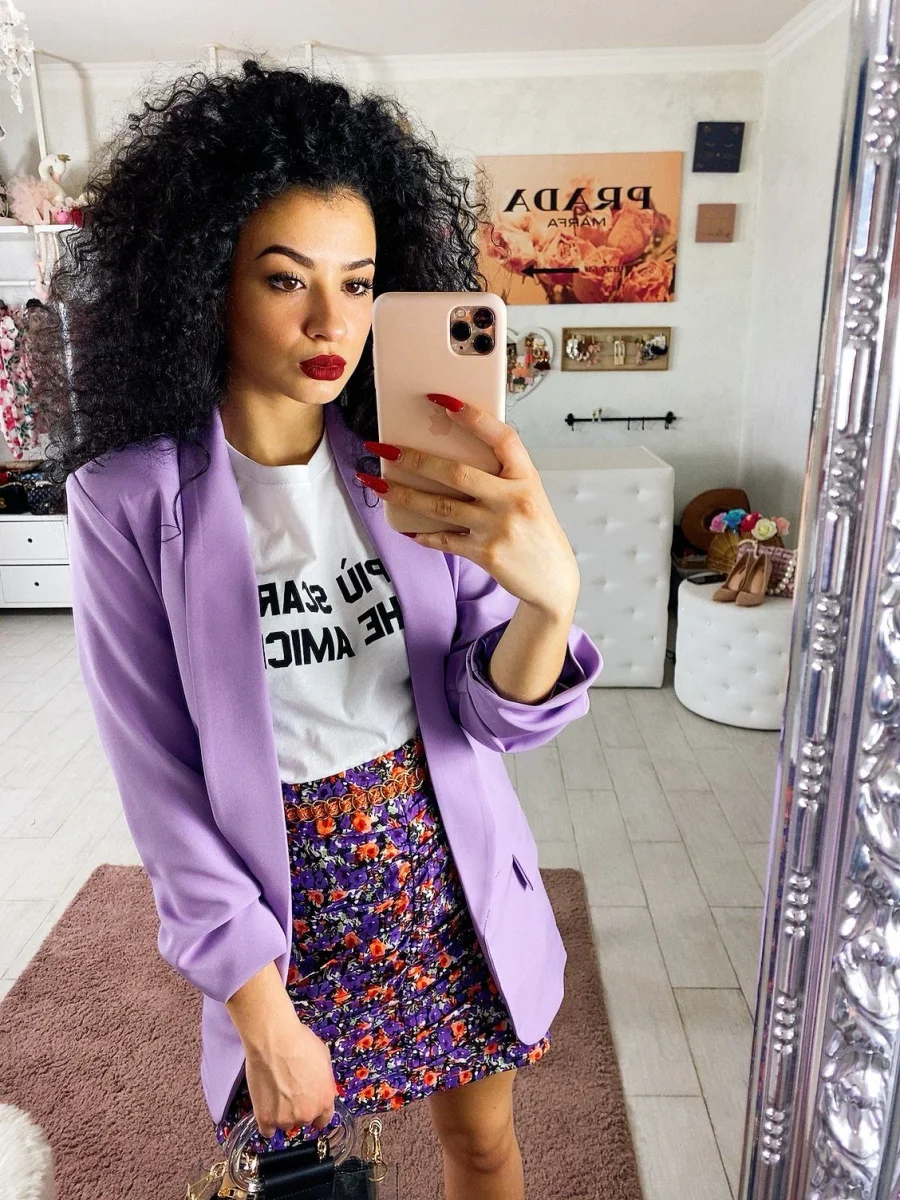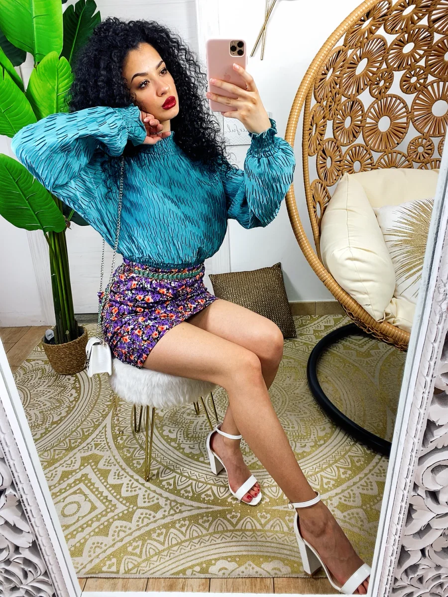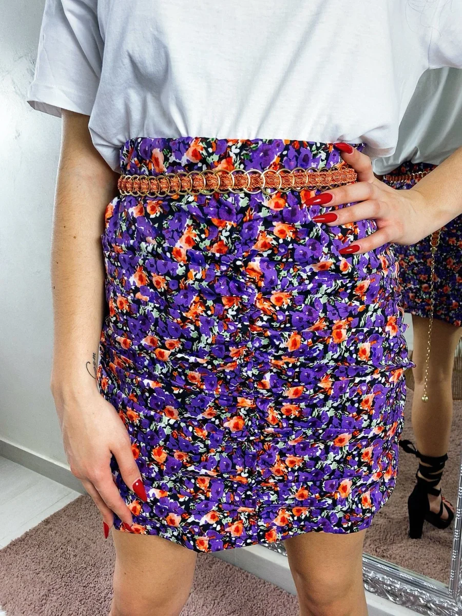Gonna donna in tessuto elasticizzato con chiusura con zip. Arricciata e in stampa a fiorellini sui toni del lilla.