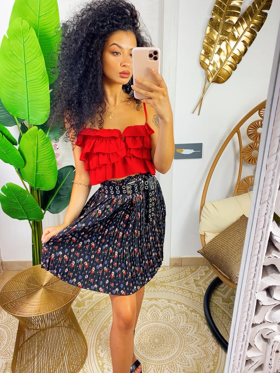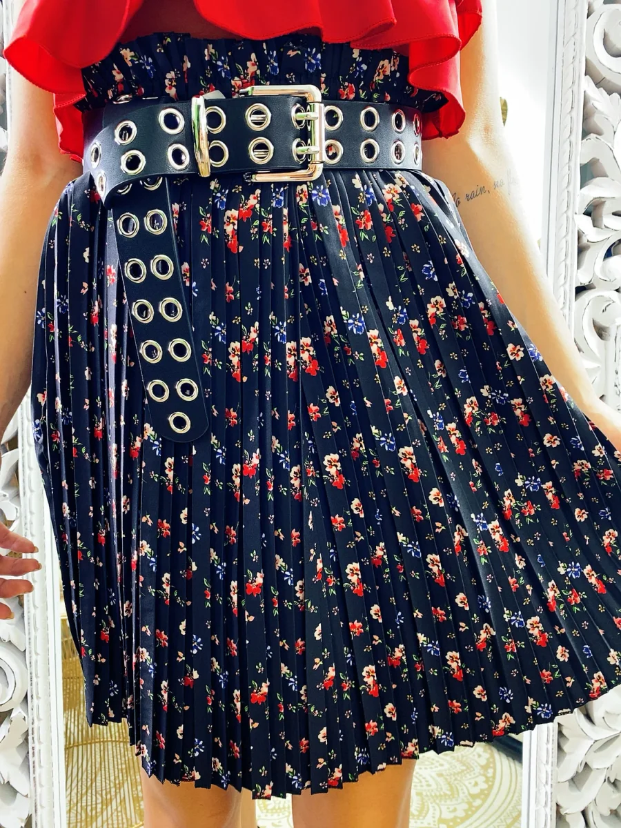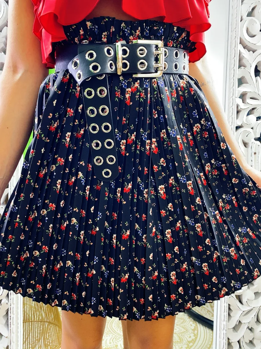 Gonna a pieghine nera con fiorellini sui toni del rosso. Elastico in vita