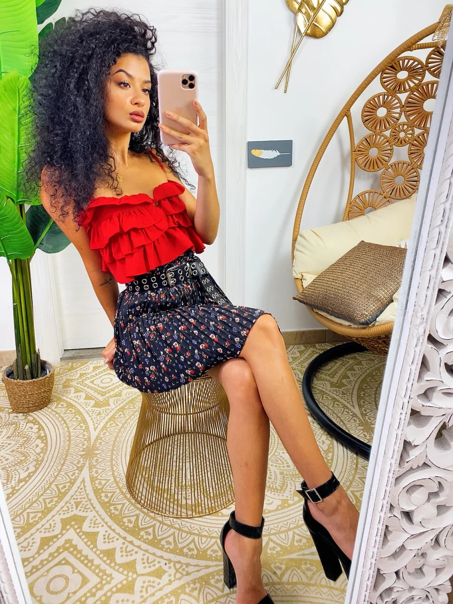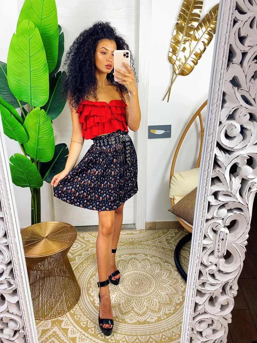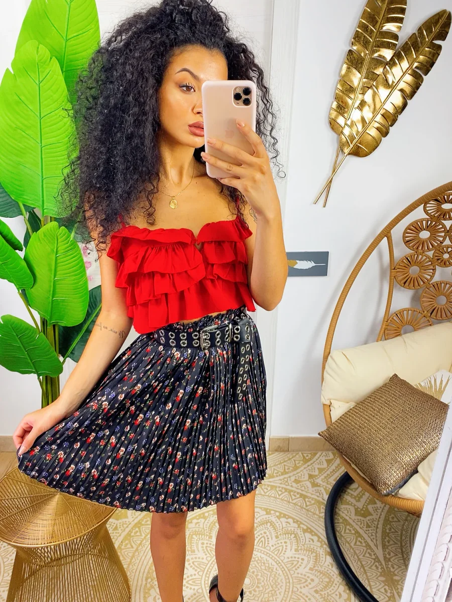 Gonna a pieghine nera con fiorellini sui toni del rosso. Elastico in vita