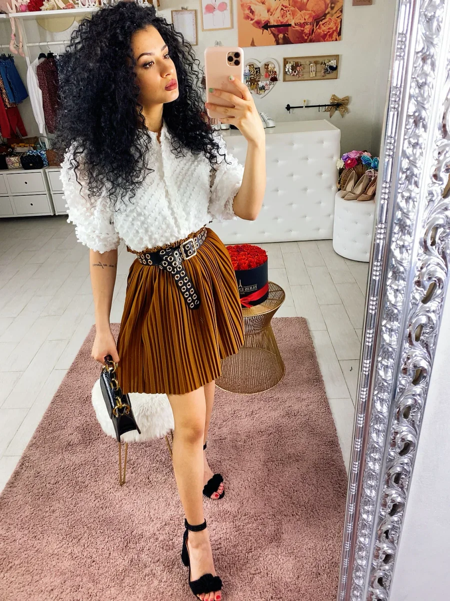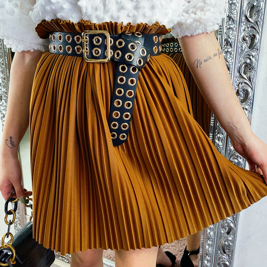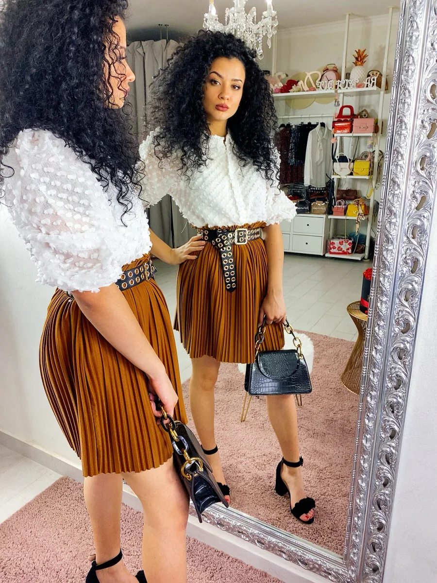 Gonna in tessuto rigido, elasticizzato in vita. Bellissima con queste pieghine. Abbinala con una cintura