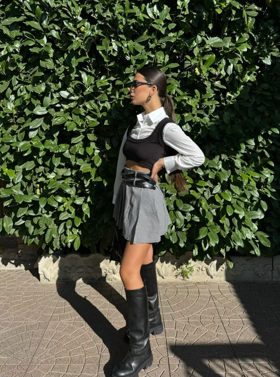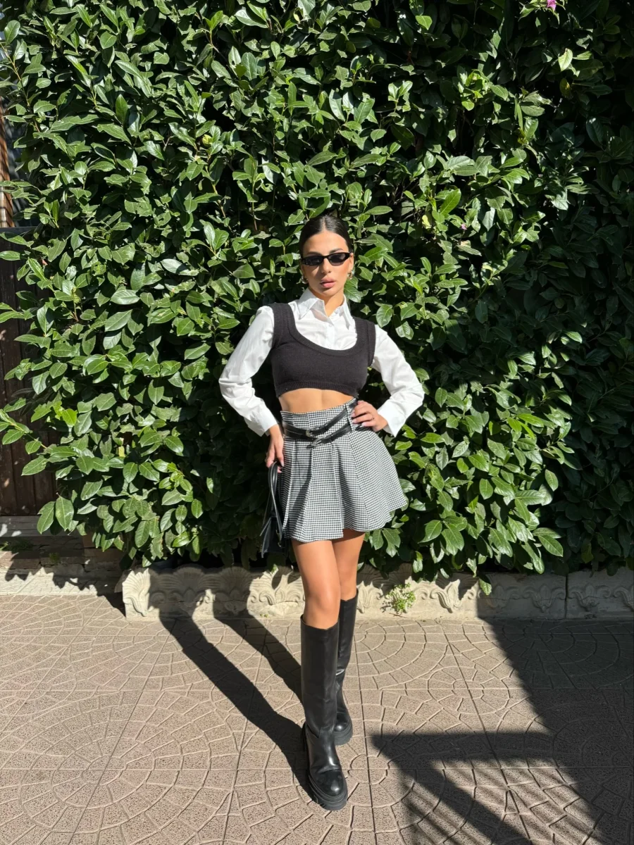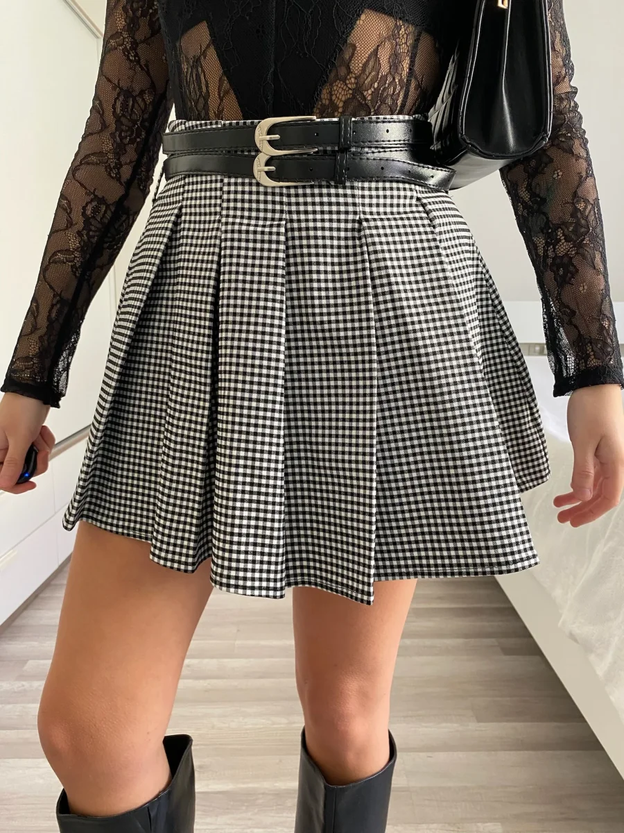 Gonna a pieghine con doppia cintura nera, chiusura con zip. In foto taglia s