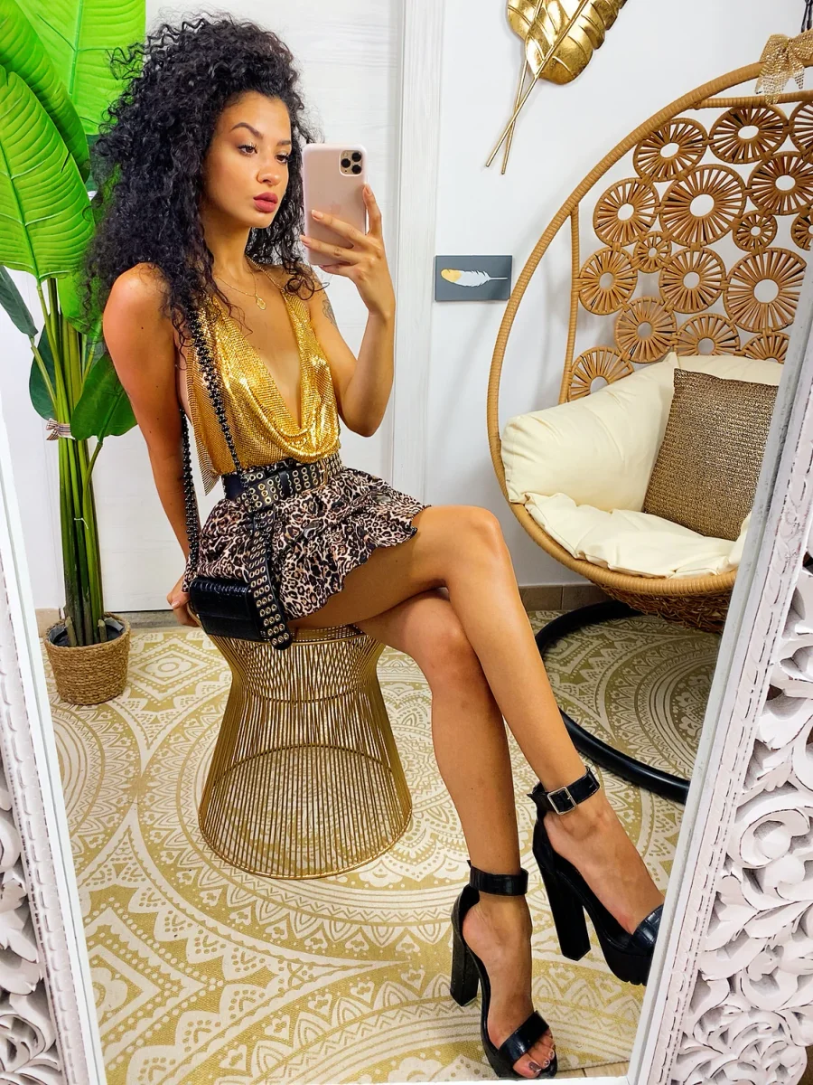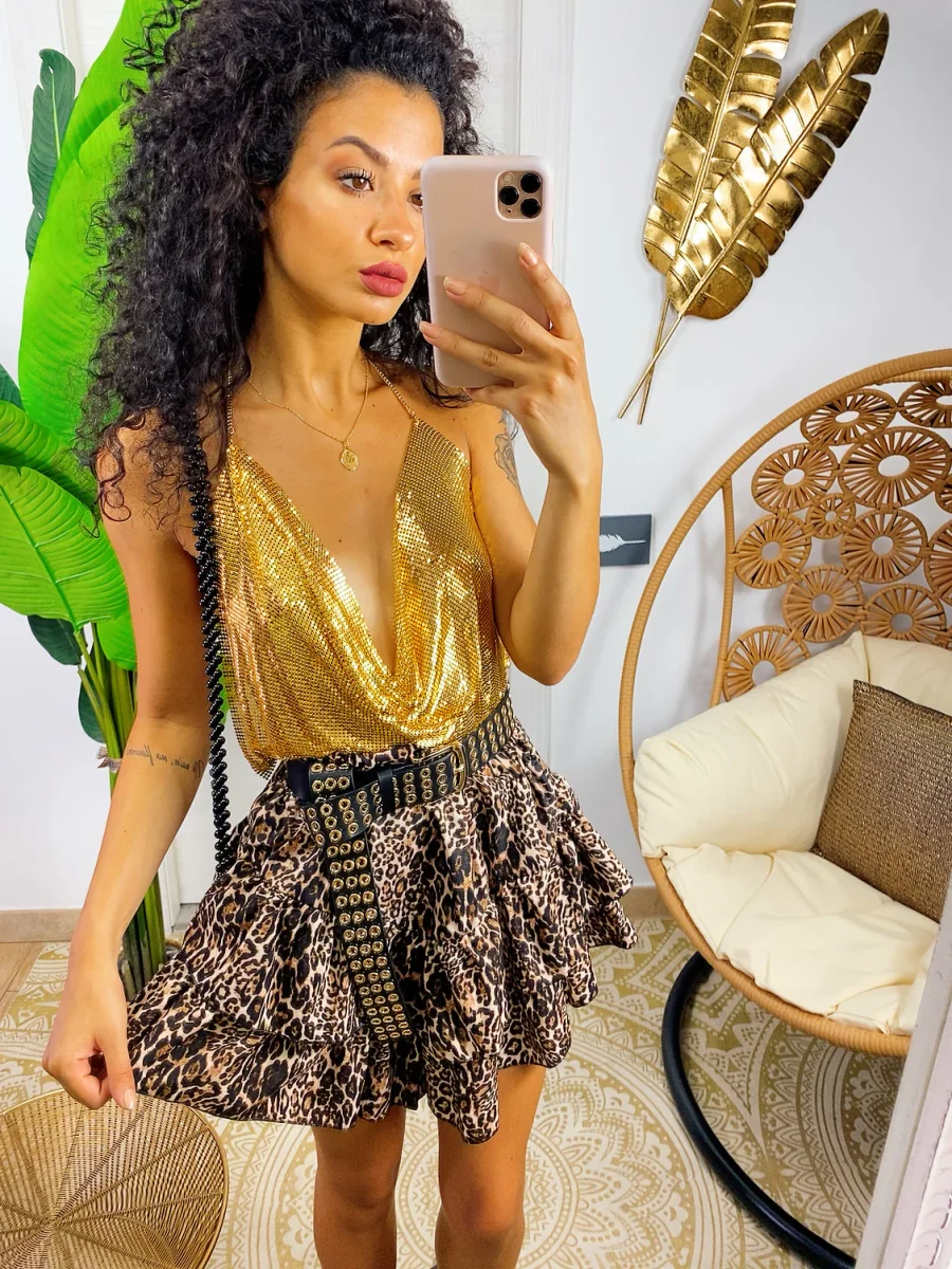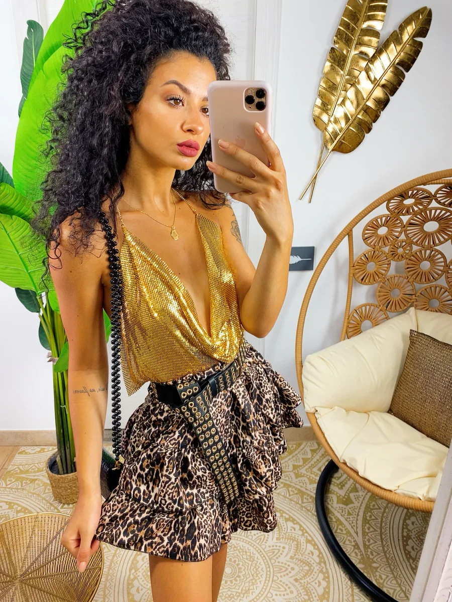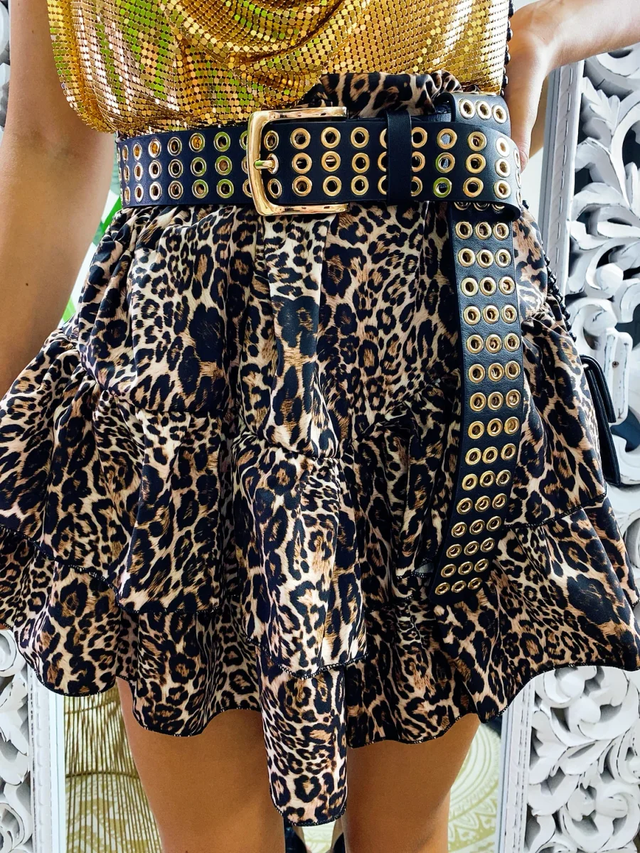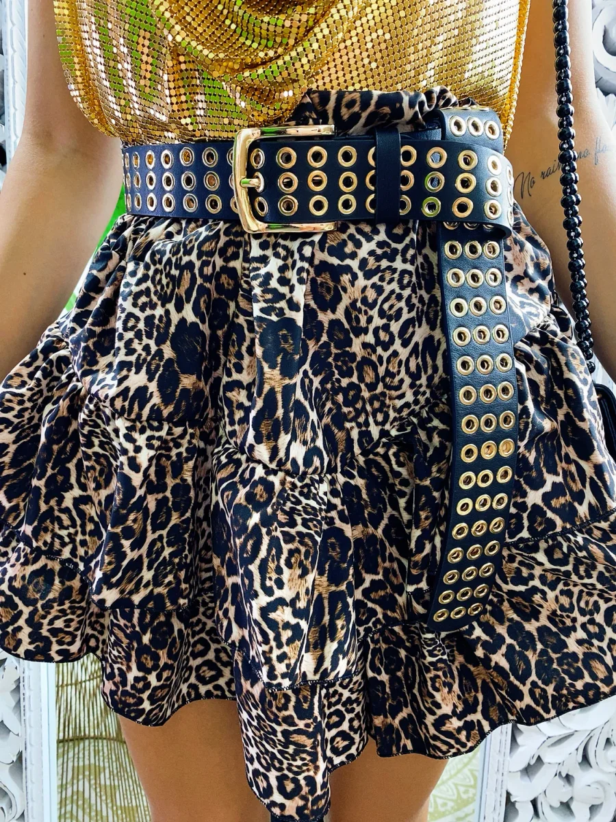 Gonna a balze asimmetrica con stampa maculata vestibilità corta sui lati. Stampa sempre attuale.