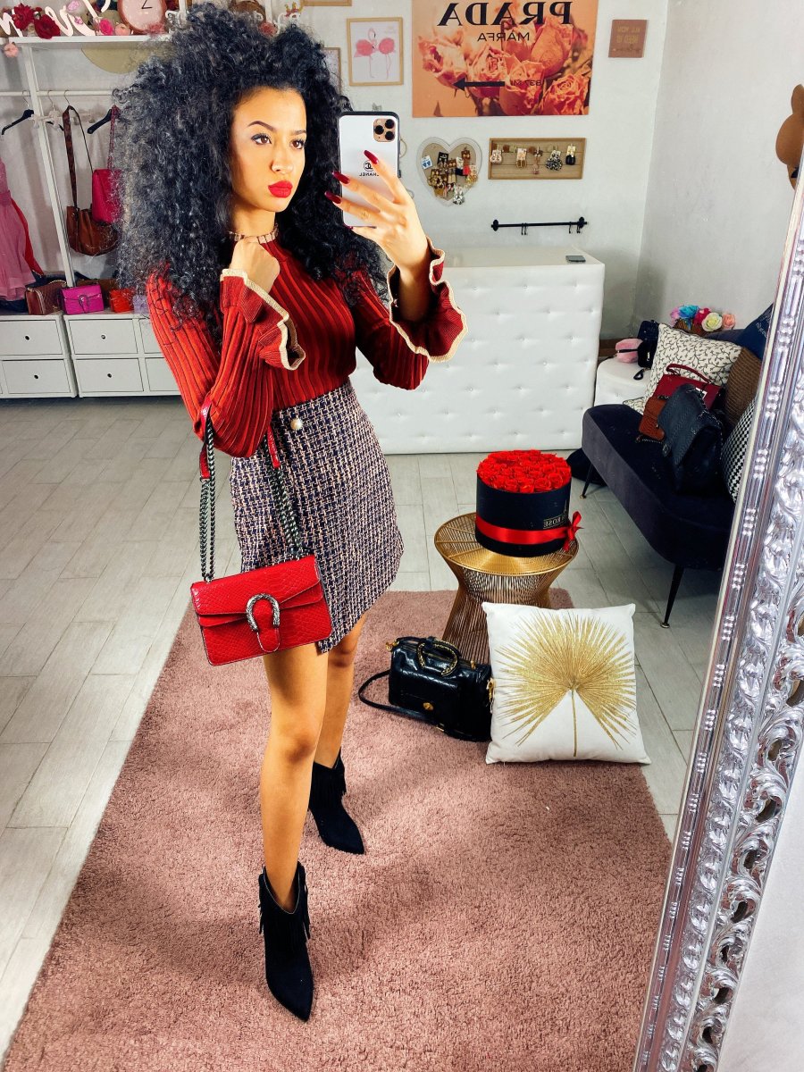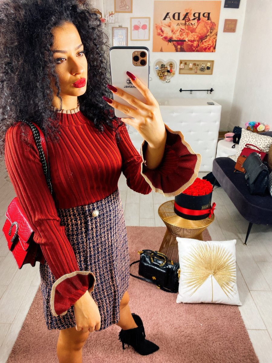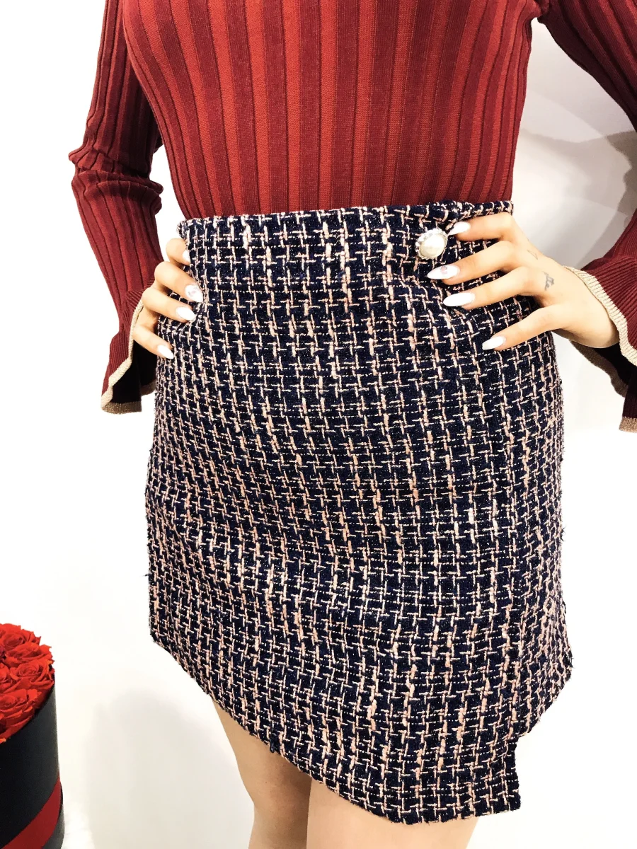 Gonna in tweed trama bianca e nera. Dettaglio nel bottoncino