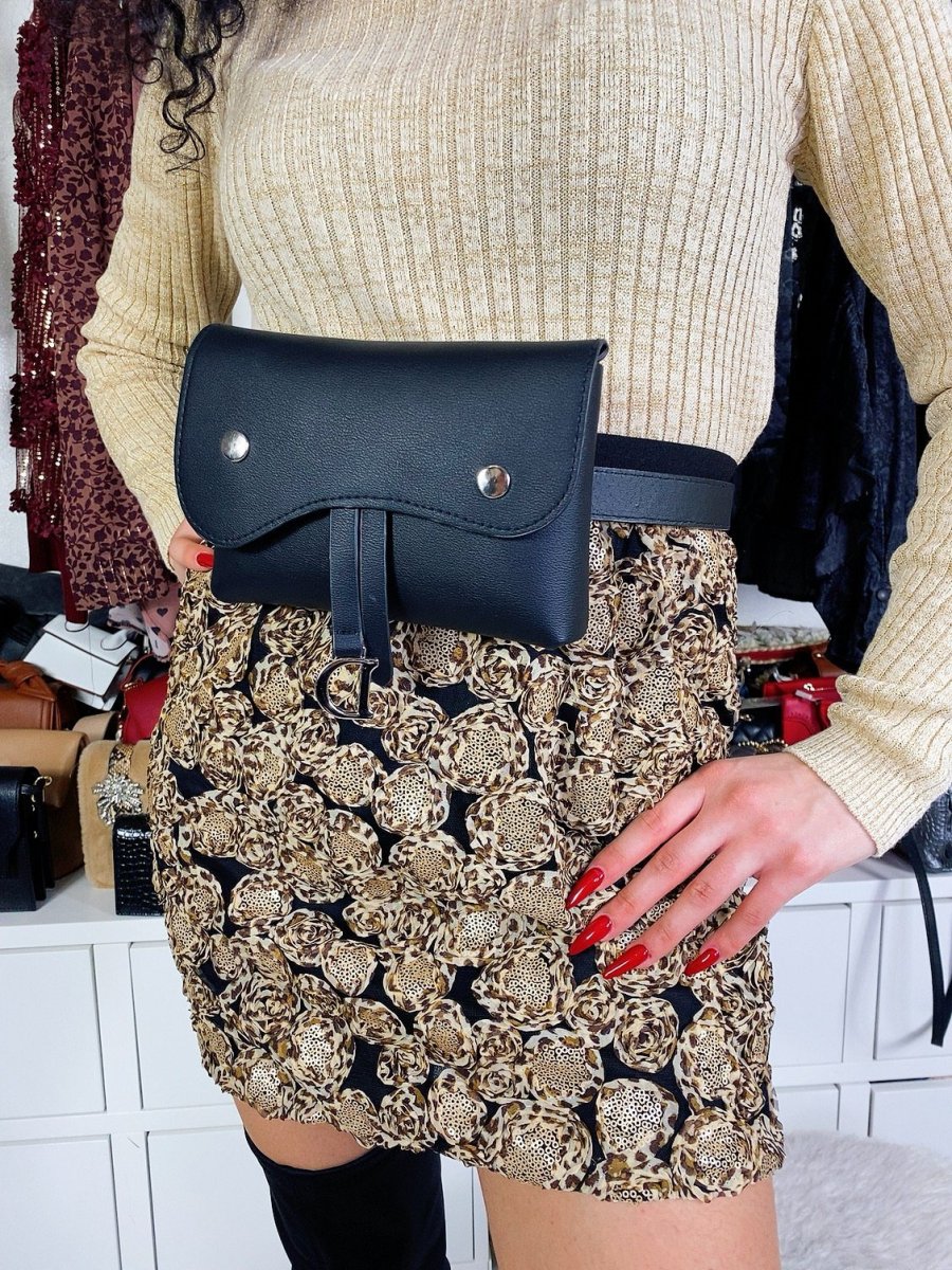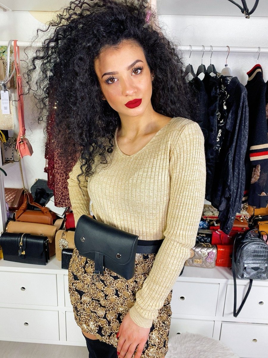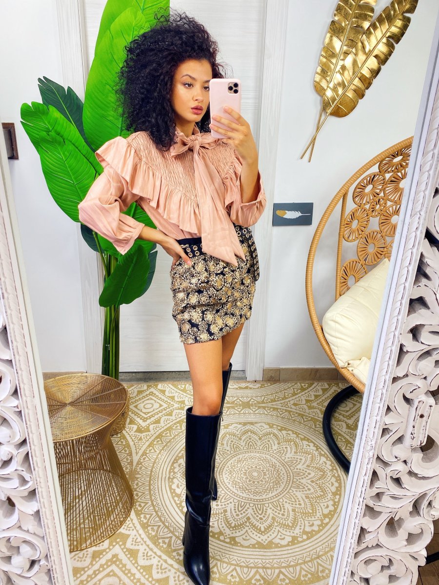 Gonna elasticizzata con rose ricamate 3d. Tono su tono gold. Vestibilità piccola