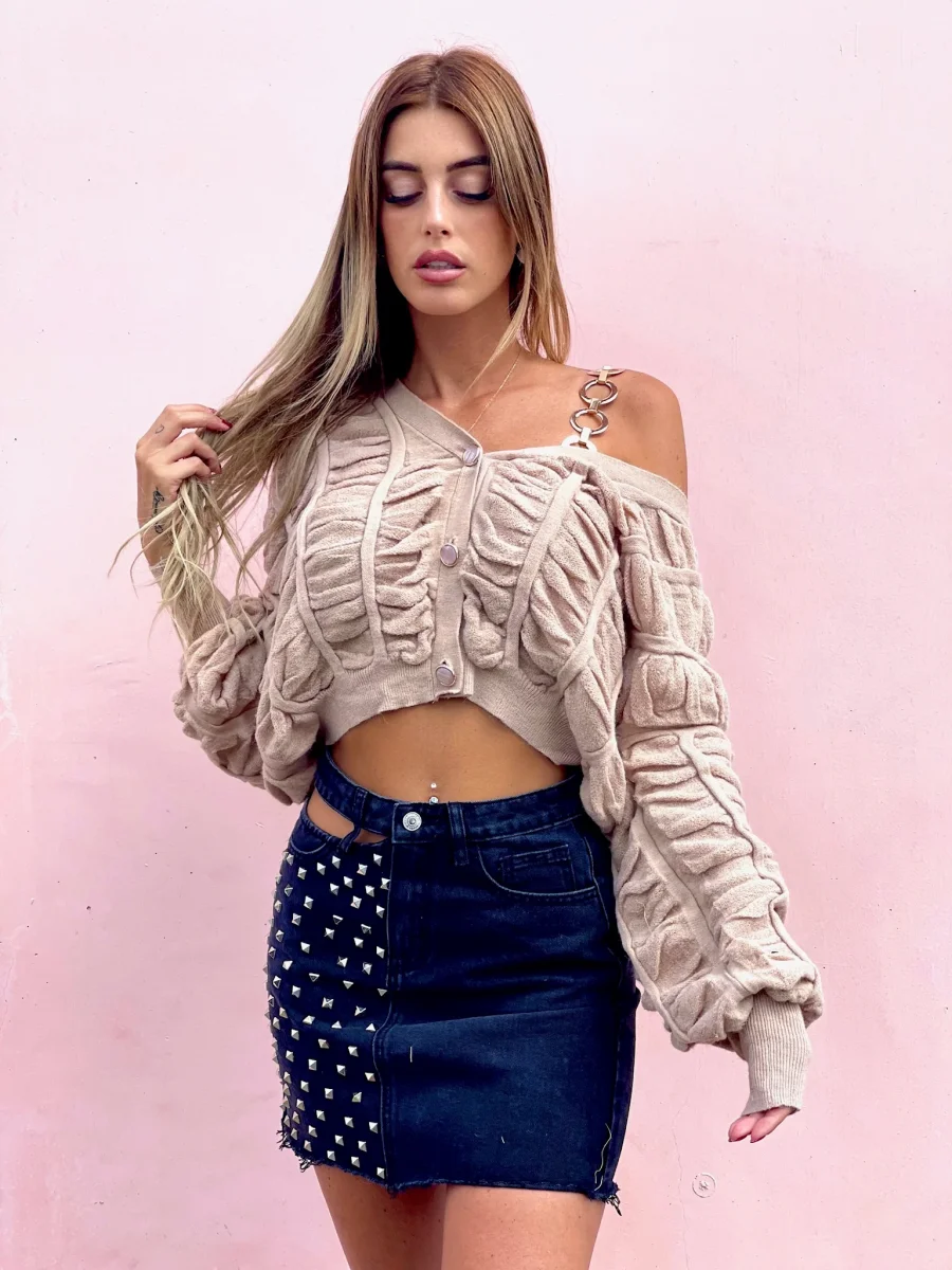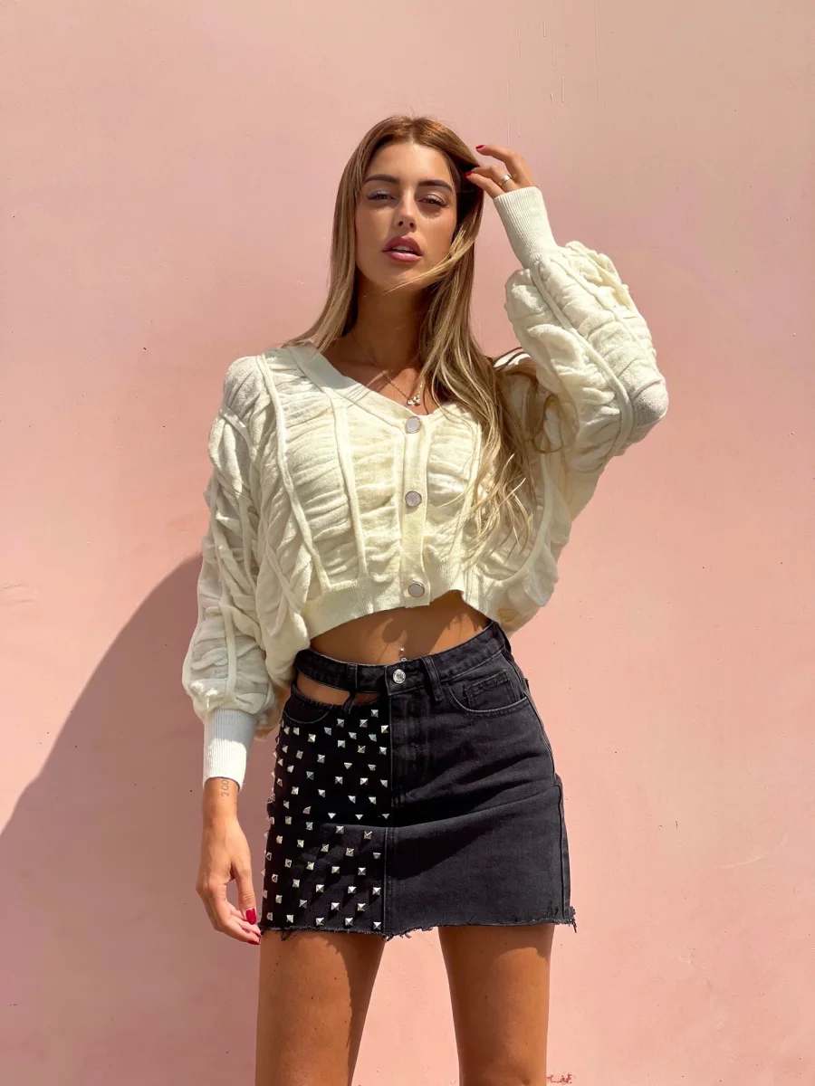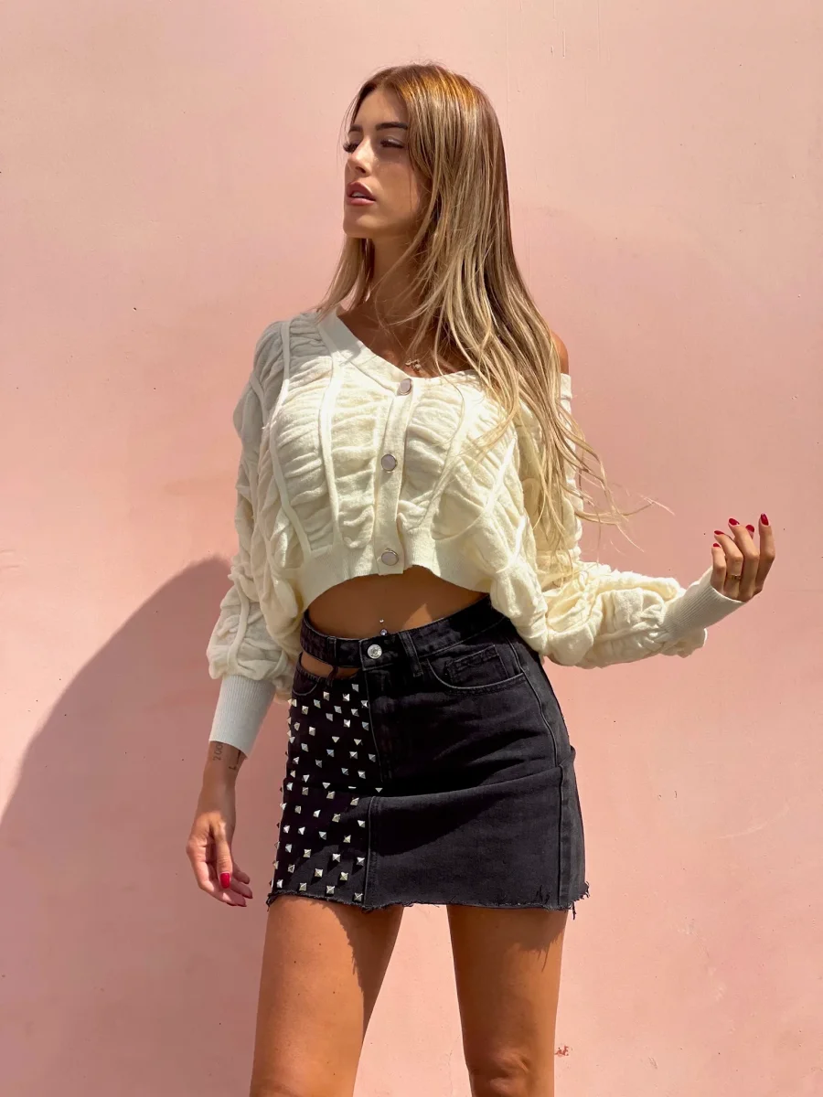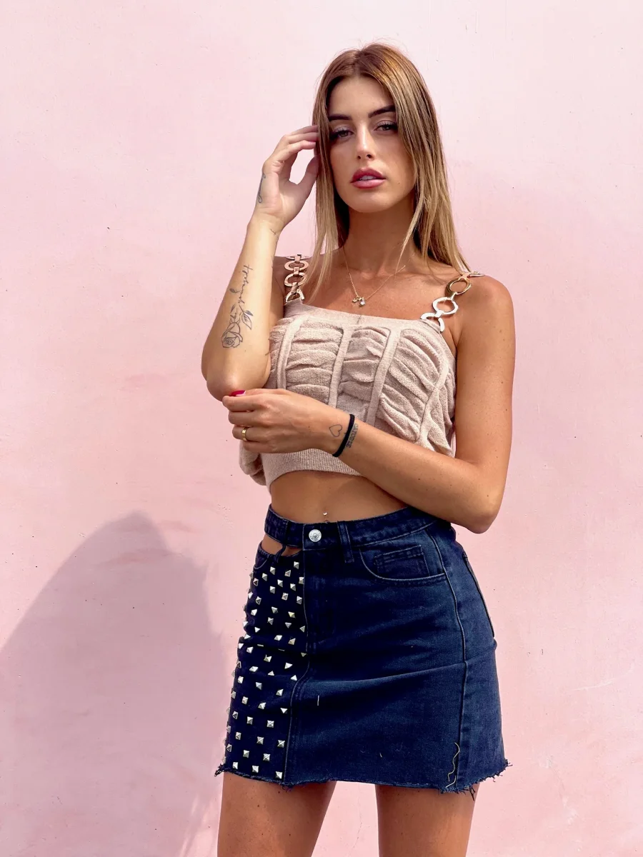 Gonna in jeans non elasticizzata dalla vestibilità piccola. Borchie sul davanti e dettaglio trasparenza