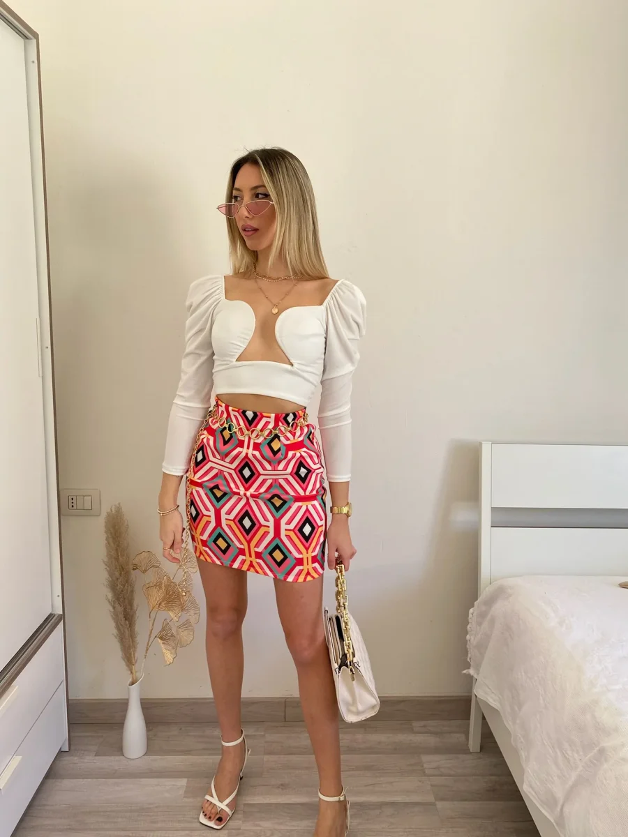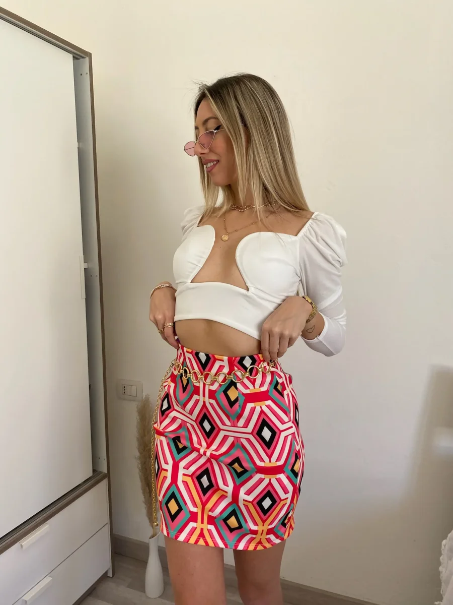 Gonna completamente elasticizzata in stampa geometrica colorata.