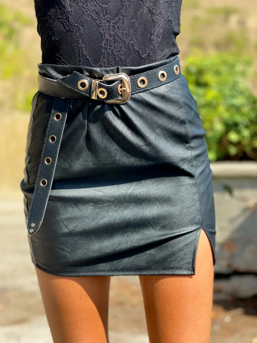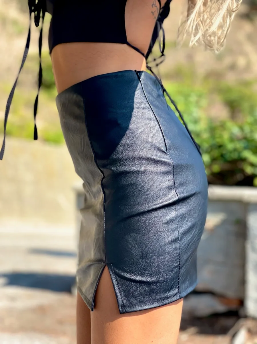 Gonna in ecopelle con chiusura con zip semplice e lineare con un piccolo spacchetto sul fondo.