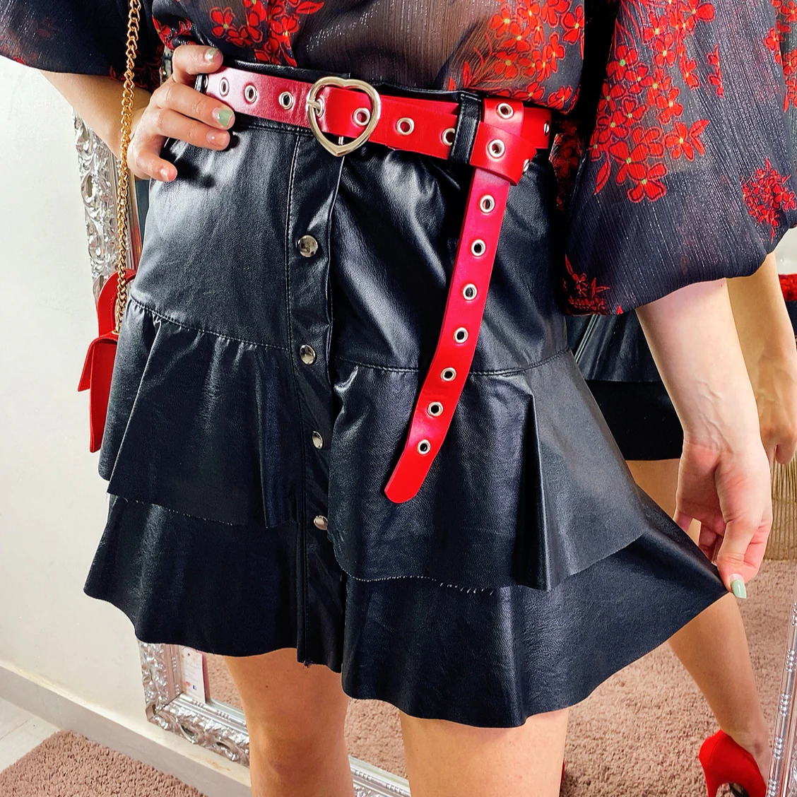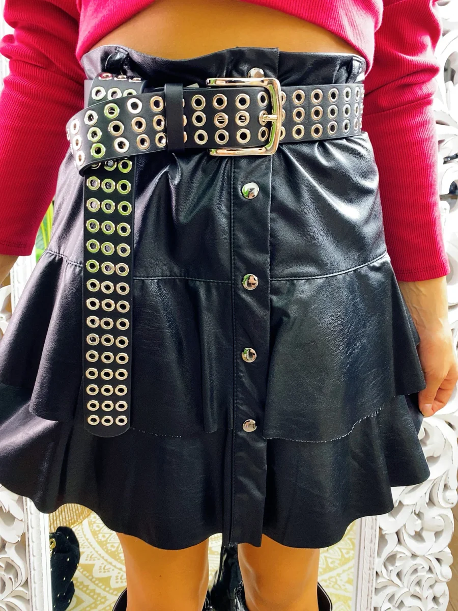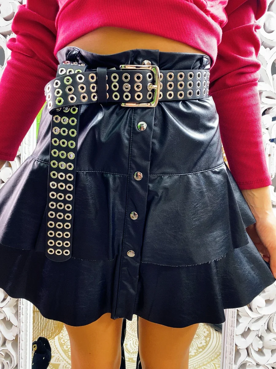 Gonna in eco pelle con balze e chiusura con bottoncini. Tessuto leggermente elasticizzato vestibilità piccola