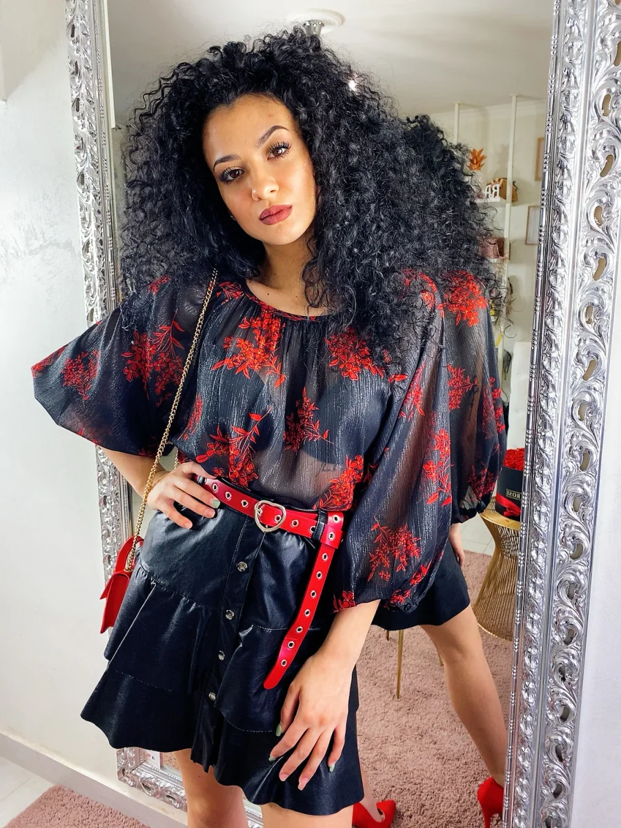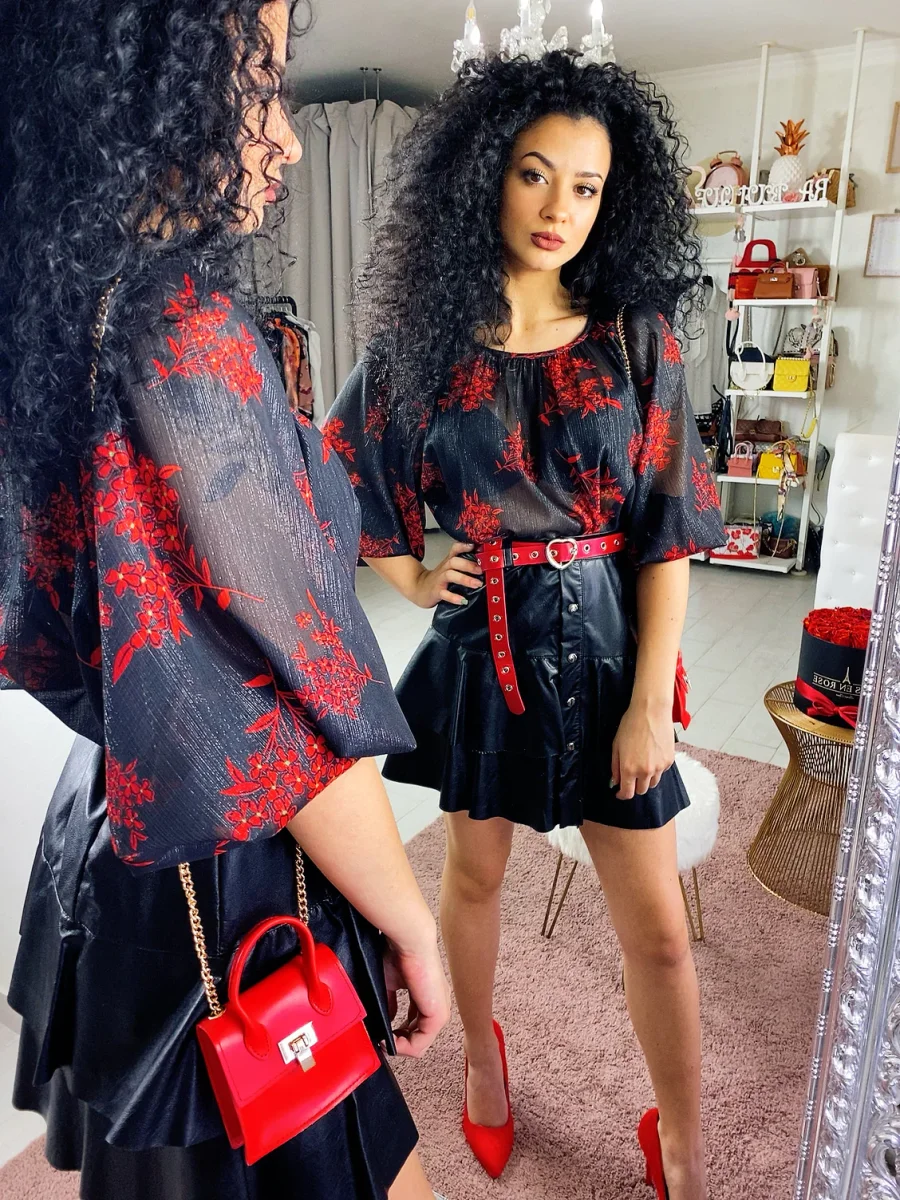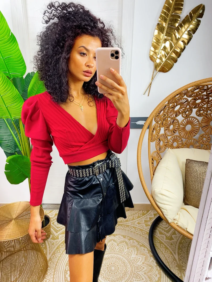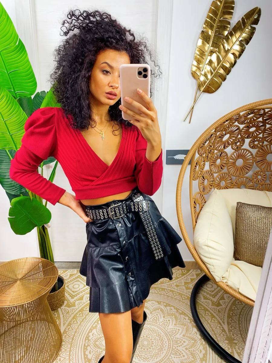 Gonna in eco pelle con balze e chiusura con bottoncini. Tessuto leggermente elasticizzato vestibilità piccola