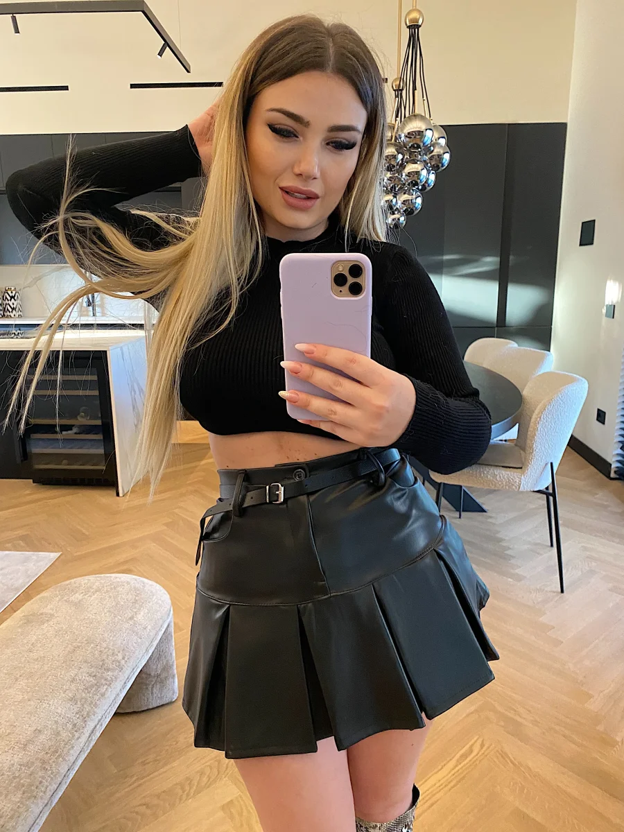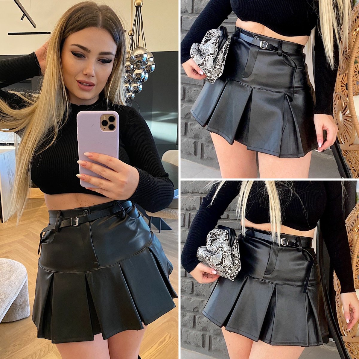 Gonna in ecopelle con cintura e pieghe In tessuto elasticizzato, balze sul finale e cintura inclusa