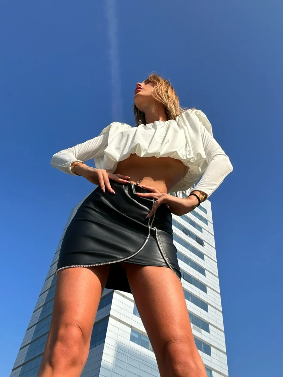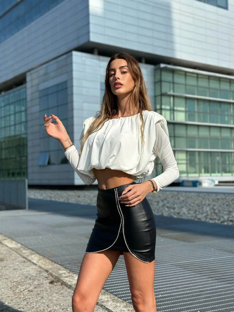 Gonna in ecopelle con elastico in vita, strass sul davanti