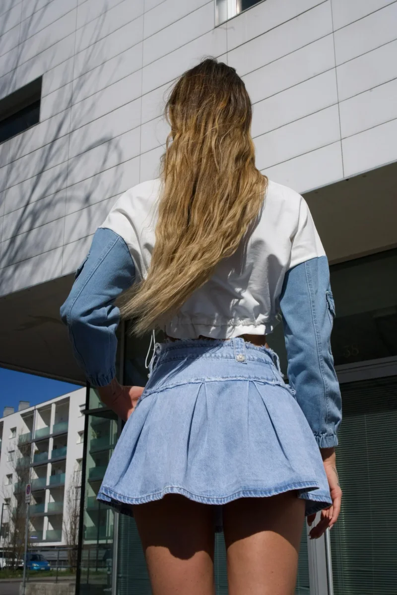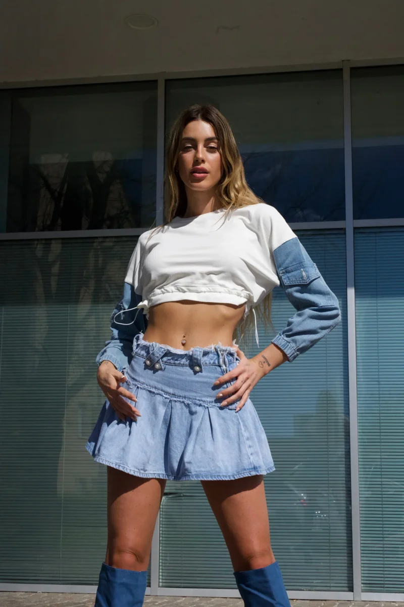 Gonna in jeans in tessuto elasticizzato con zip e bottoni in perle. Vestibilità regolare. In foto taglia XS