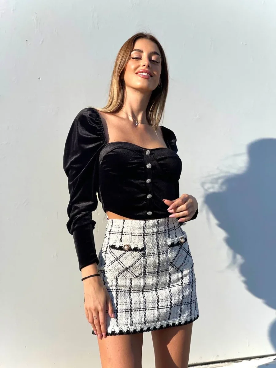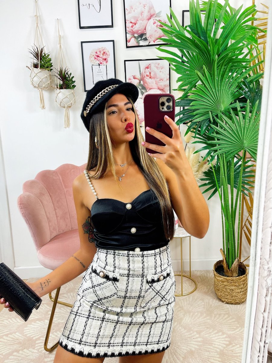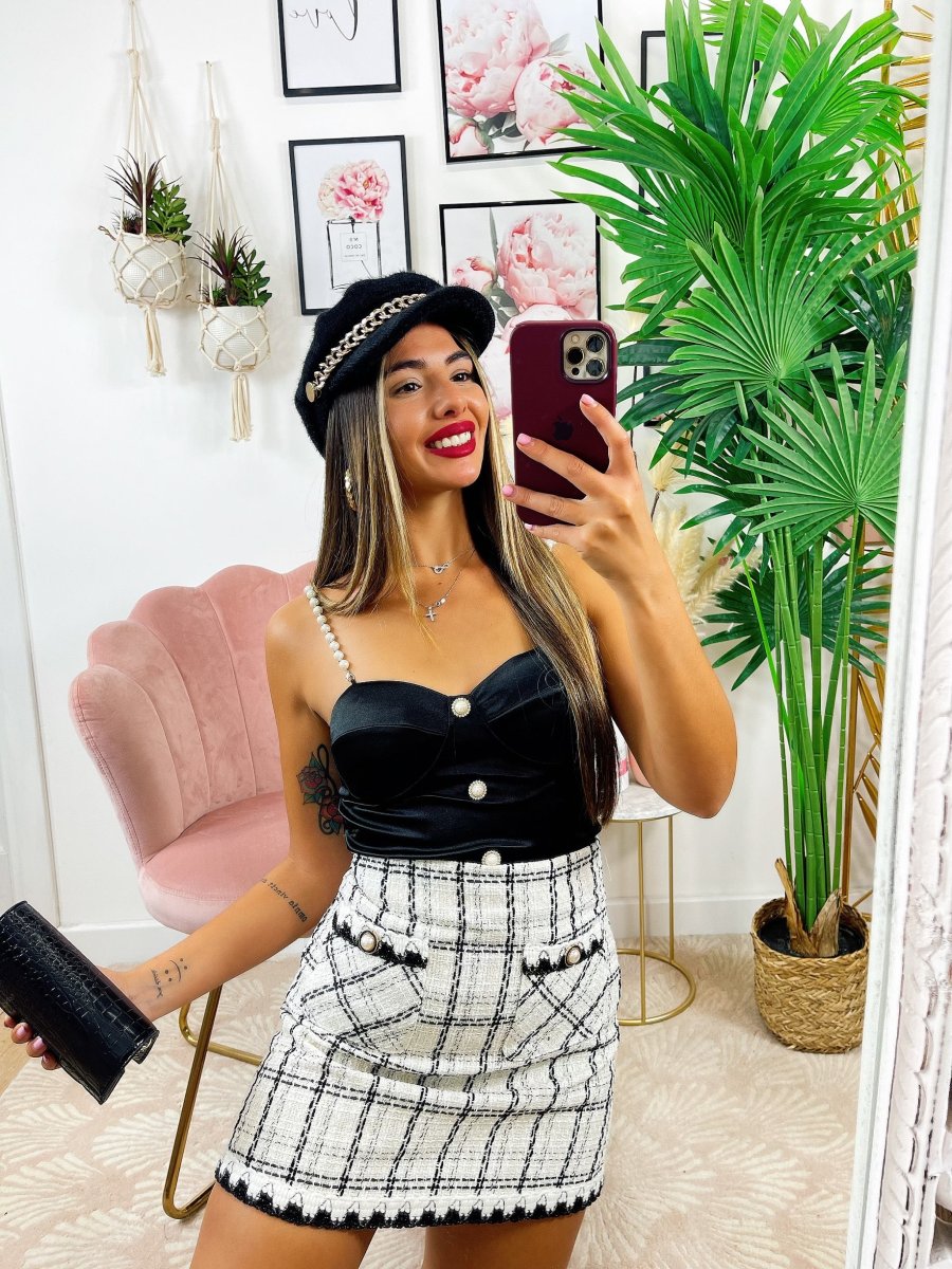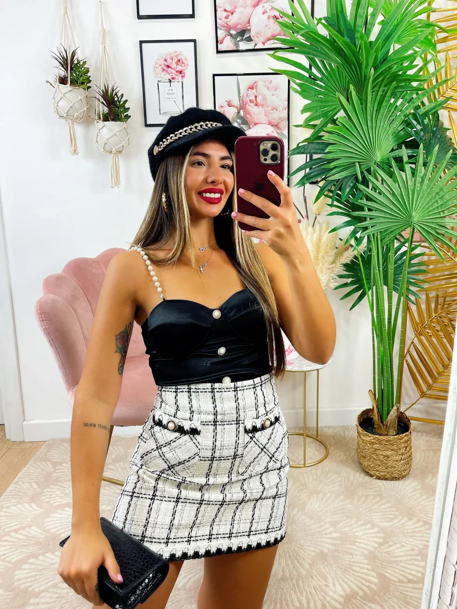 Gonna in tweed Leggermente elasticizzata con dettaglio gioiello. Tra le mezze taglie prendere quella più grande.