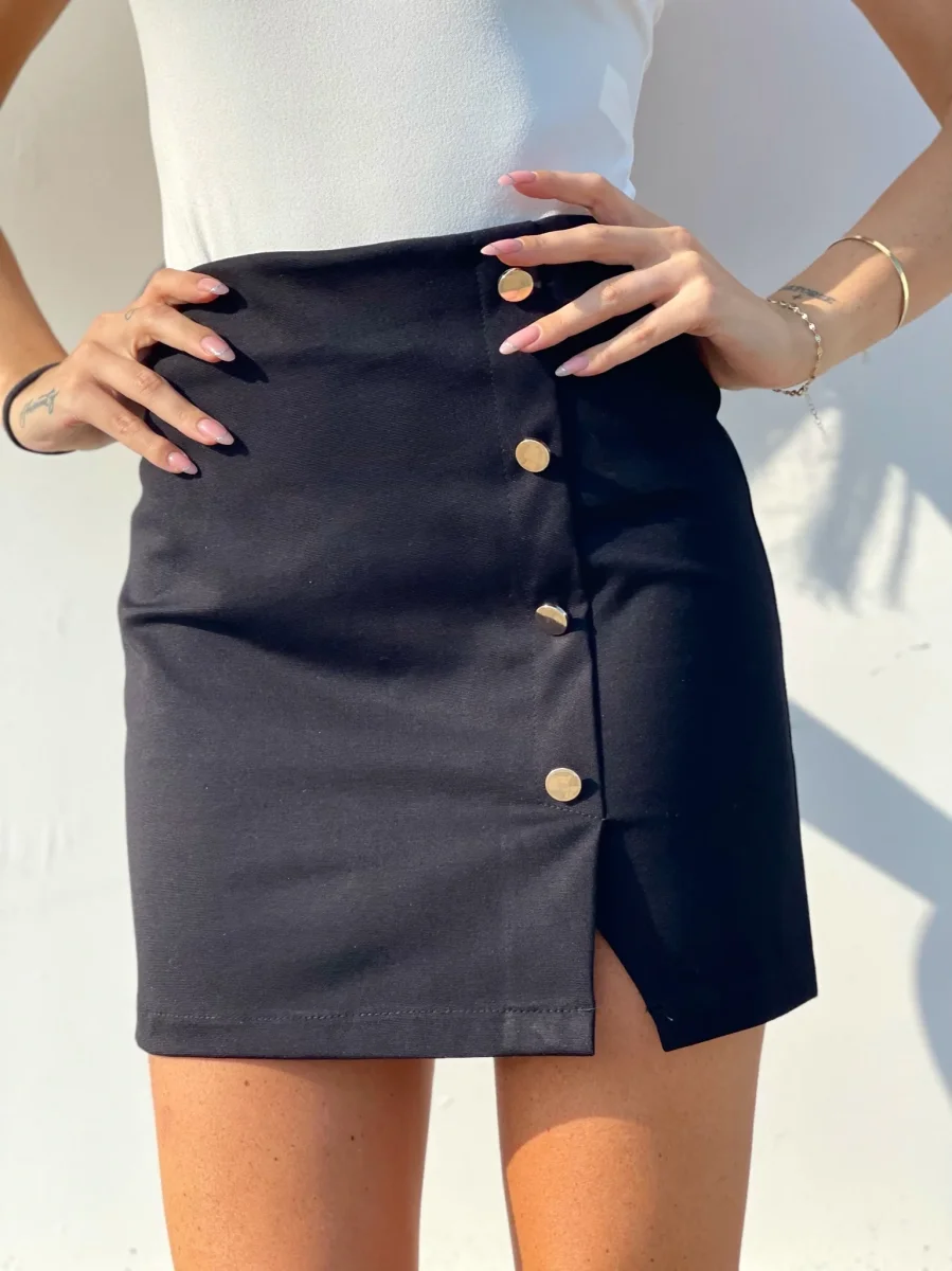 Gonna stretching aderente nera con bottoncini oro sul davanti. Vestibilità regolare