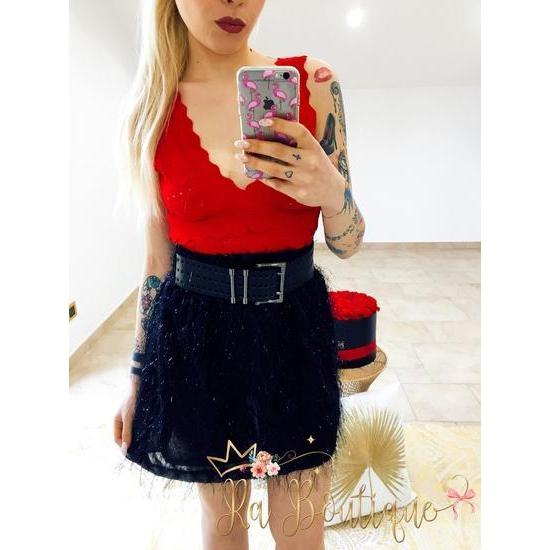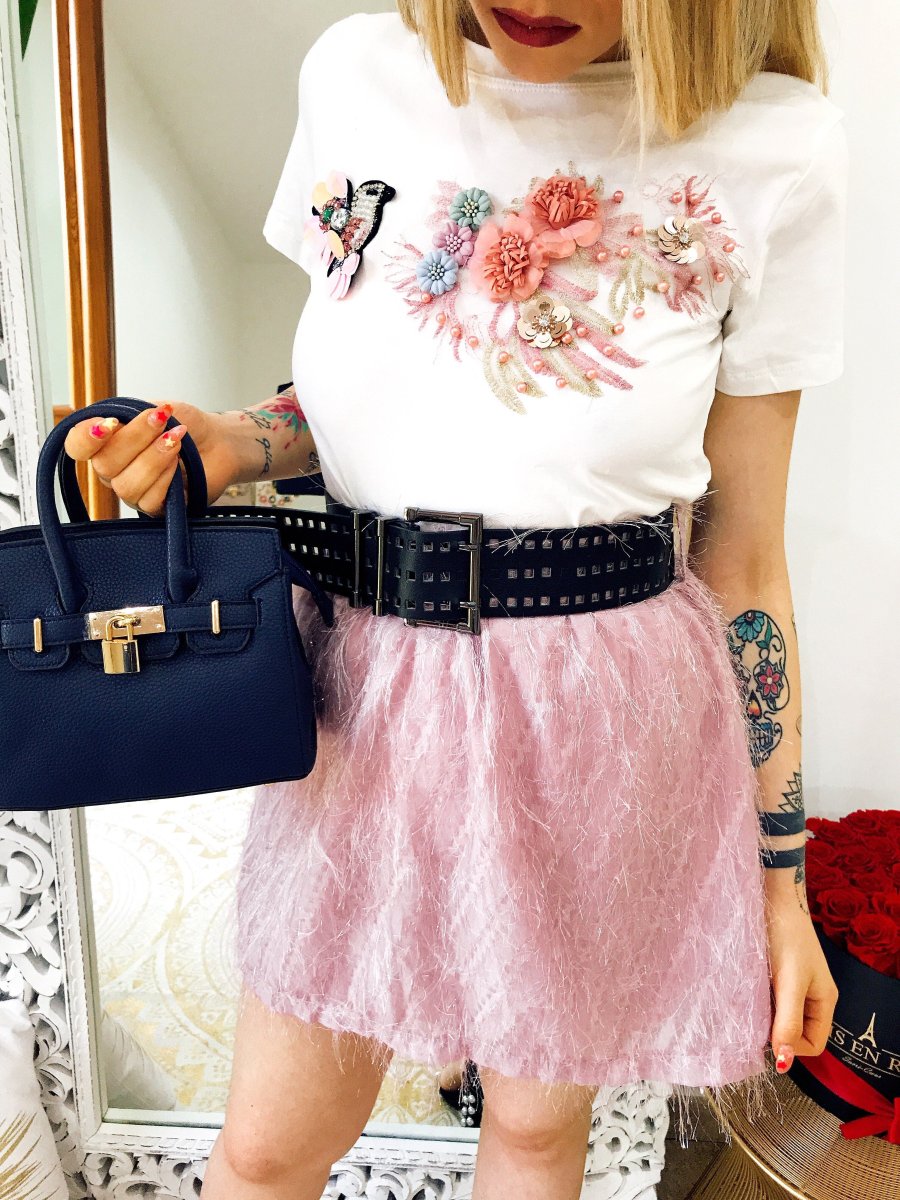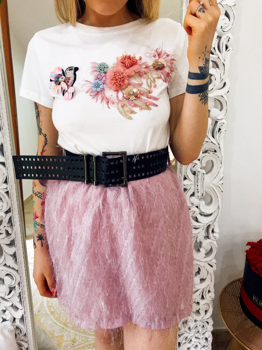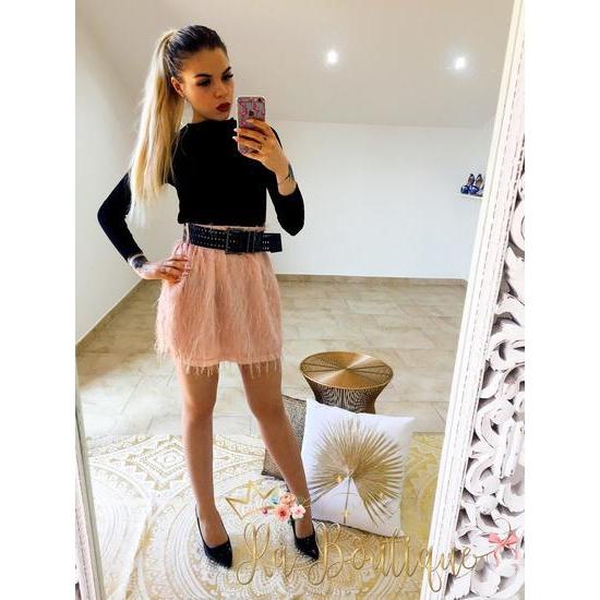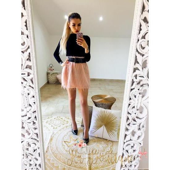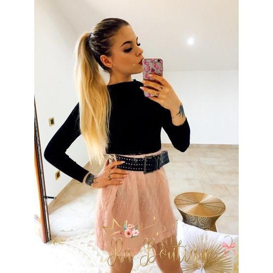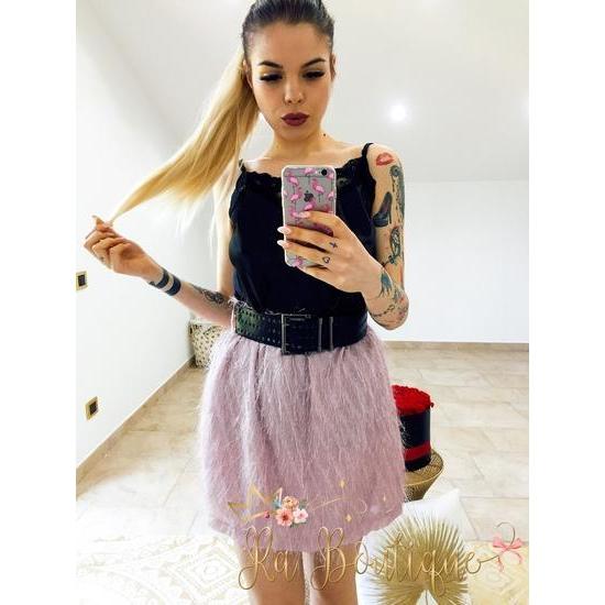 Gonna in color rosa, tessuto morbido ed elasticizzato da abbinare a tanti outfit diversi, scegli tu il tuo. Noi abbiamo messo il maglioncino easy nero.