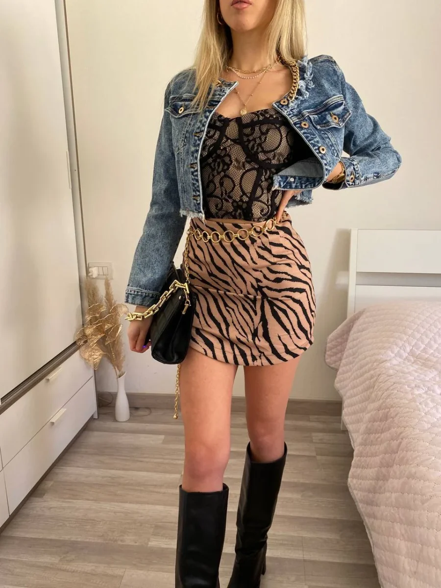 Gonna aderente in tessuto elasticizzato con trama zebrata a contrasto. Bottoncini in dettaglio